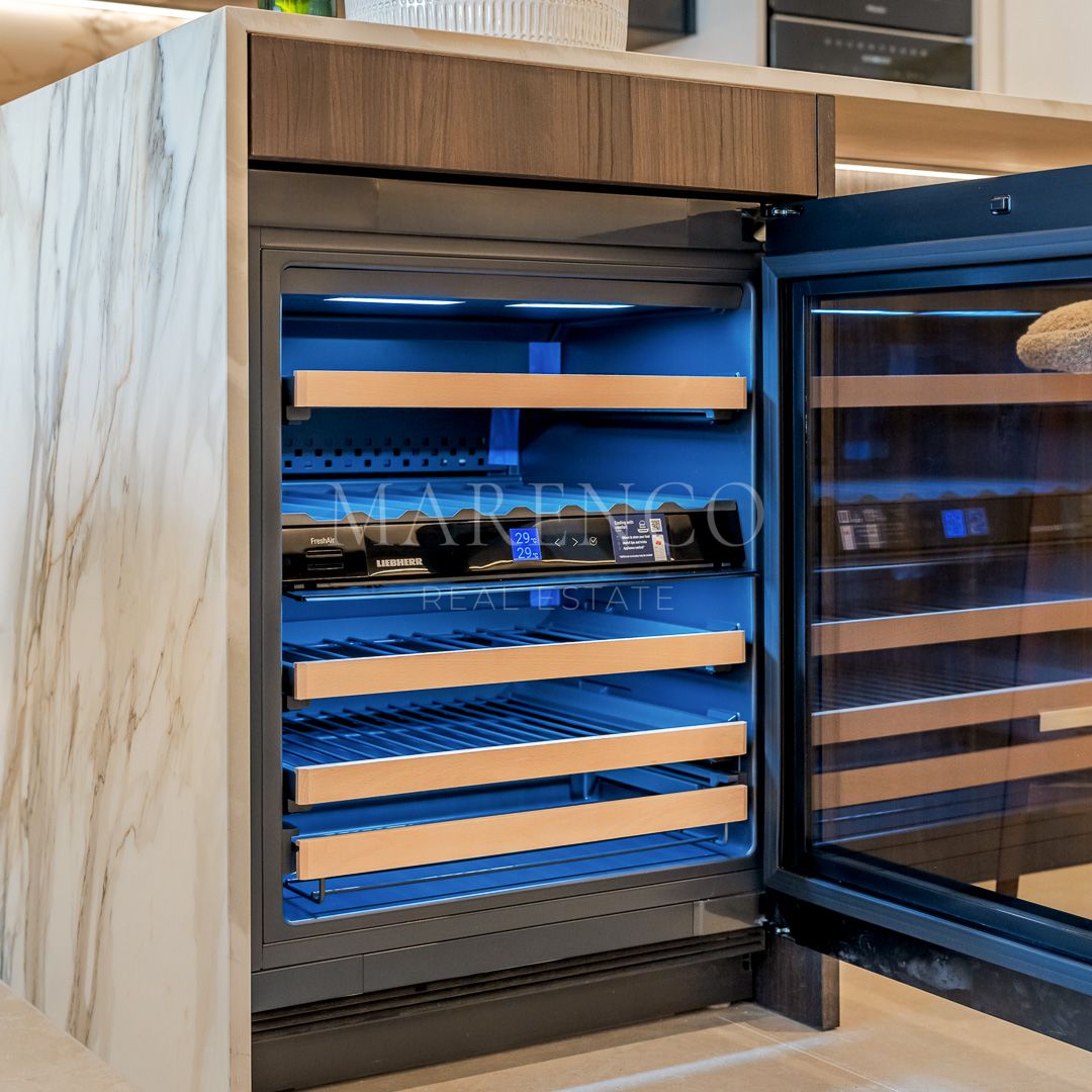 Entre sus características destacan un sistema de sonido Bang & Olufsen, vinoteca, placa invisible, suelo radiante y un espacio de lavandería discreto. La terraza acristalada funciona como invernadero, extendiendo el salón al exterior y ofreciendo vistas al mar durante todo el año.