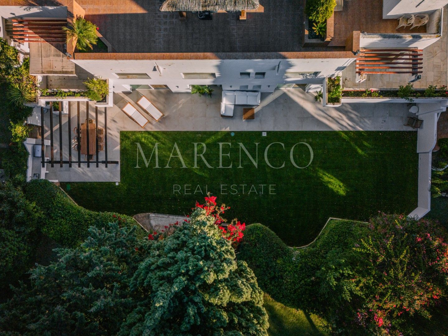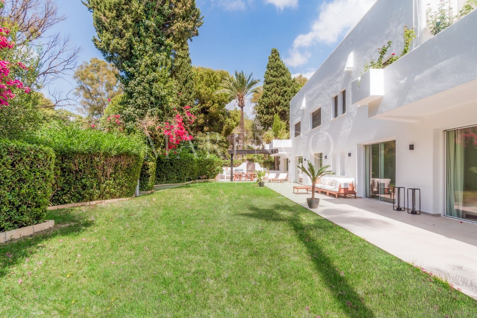 Tres de los dormitorios tienen acceso directo al jardín, reforzando la conexión con el exterior. El patio al aire libre está equipado con una cocina exterior y una pérgola, rodeado de un extenso césped poco común en un apartamento, brindando una sensación similar a la de una villa.