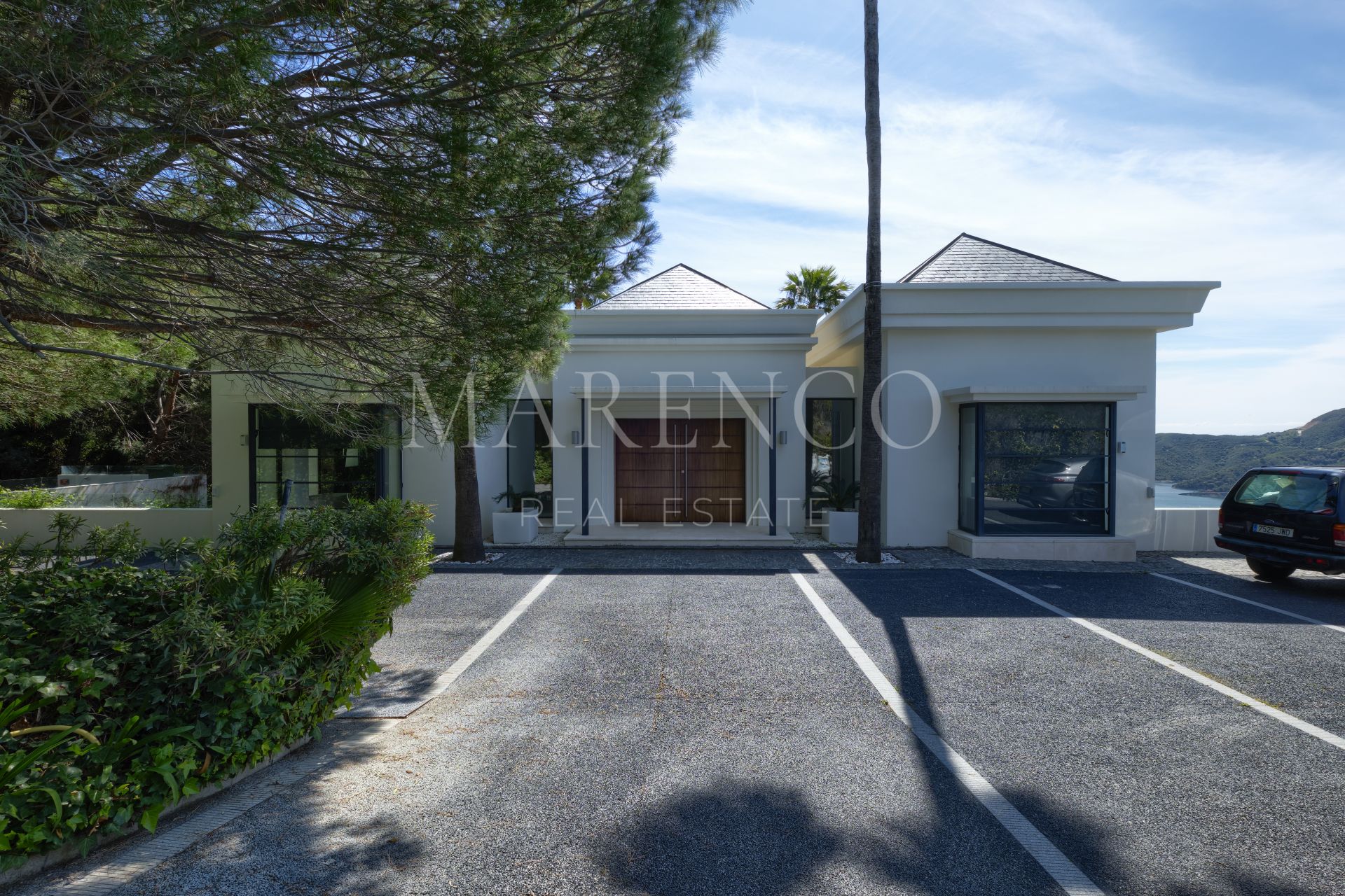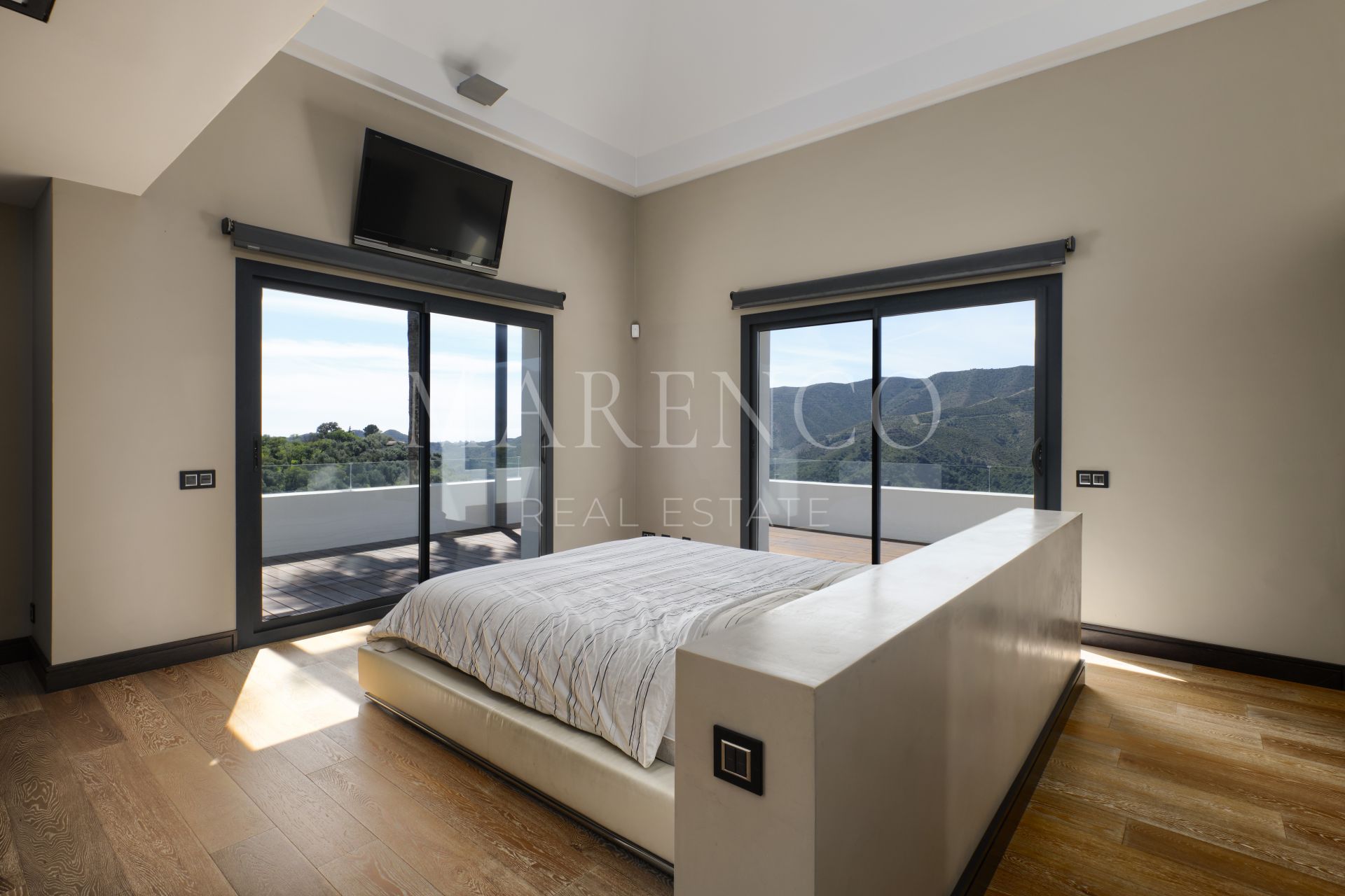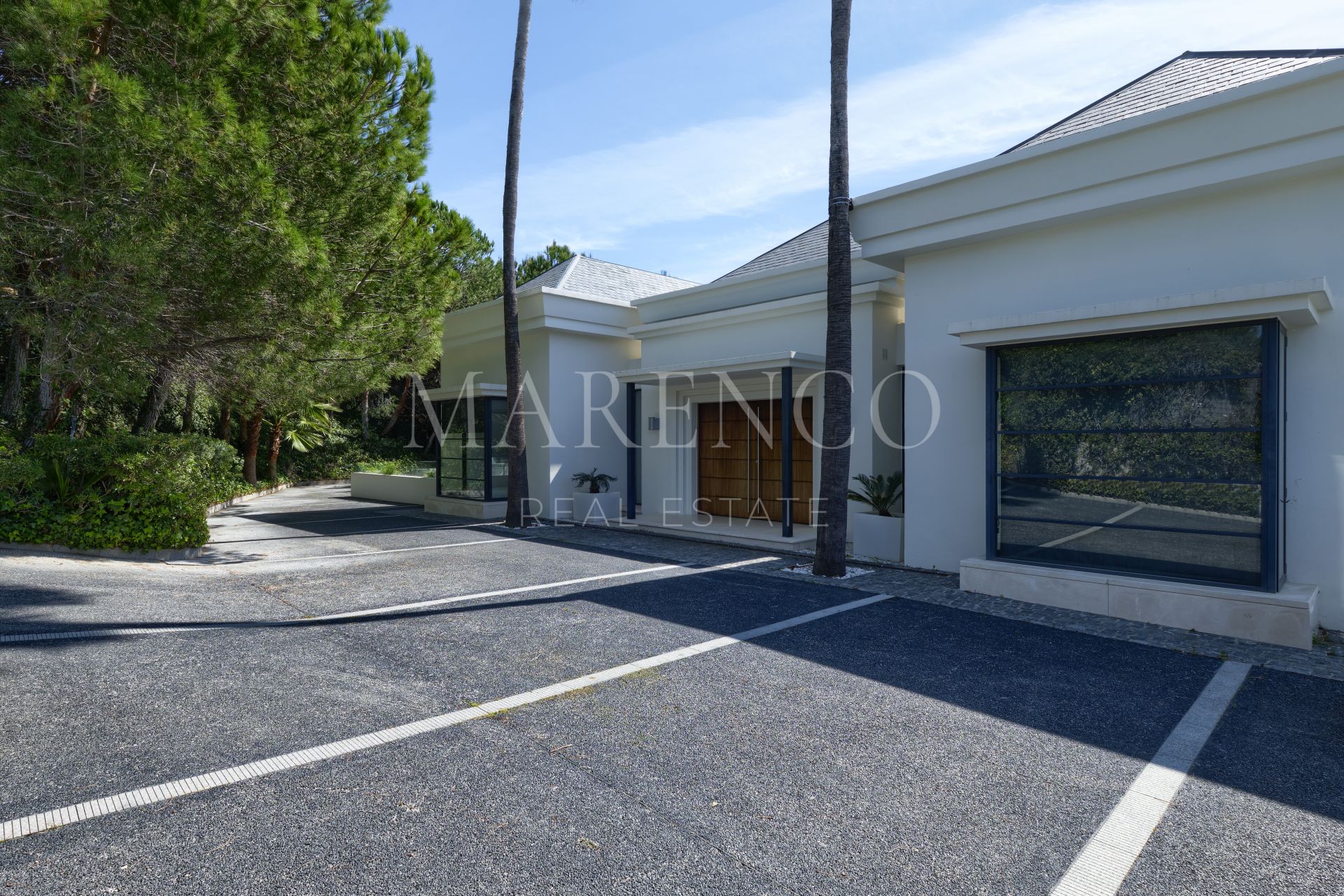 En la planta principal: área de estar y comedor de generosas dimensiones con una chimenea de gas que conlleva a las grandes terrazas de bambú prensado y con vistas panorámicas. Cocina moderna de planta abierta totalmente equipada con electrodomésticos Gaggenau, aseo de invitados y un dormitorio en suite. En la planta superior: recibidor luminoso, gran dormitorio en suite principal con vestidor y despacho, y otro dormitorio en suite. En el nivel inferior: dos dormitorios más en suite, sala de cine, bodega, trastero y gimnasio. Aparcamiento exterior con posibilidad de cochera para dos o tres coches.