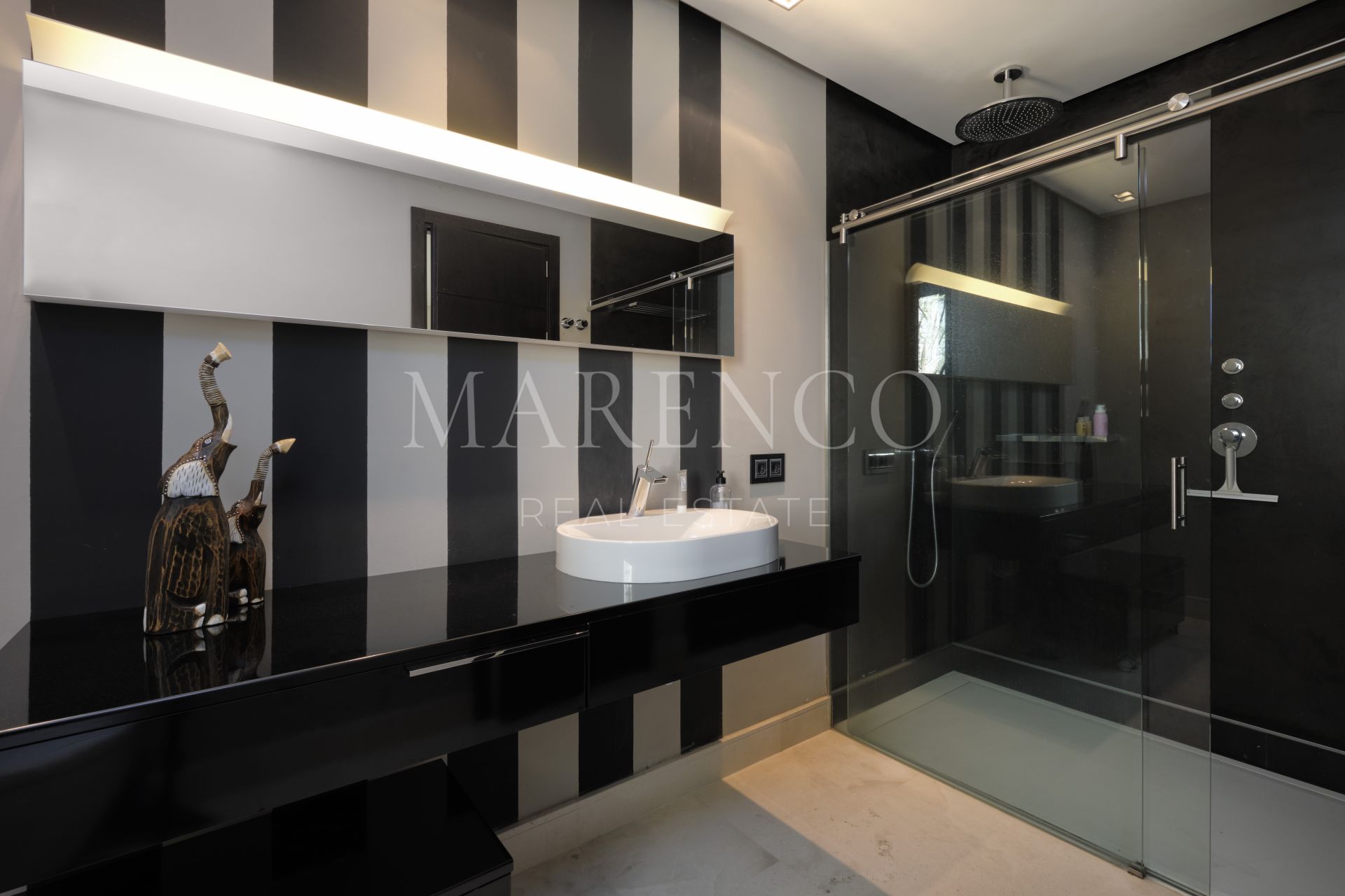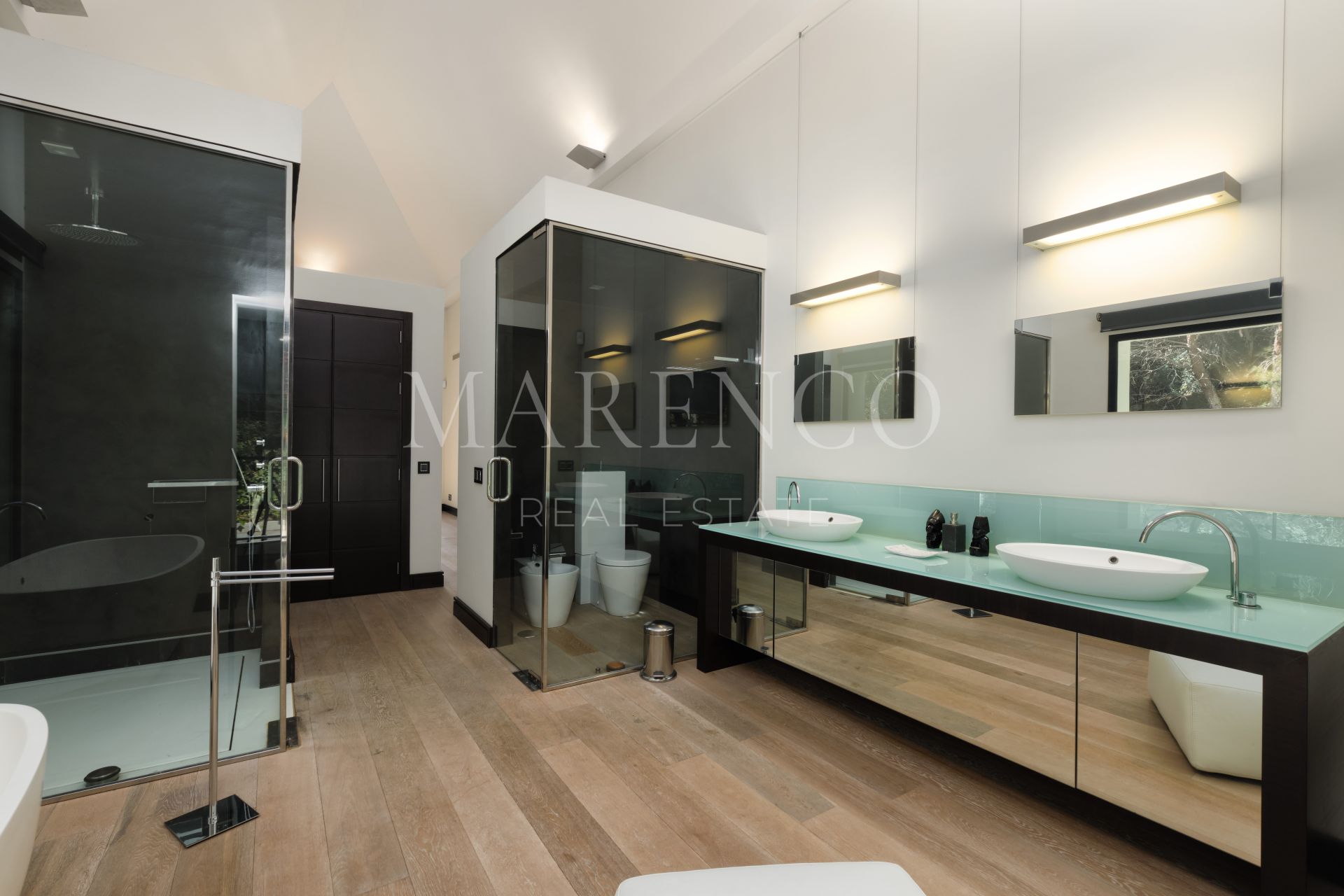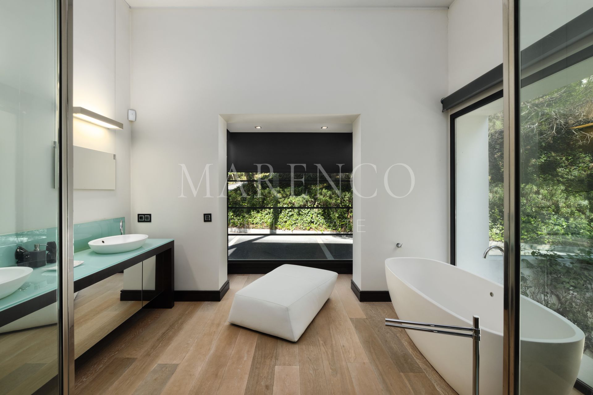 En la planta principal: área de estar y comedor de generosas dimensiones con una chimenea de gas que conlleva a las grandes terrazas de bambú prensado y con vistas panorámicas. Cocina moderna de planta abierta totalmente equipada con electrodomésticos Gaggenau, aseo de invitados y un dormitorio en suite. En la planta superior: recibidor luminoso, gran dormitorio en suite principal con vestidor y despacho, y otro dormitorio en suite. En el nivel inferior: dos dormitorios más en suite, sala de cine, bodega, trastero y gimnasio. Aparcamiento exterior con posibilidad de cochera para dos o tres coches.