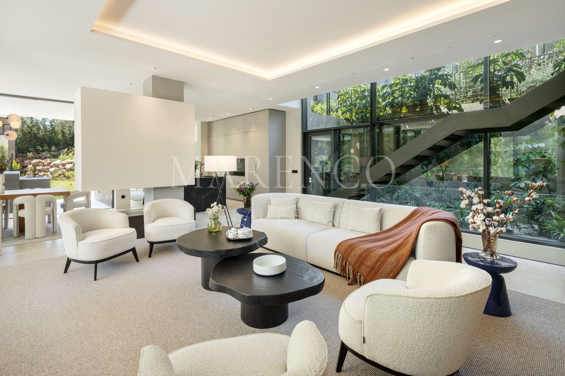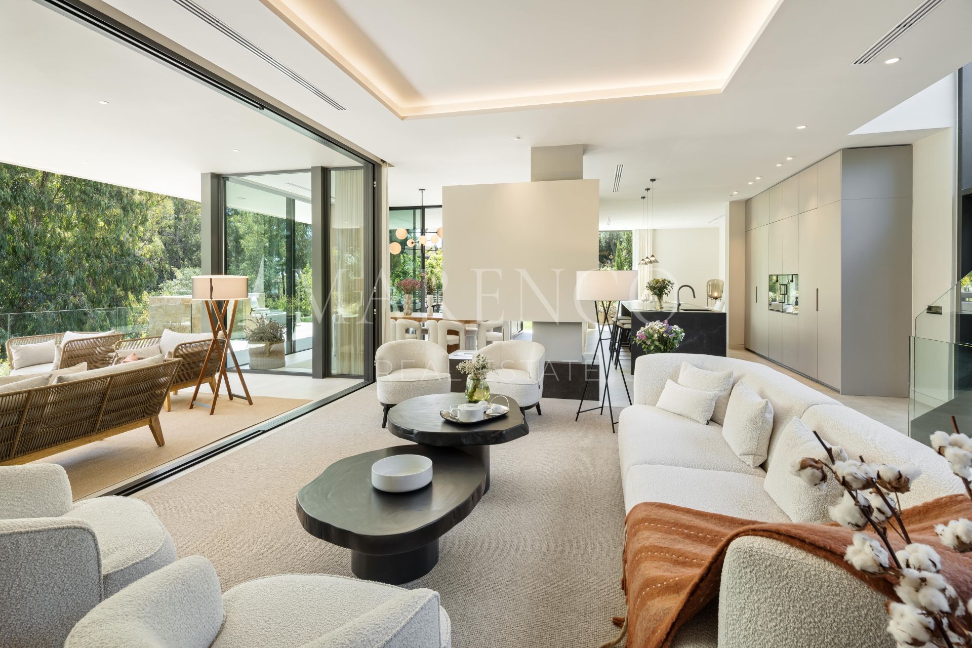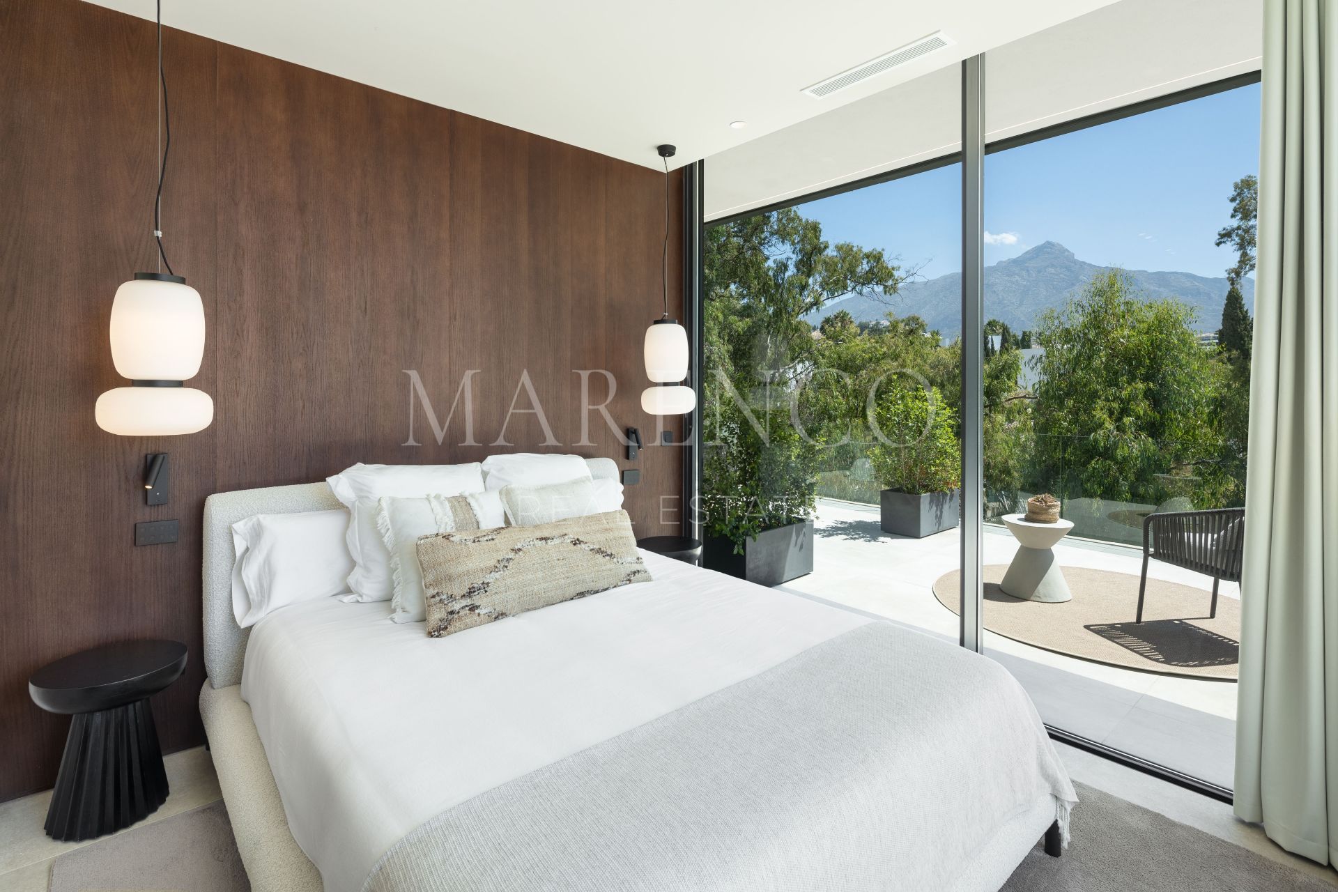 La villa también incorpora tecnología de forma discreta, con preinstalaciones para motorización de cortinas y varias opciones de ubicación para televisores en las zonas de ocio designadas.