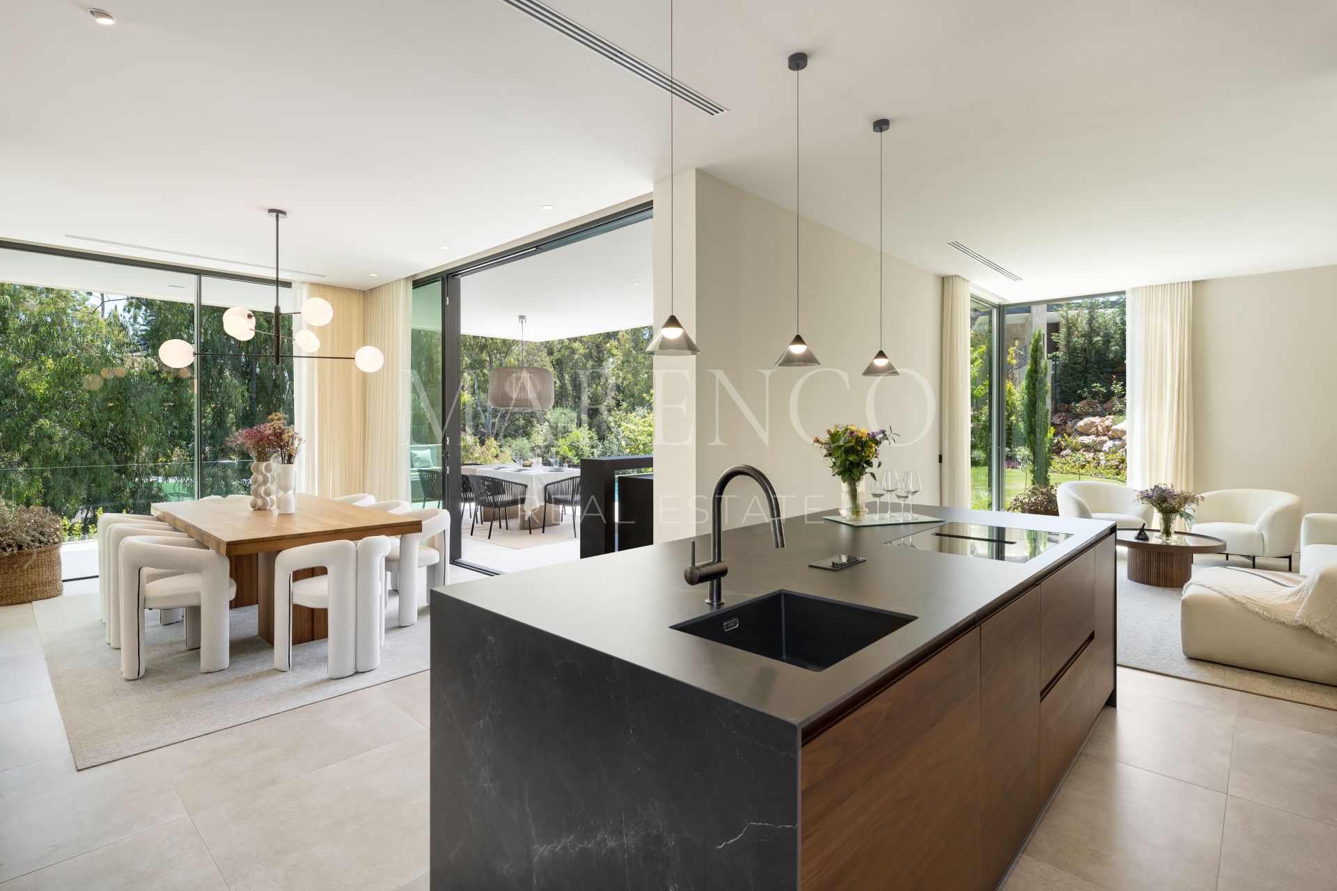 La planta baja incluye un salón, cocina de planta abierta, comedor, sala de TV/oficina y un dormitorio en suite. Esta planta se extiende sin esfuerzo hacia las terrazas, que cuentan con una cocina exterior, zona de estar, comedor al aire libre y área de piscina.