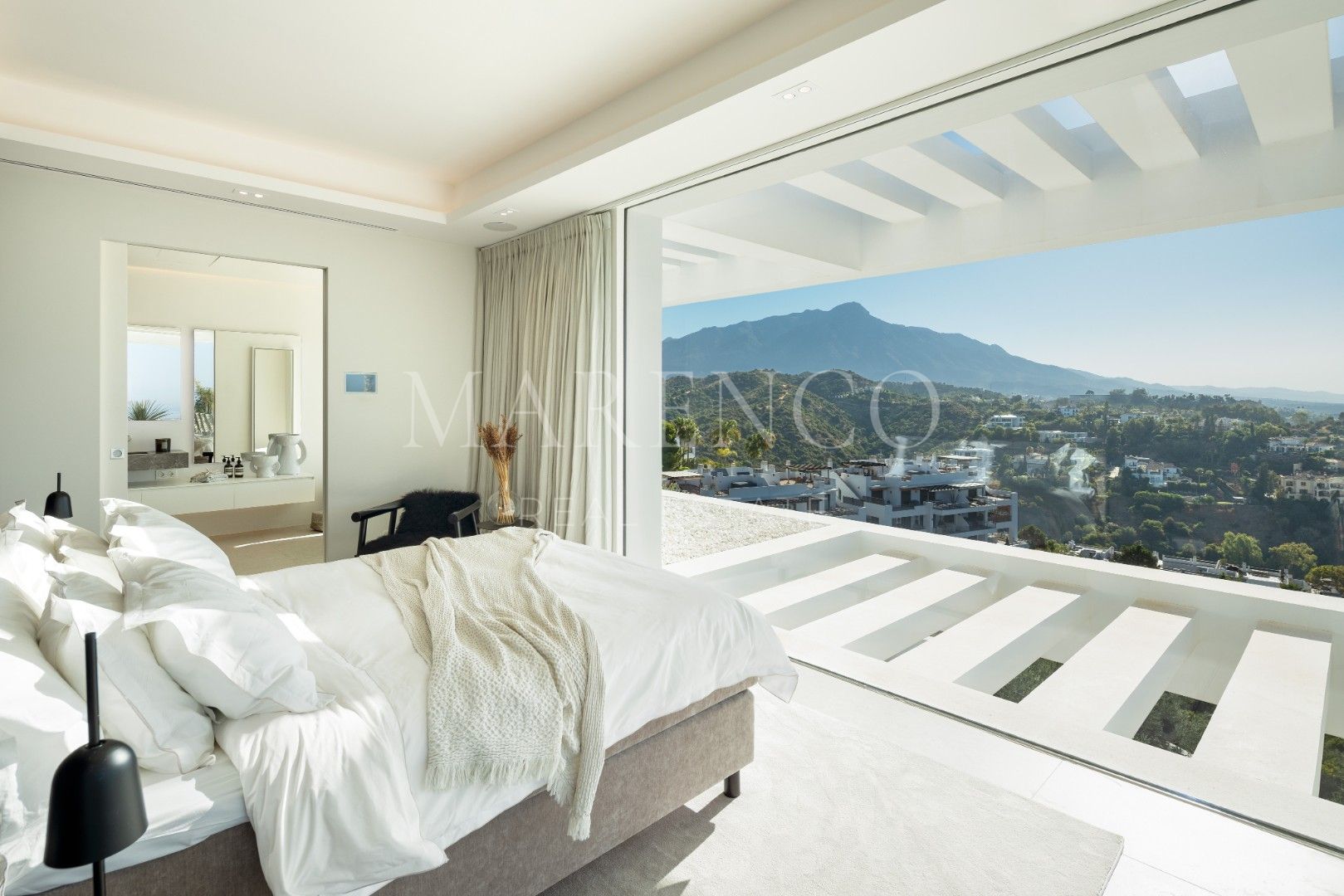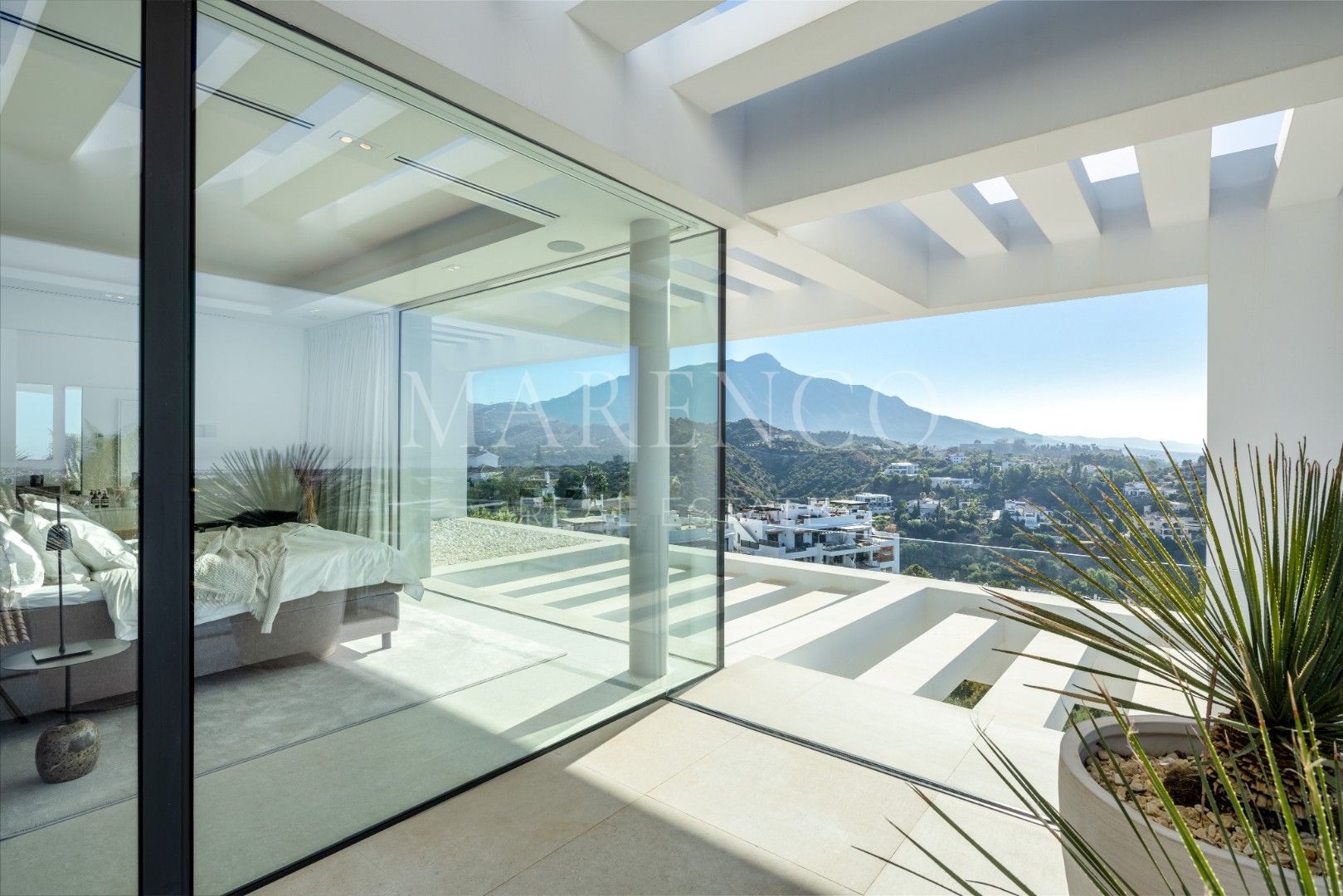 Villa Mika es una villa contemporánea ubicada en La Quinta, Benahavís. Esta impresionante propiedad de orientación sur destaca por sus vistas panorámicas que abarcan desde la imponente montaña La Concha hasta el mar Mediterráneo y Gibraltar, creando un entorno de tranquilidad tanto al amanecer como al atardecer.