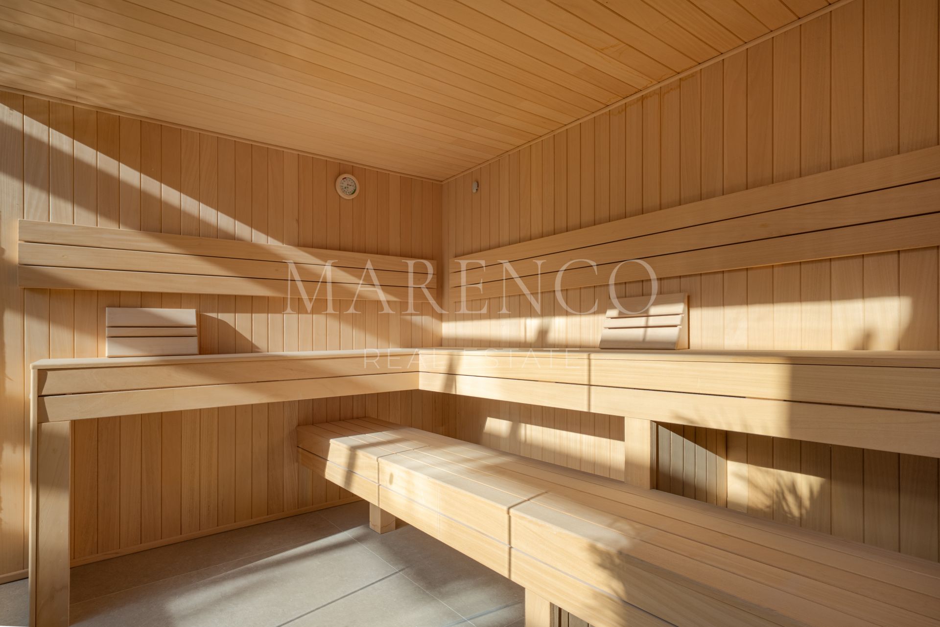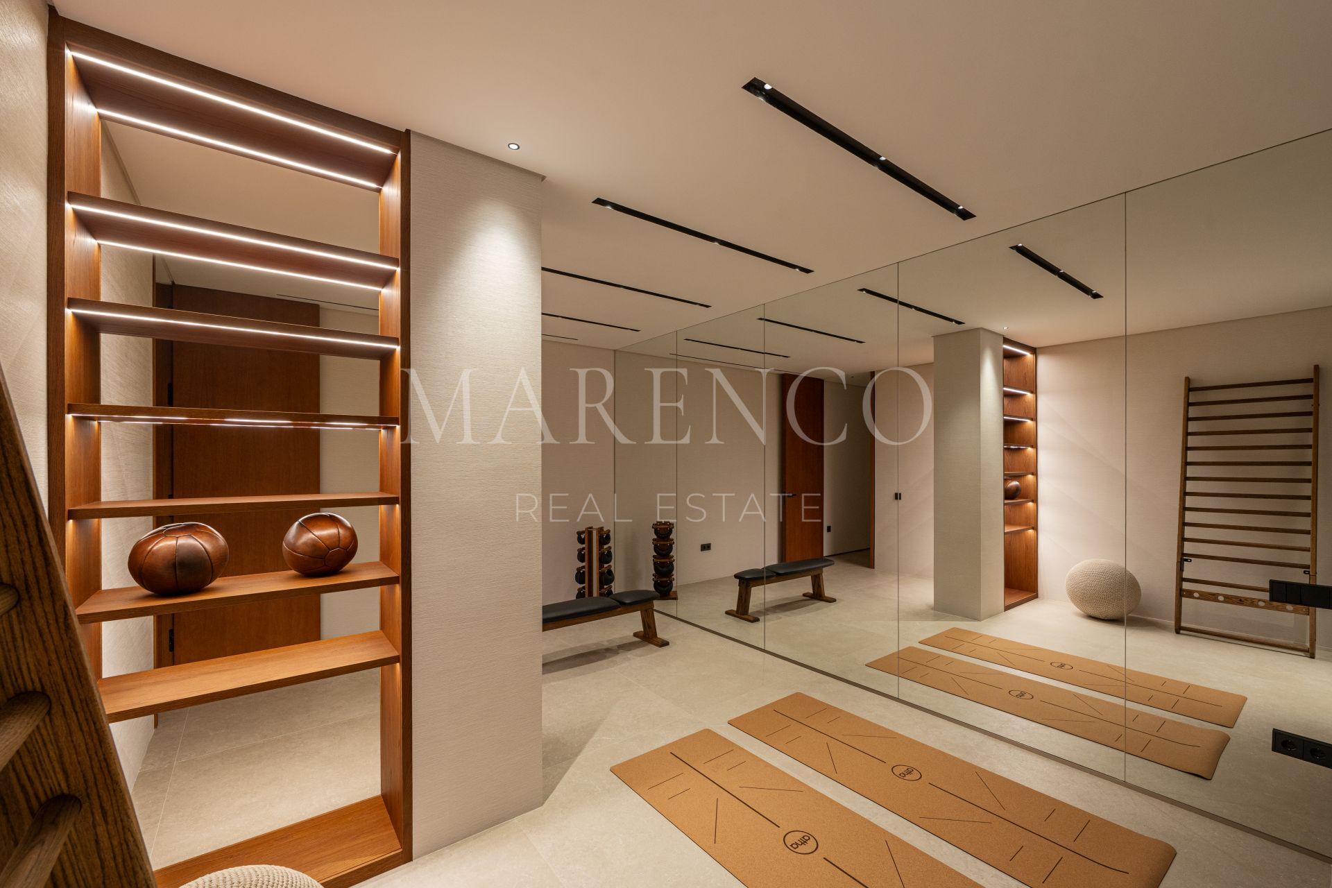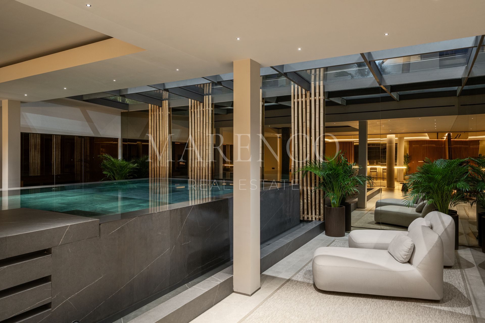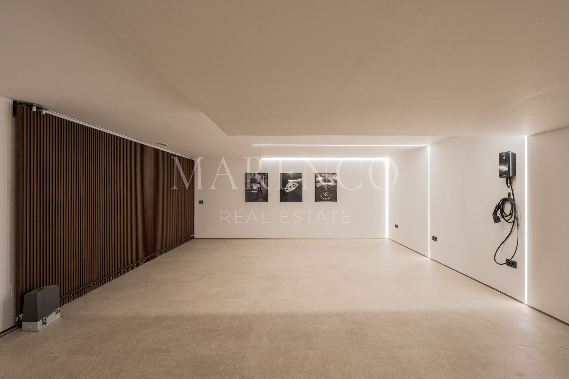 El nivel inferior está dedicado por completo al bienestar y al ocio: un spa con piscina interior, sauna, gimnasio privado, sala de entretenimiento con barra y una atmósfera sofisticada que convierte esta planta en un auténtico refugio de desconexión. Un garaje privado con punto de carga para vehículos eléctricos completa las prestaciones de esta propiedad exclusiva, todo ello dentro de un entorno seguro y con acceso controlado.