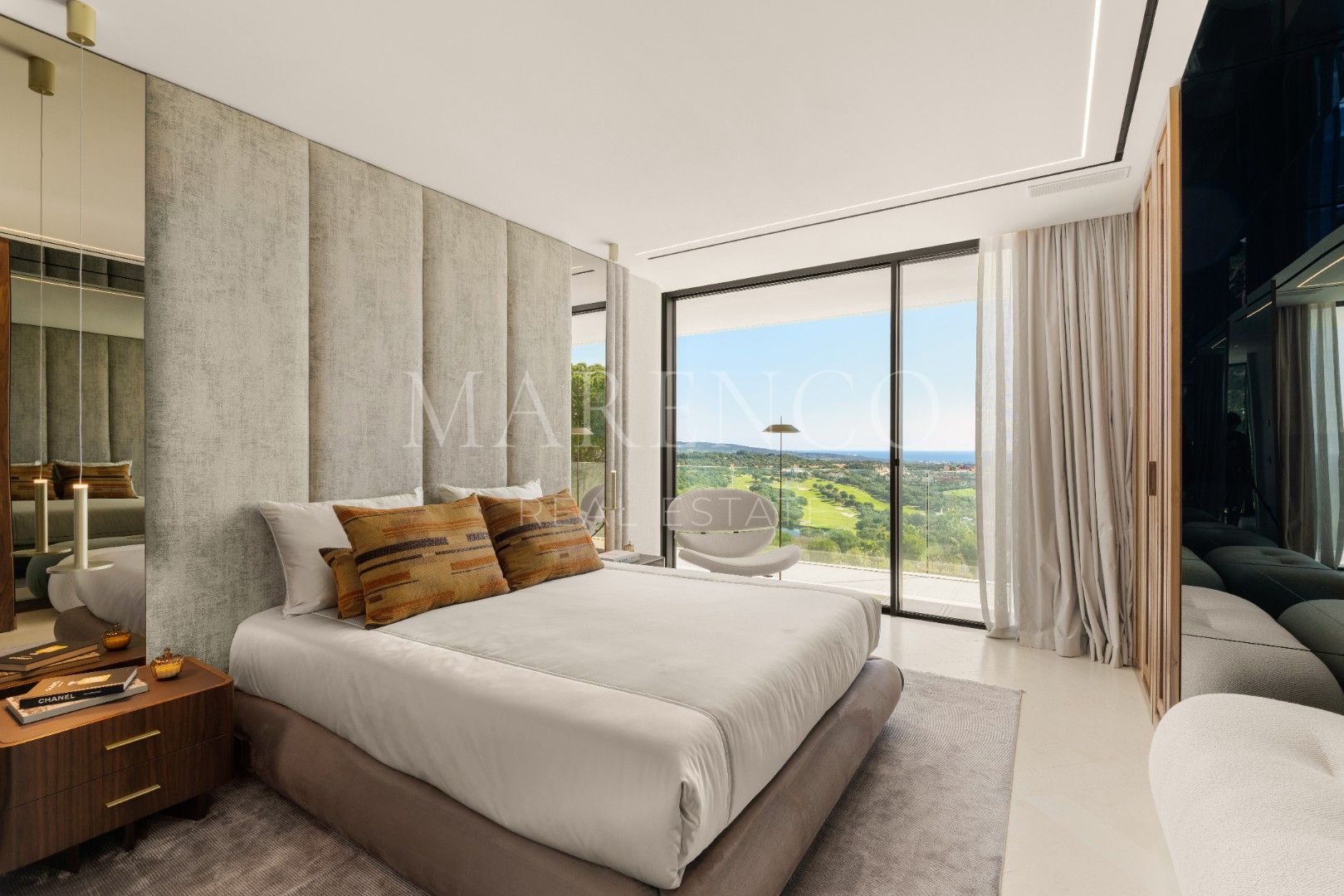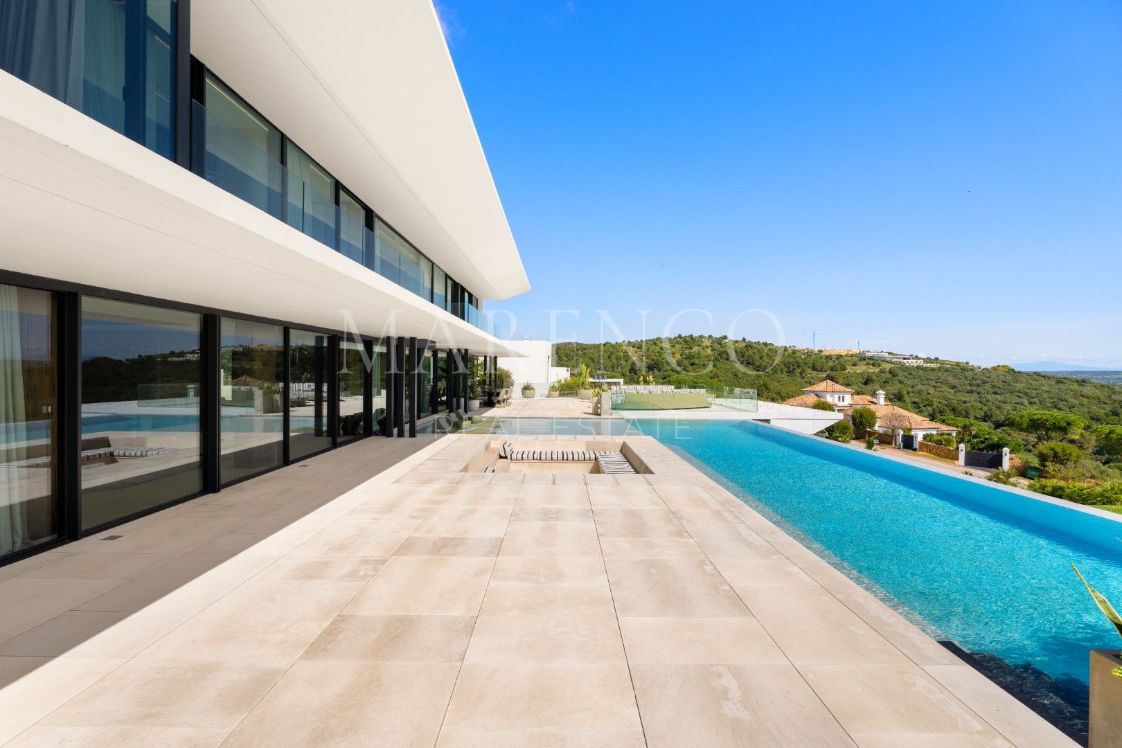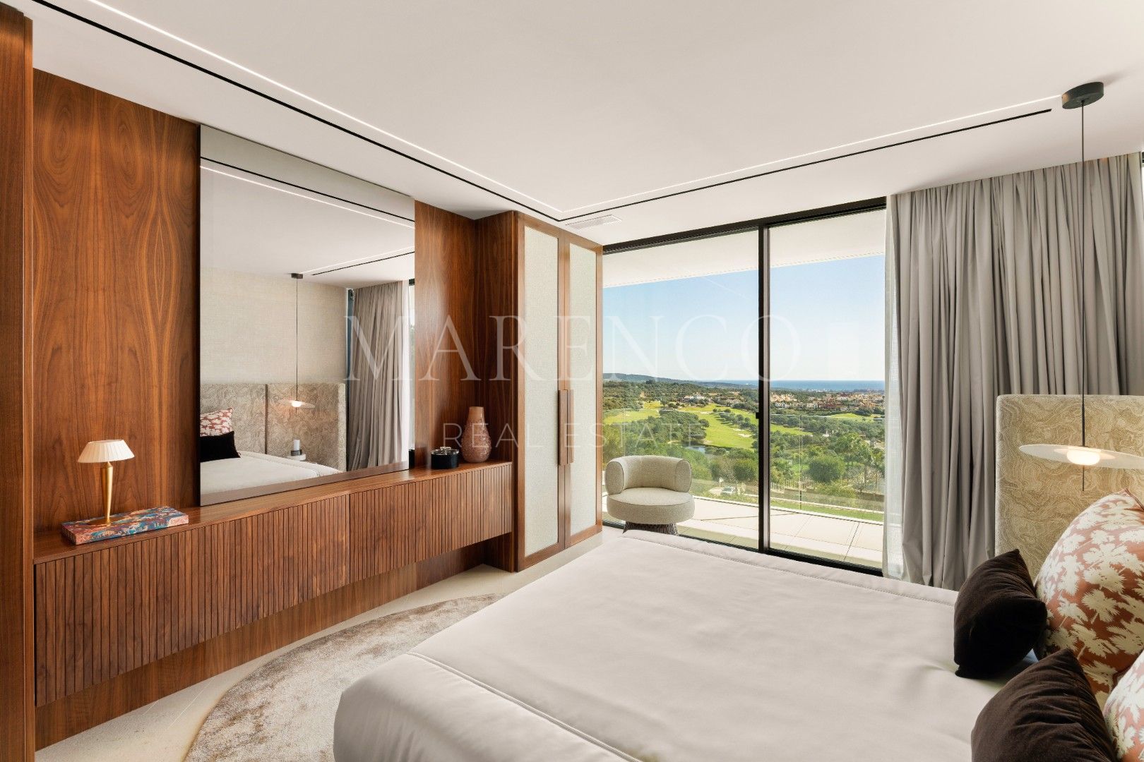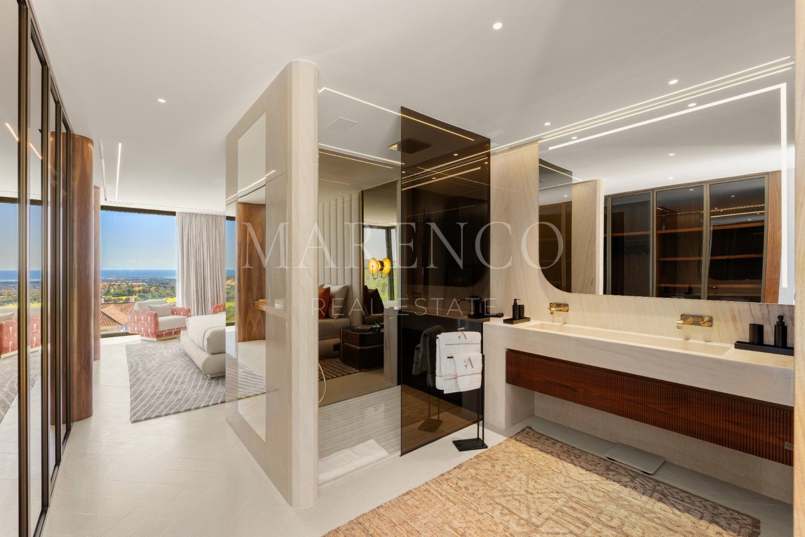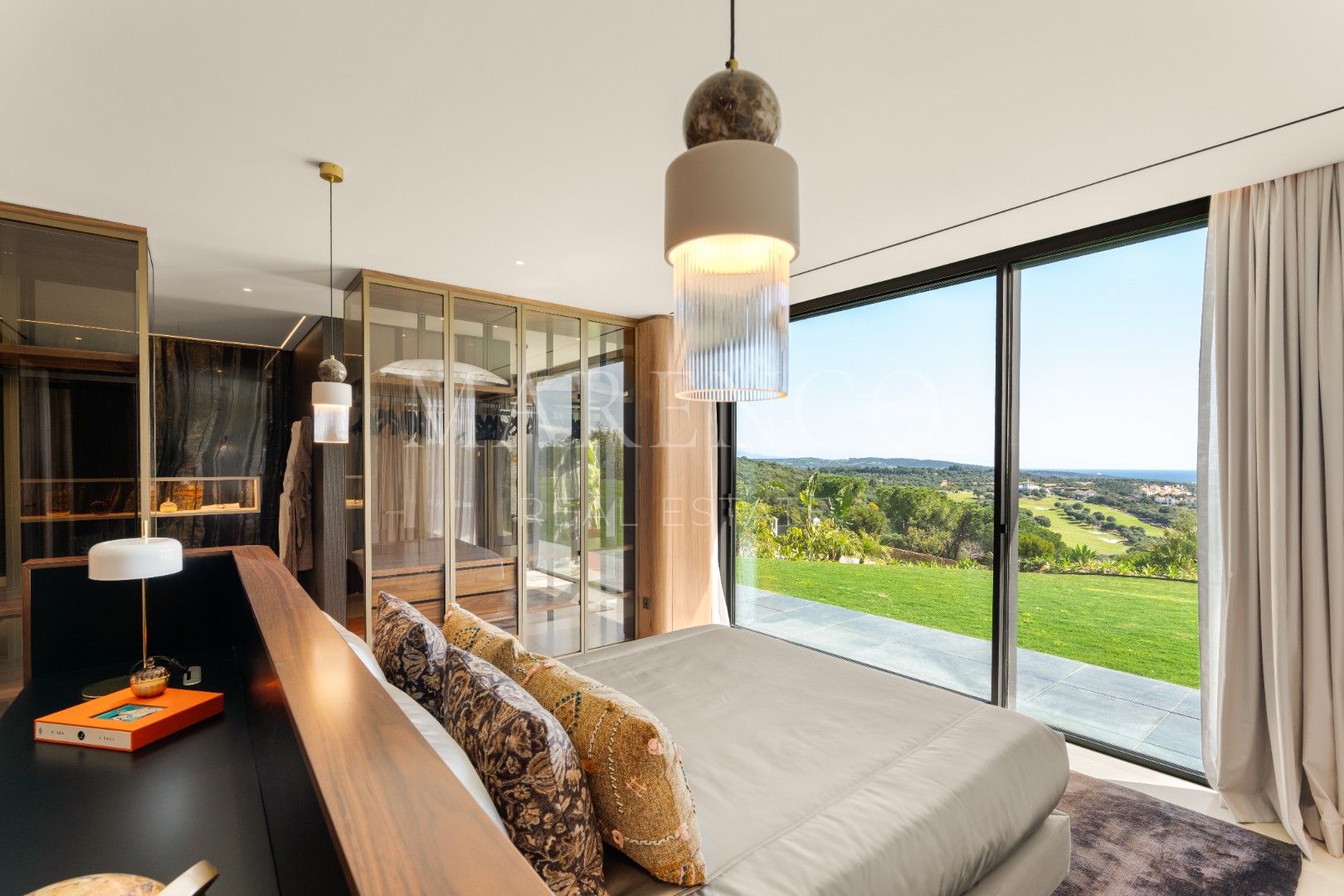La villa está distribuida en amplios espacios que incluyen seis dormitorios, todos con baño en suite, y dos aseos para invitados. Cada rincón ha sido diseñado con líneas arquitectónicas limpias y ventanales de altura completa, que permiten que la luz natural inunde los interiores. Los materiales de primera calidad y los elementos personalizados crean un ambiente sofisticado y acogedor, mientras que las áreas de estar se conectan directamente con las terrazas, estableciendo una transición fluida entre el interior y el exterior.