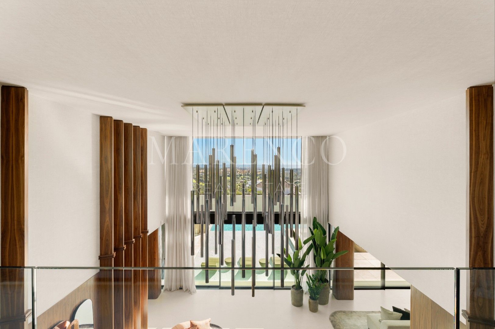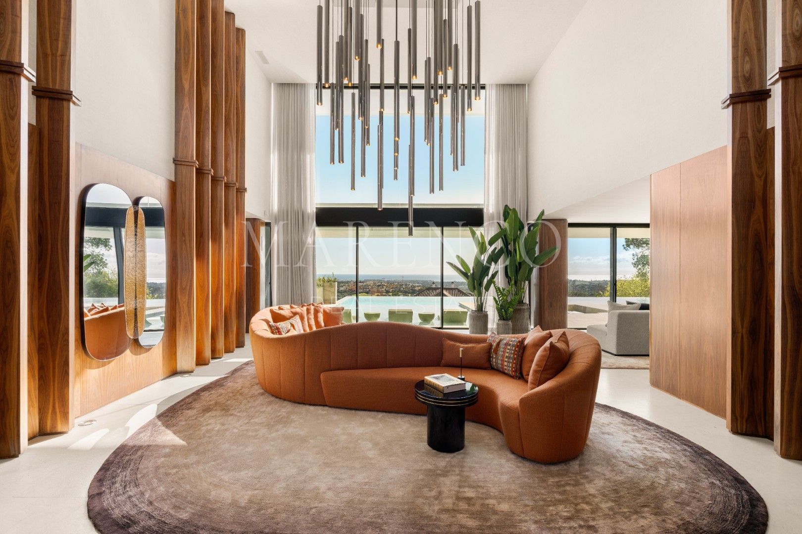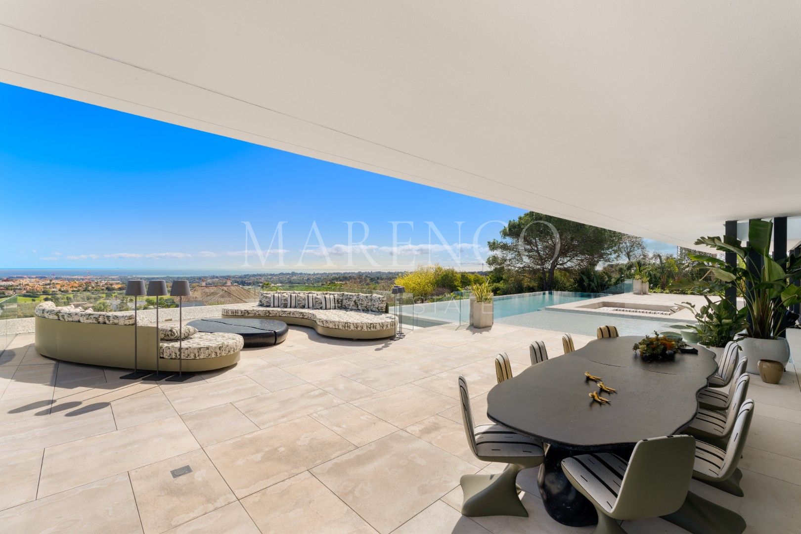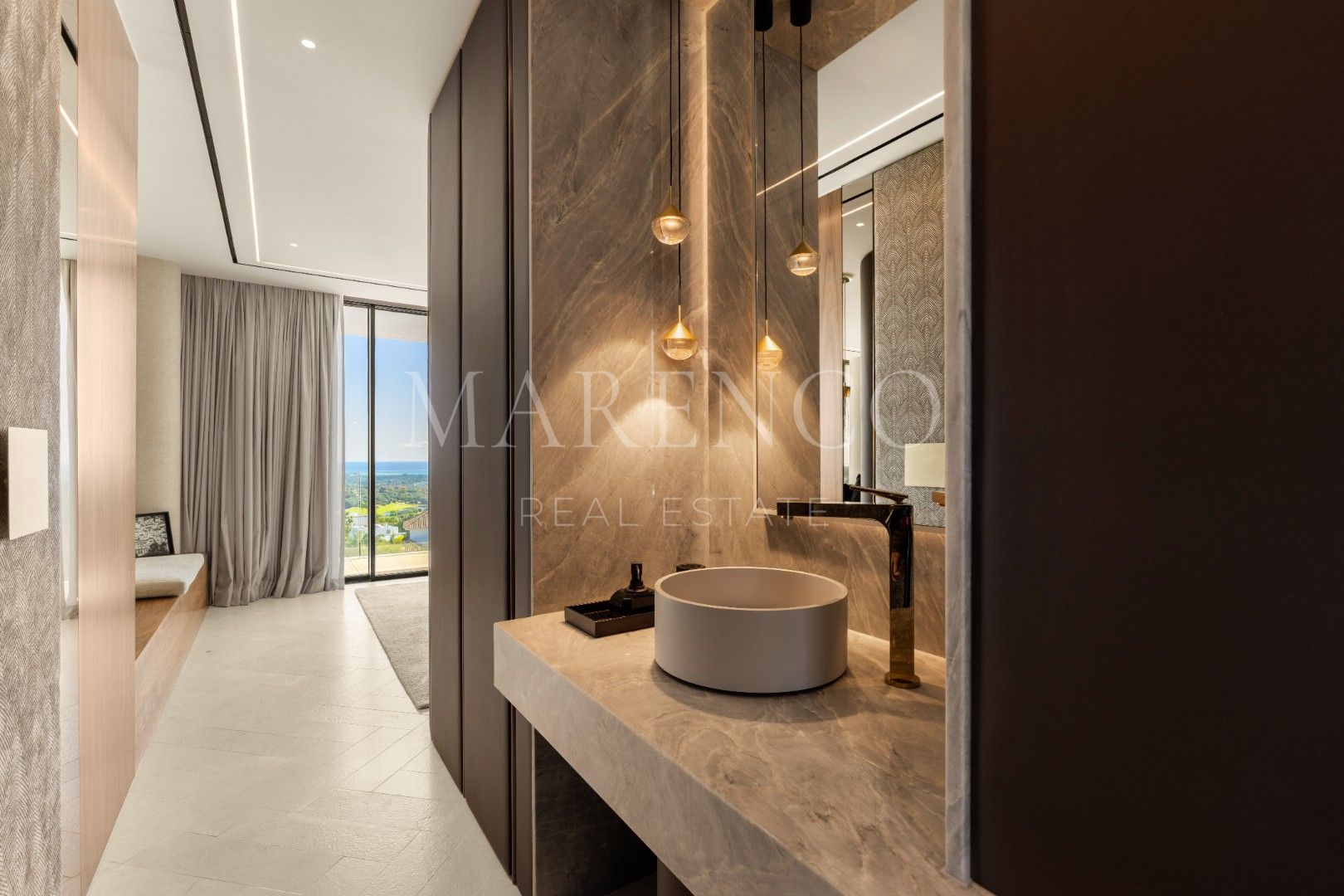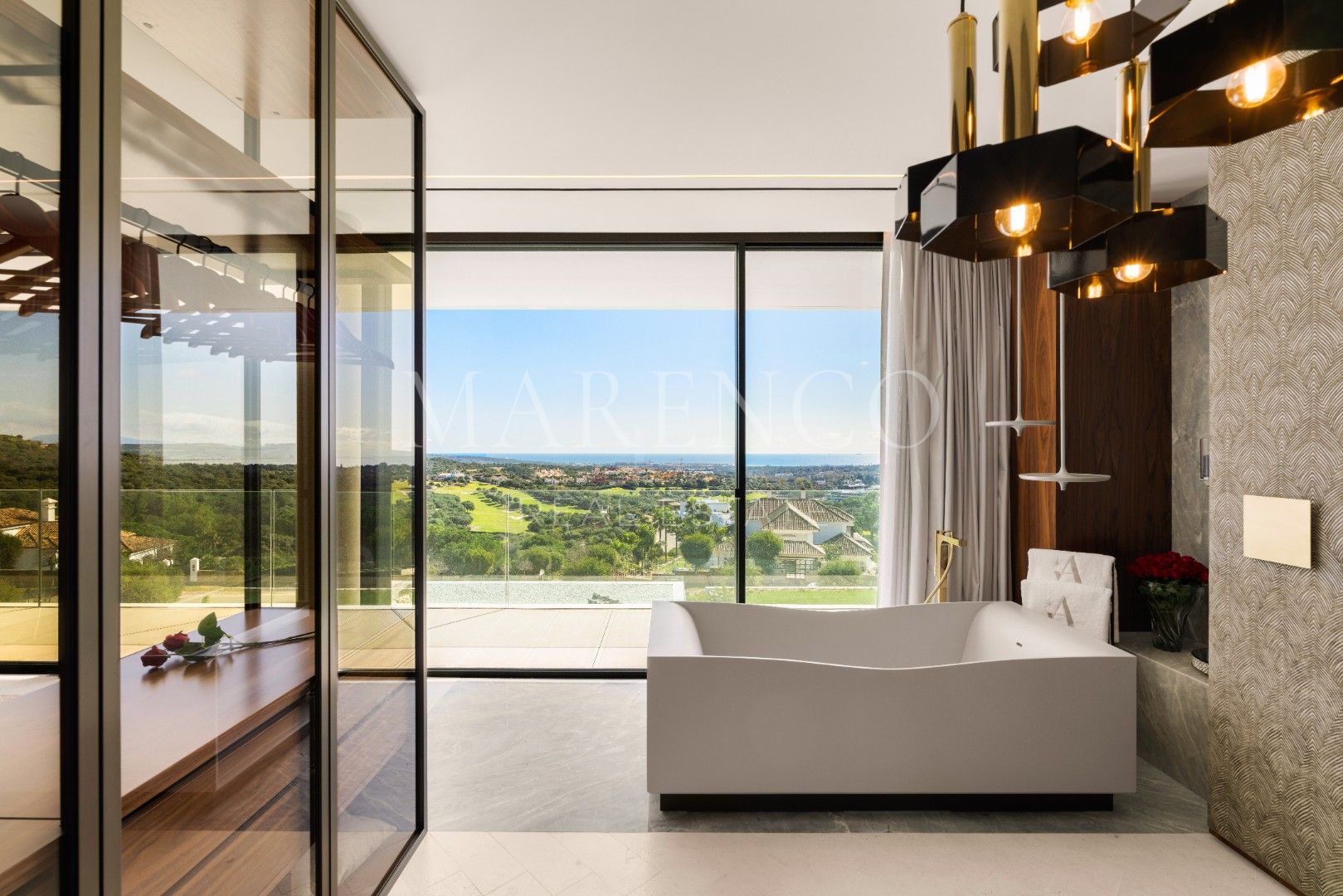 La villa está distribuida en amplios espacios que incluyen seis dormitorios, todos con baño en suite, y dos aseos para invitados. Cada rincón ha sido diseñado con líneas arquitectónicas limpias y ventanales de altura completa, que permiten que la luz natural inunde los interiores. Los materiales de primera calidad y los elementos personalizados crean un ambiente sofisticado y acogedor, mientras que las áreas de estar se conectan directamente con las terrazas, estableciendo una transición fluida entre el interior y el exterior.
