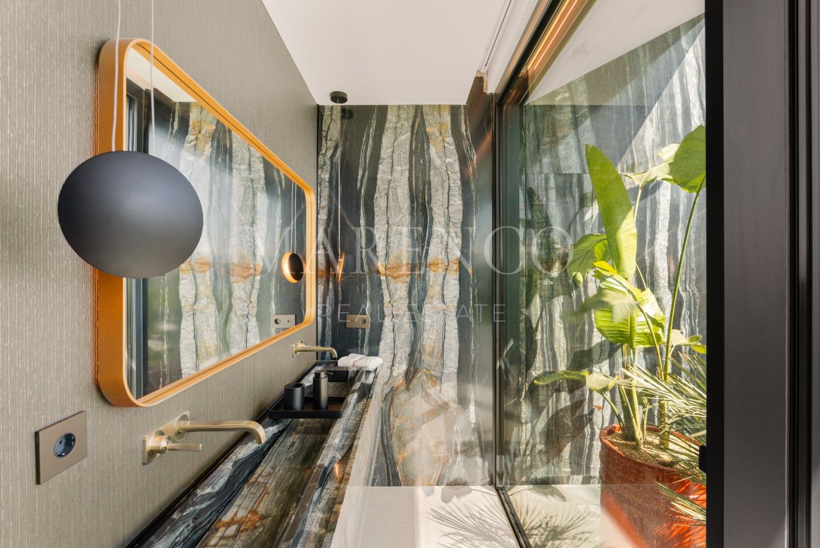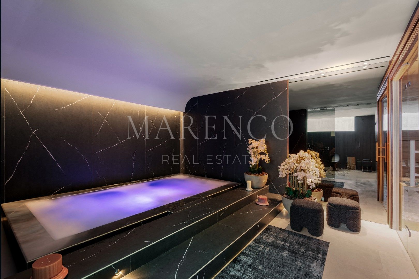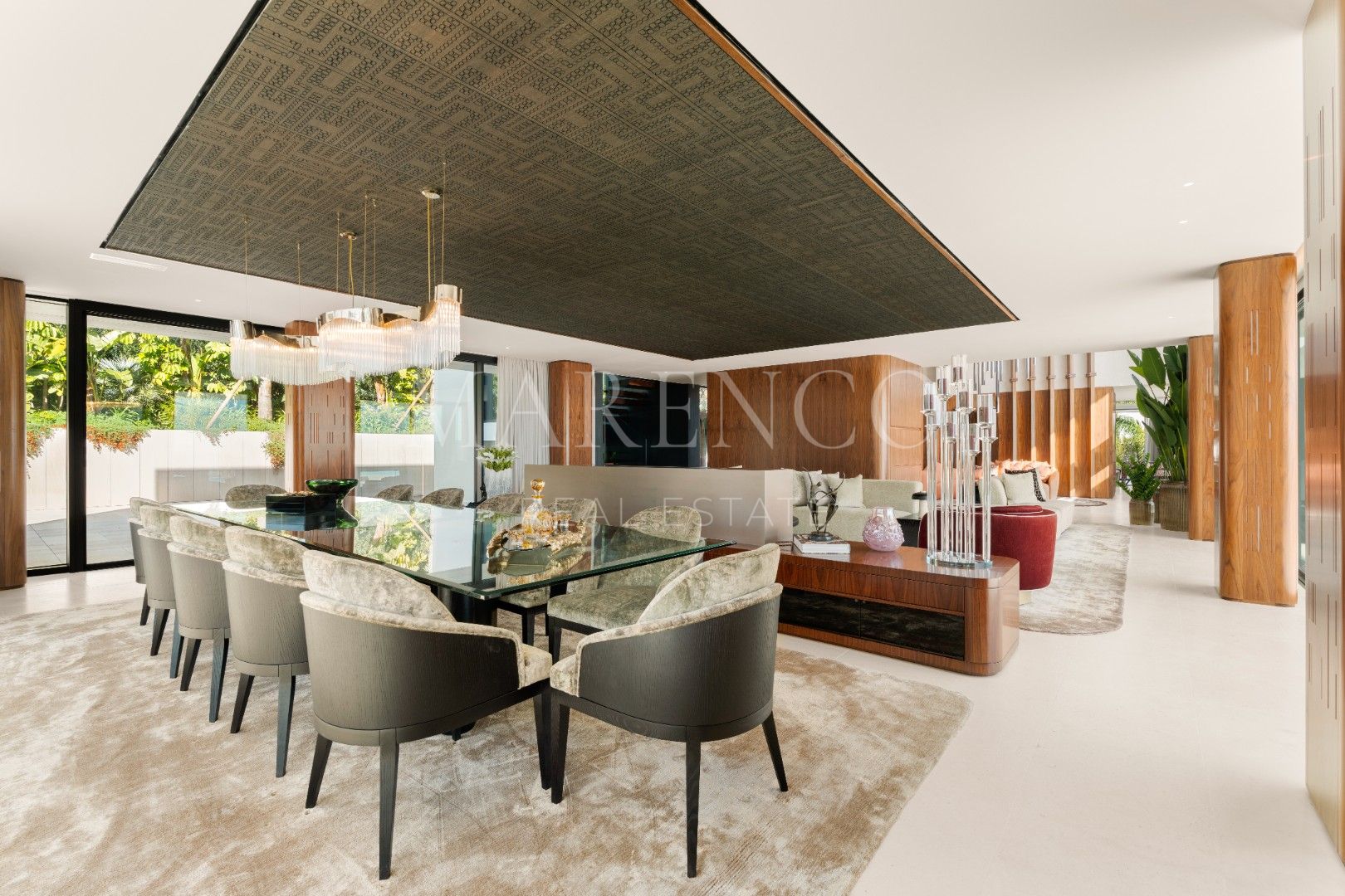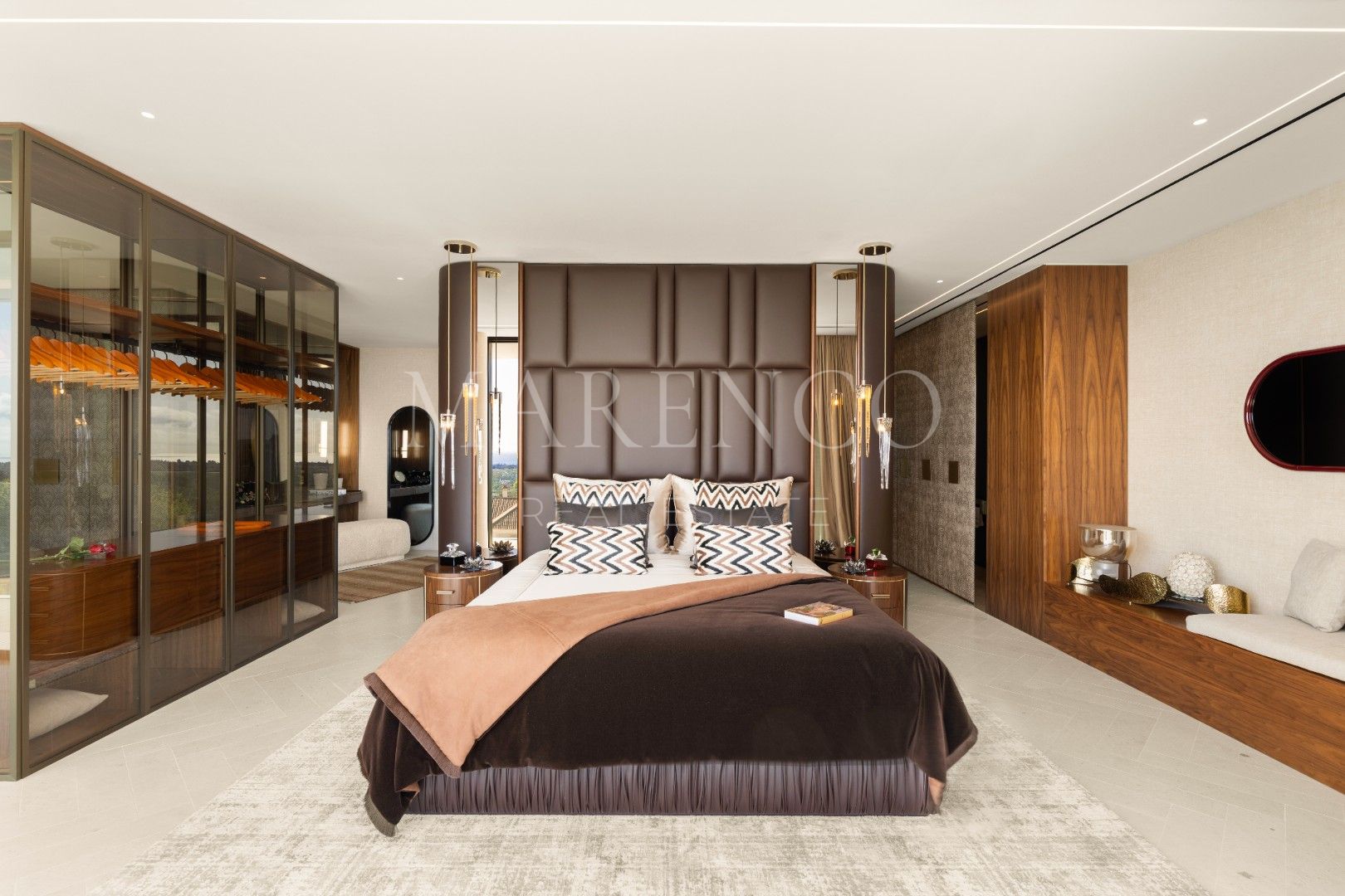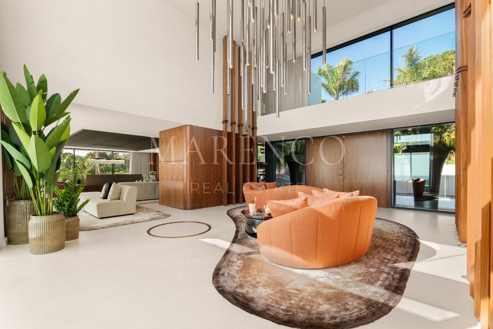 La villa está distribuida en amplios espacios que incluyen seis dormitorios, todos con baño en suite, y dos aseos para invitados. Cada rincón ha sido diseñado con líneas arquitectónicas limpias y ventanales de altura completa, que permiten que la luz natural inunde los interiores. Los materiales de primera calidad y los elementos personalizados crean un ambiente sofisticado y acogedor, mientras que las áreas de estar se conectan directamente con las terrazas, estableciendo una transición fluida entre el interior y el exterior.
