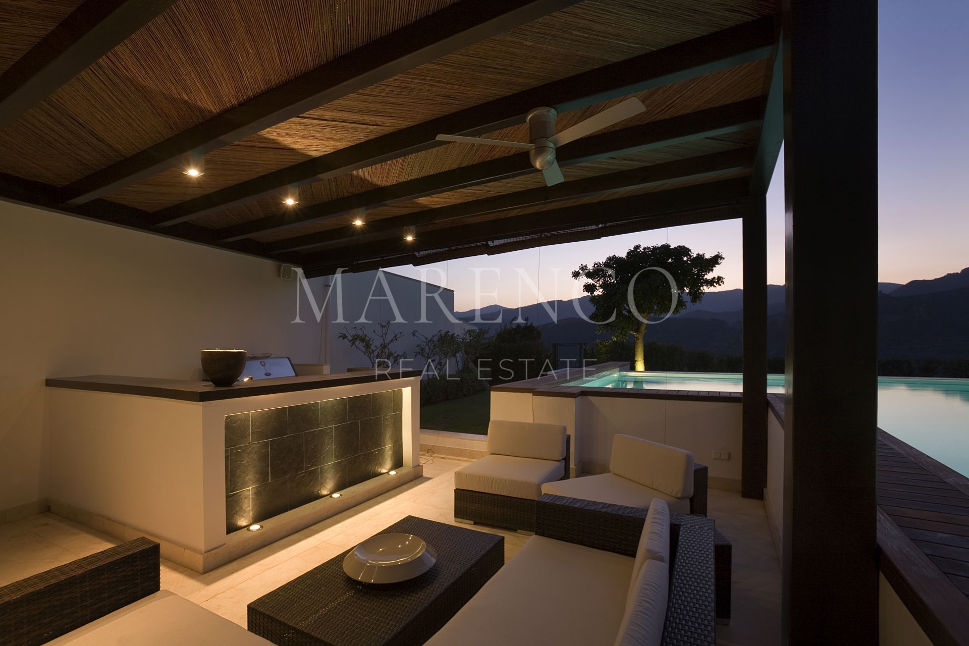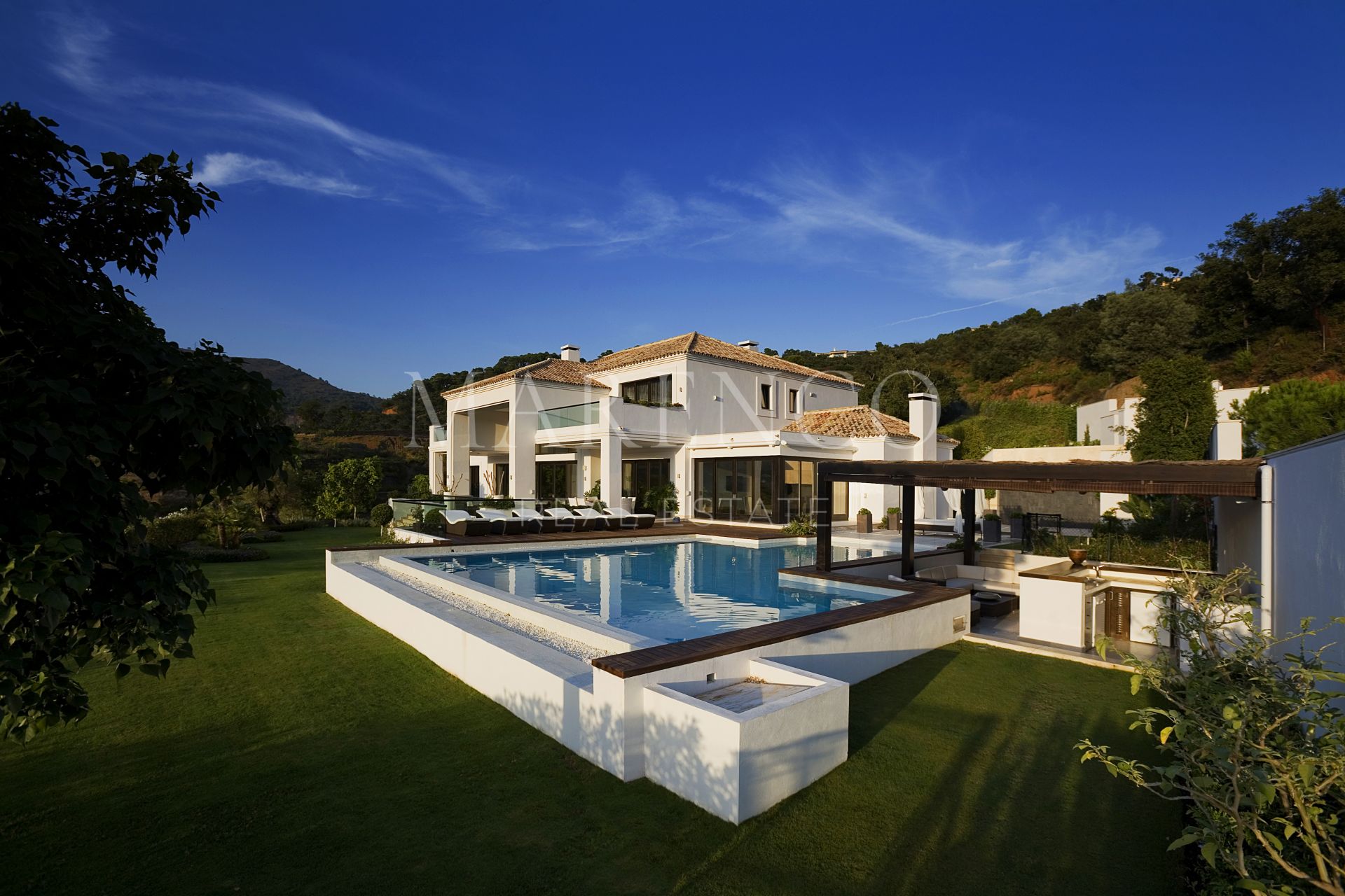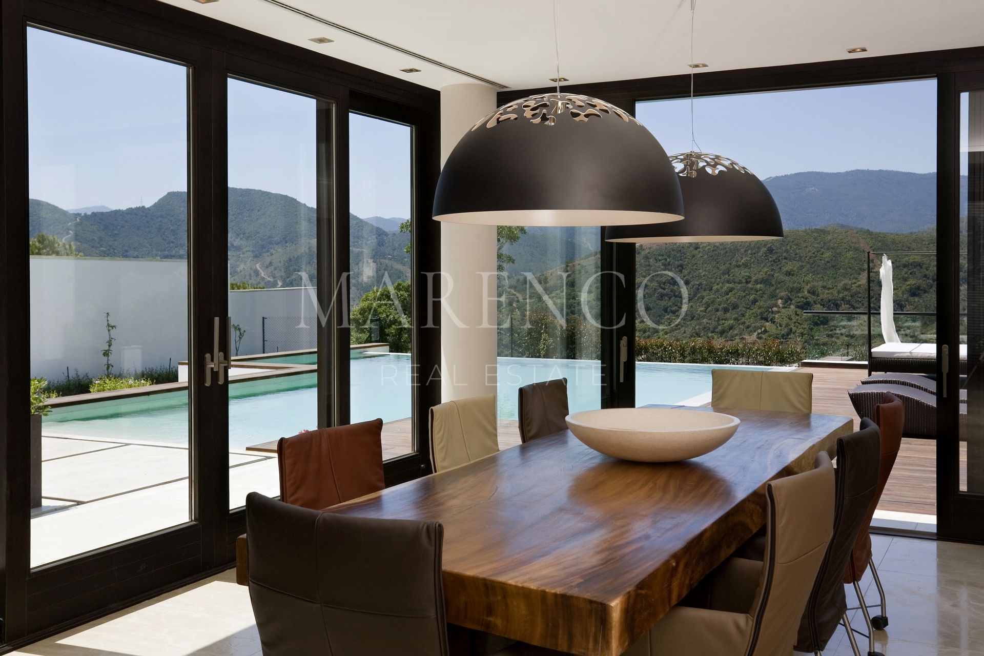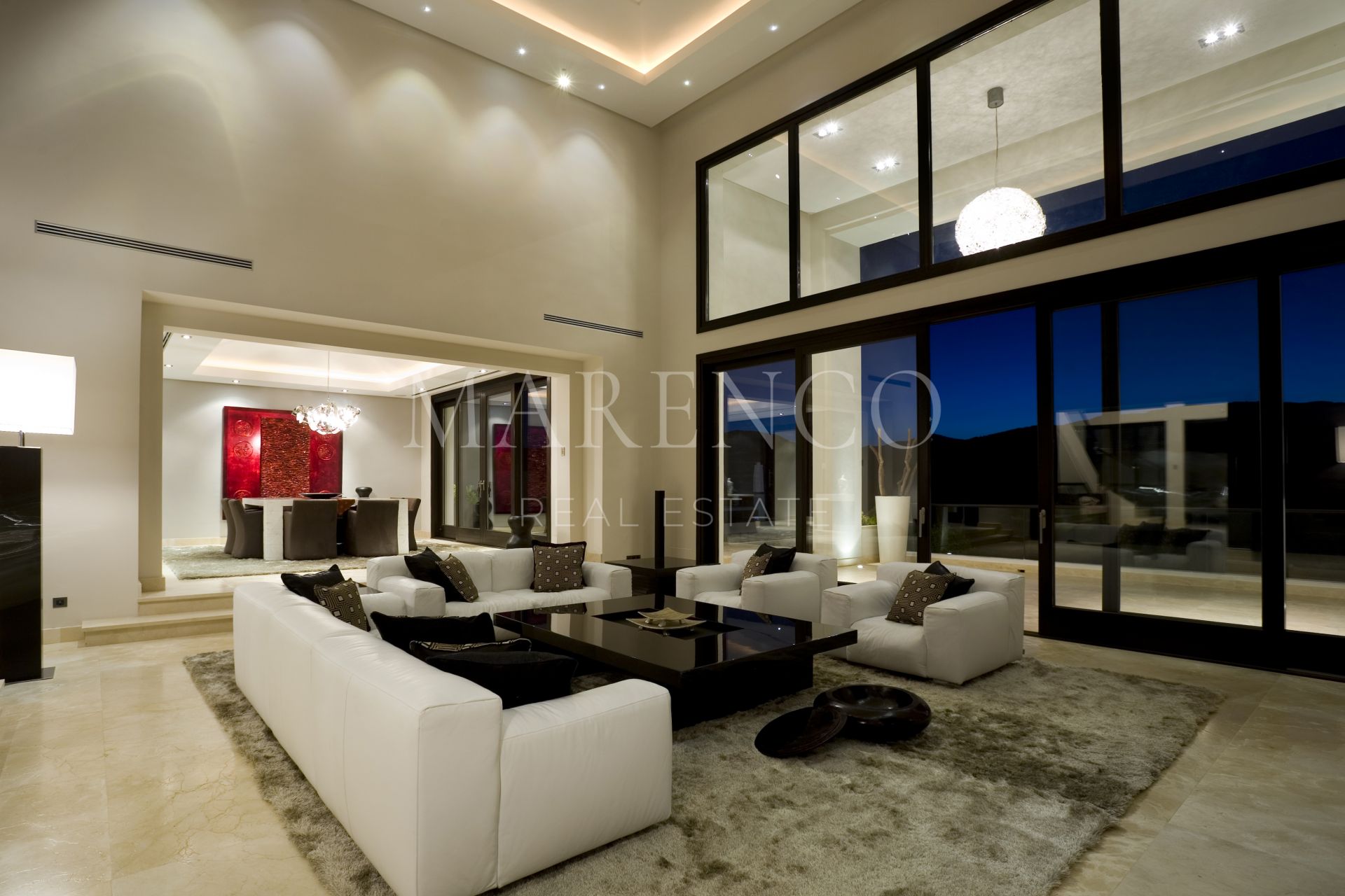 Una amplia sala de estar y comedor con chimenea. Enormes ventanas panorámicas y puertas de vidrio permiten inundar los espacios con luz natural, unen el interior y el exterior e invitan a disfrutar de la libertad de las vistas panorámicas. La fabulosa residencia está ubicada en una posición privilegiada en la colina que domina los pintorescos campos de golf y los suaves paisajes andaluces con verdes colinas y majestuosas montañas.