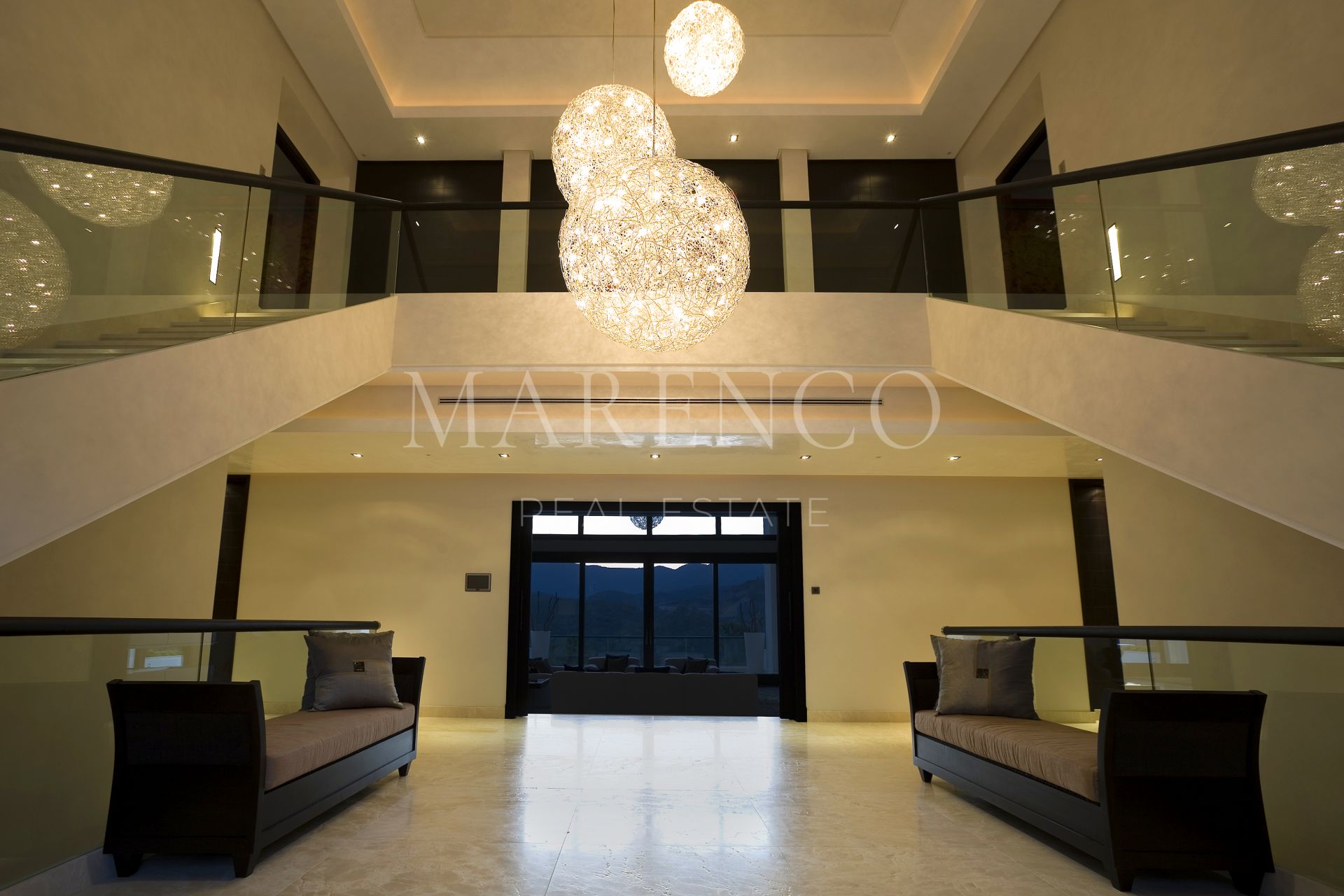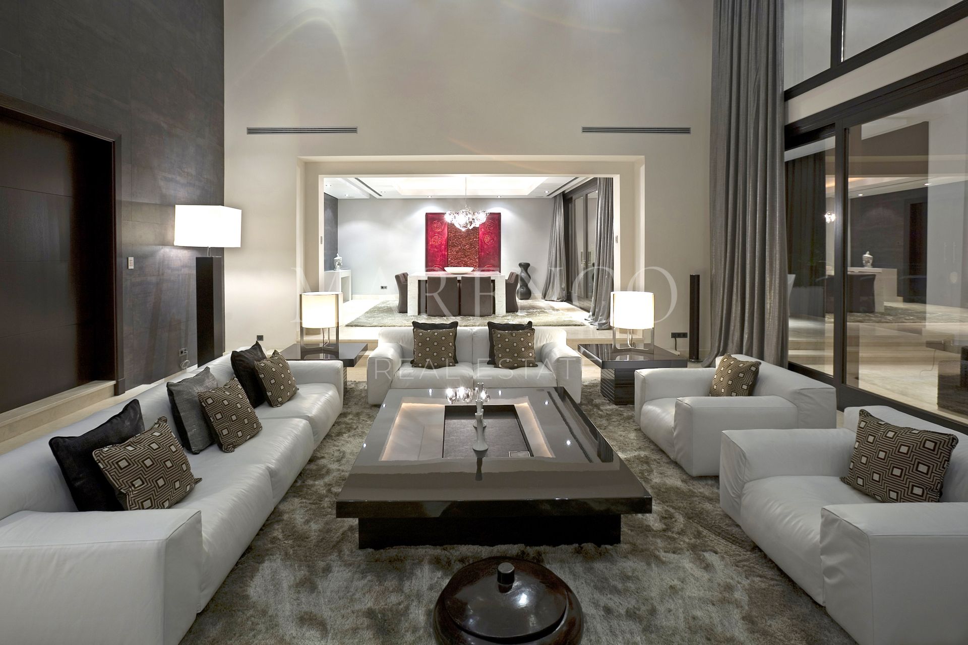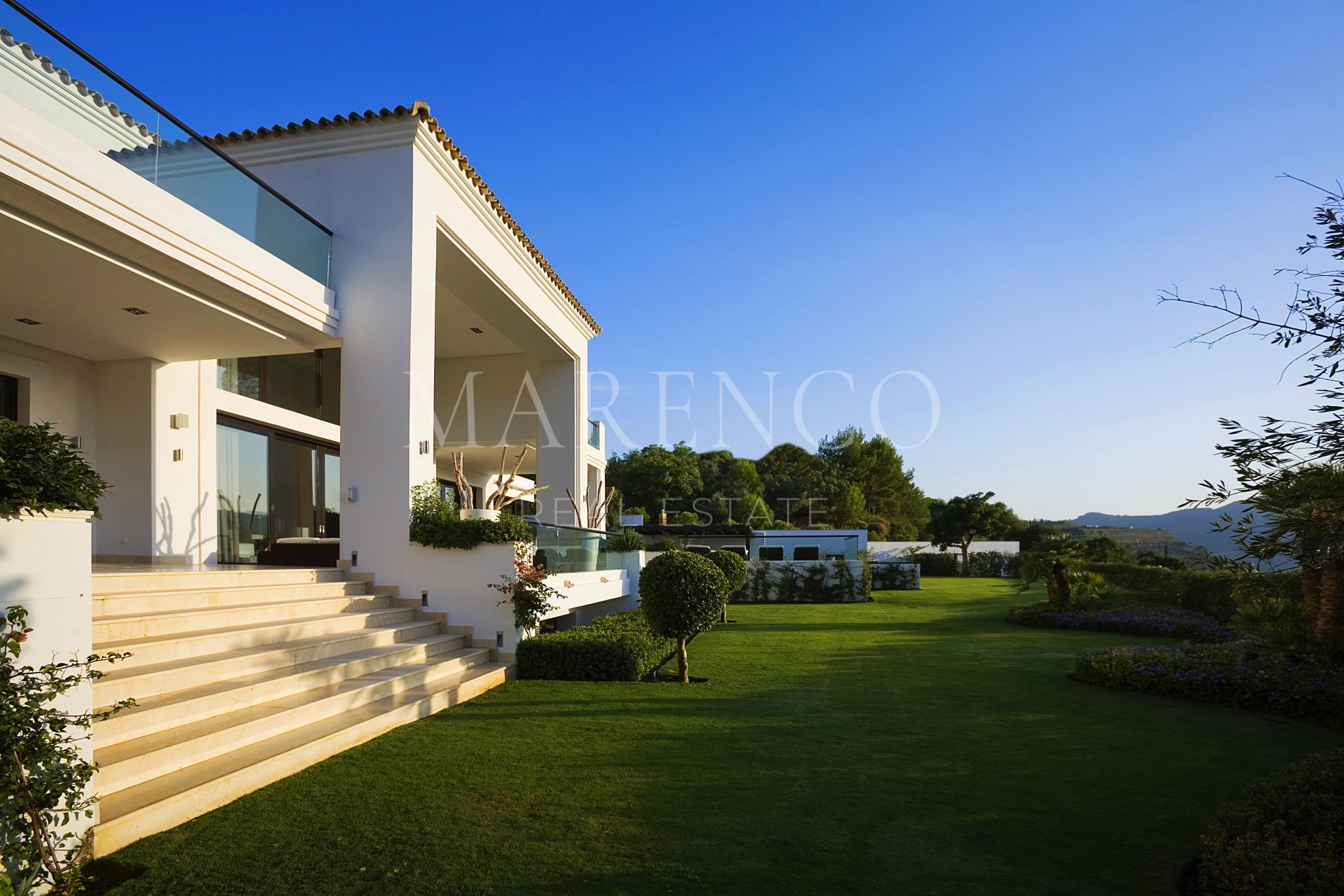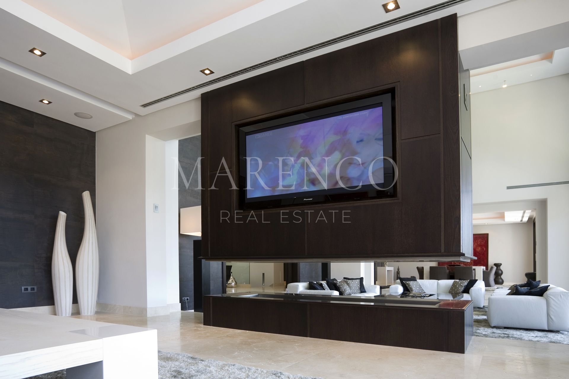 Una amplia sala de estar y comedor con chimenea. Enormes ventanas panorámicas y puertas de vidrio permiten inundar los espacios con luz natural, unen el interior y el exterior e invitan a disfrutar de la libertad de las vistas panorámicas. La fabulosa residencia está ubicada en una posición privilegiada en la colina que domina los pintorescos campos de golf y los suaves paisajes andaluces con verdes colinas y majestuosas montañas.