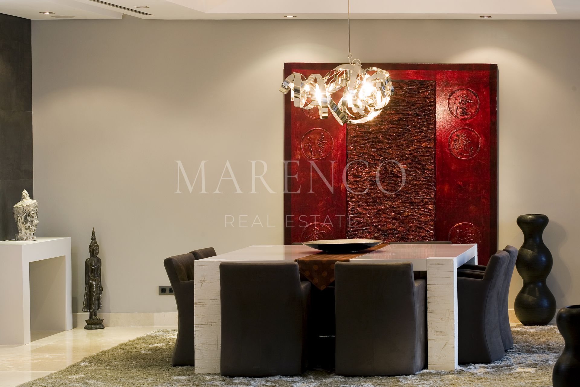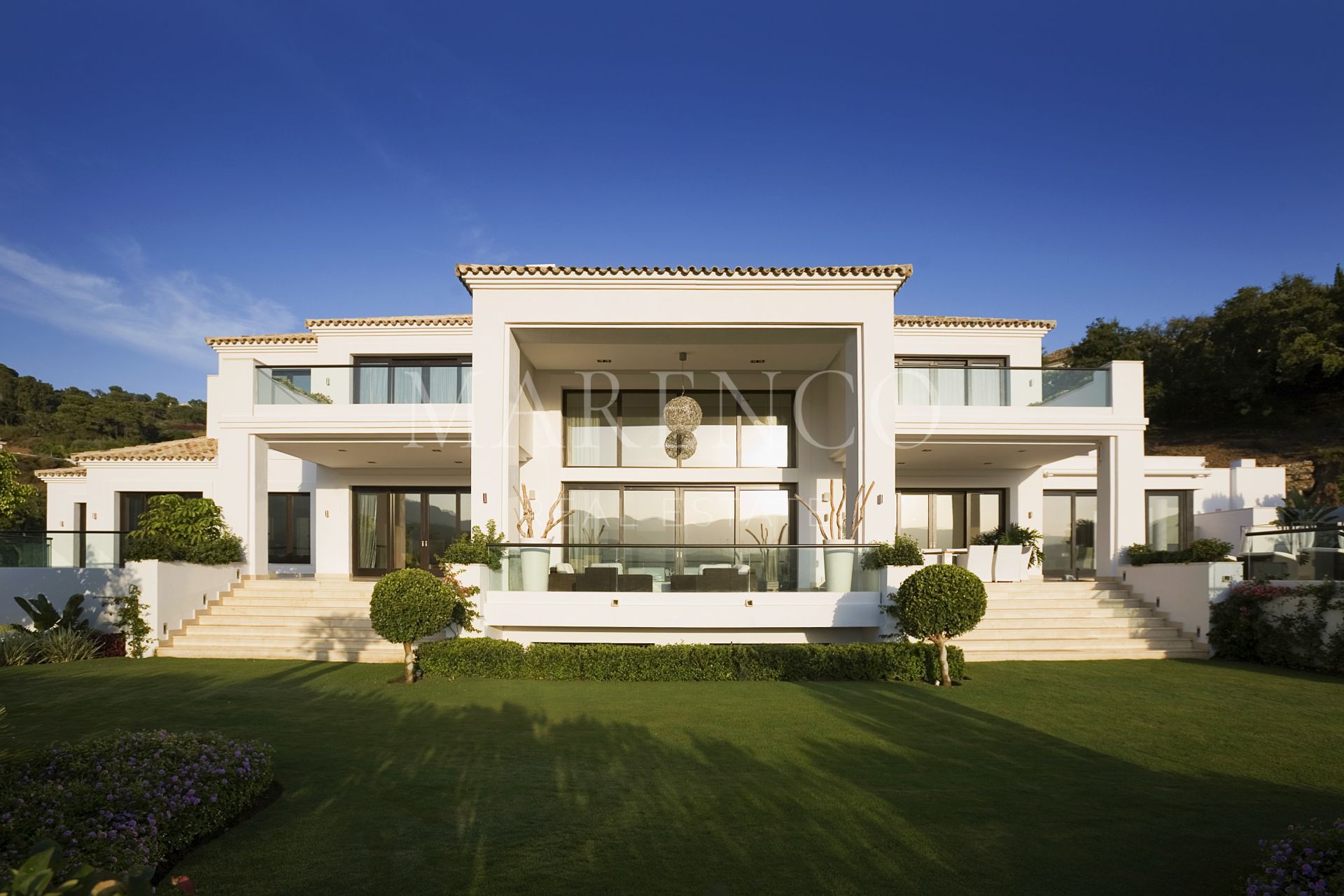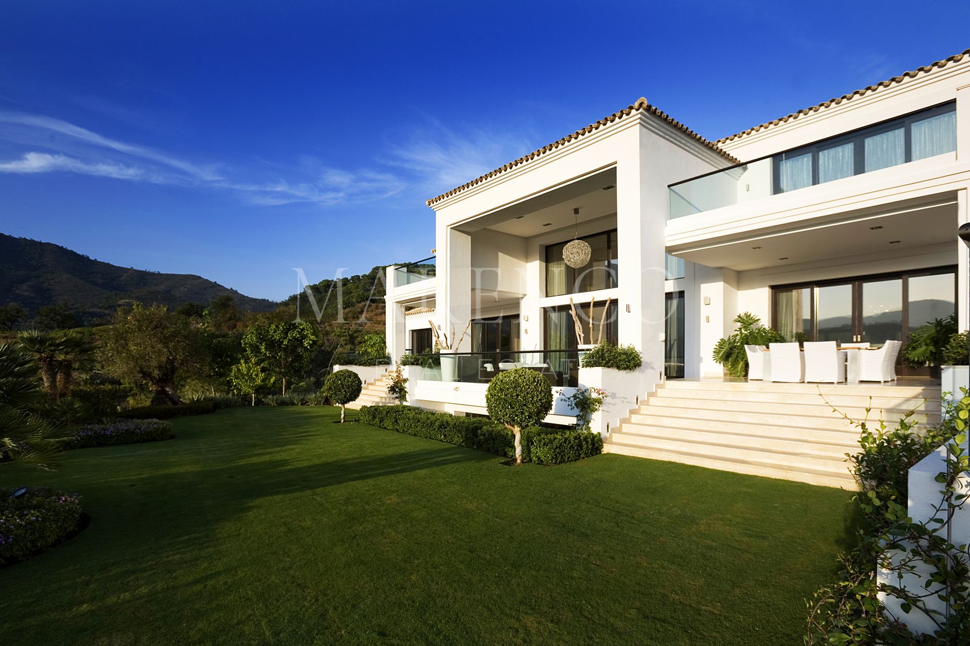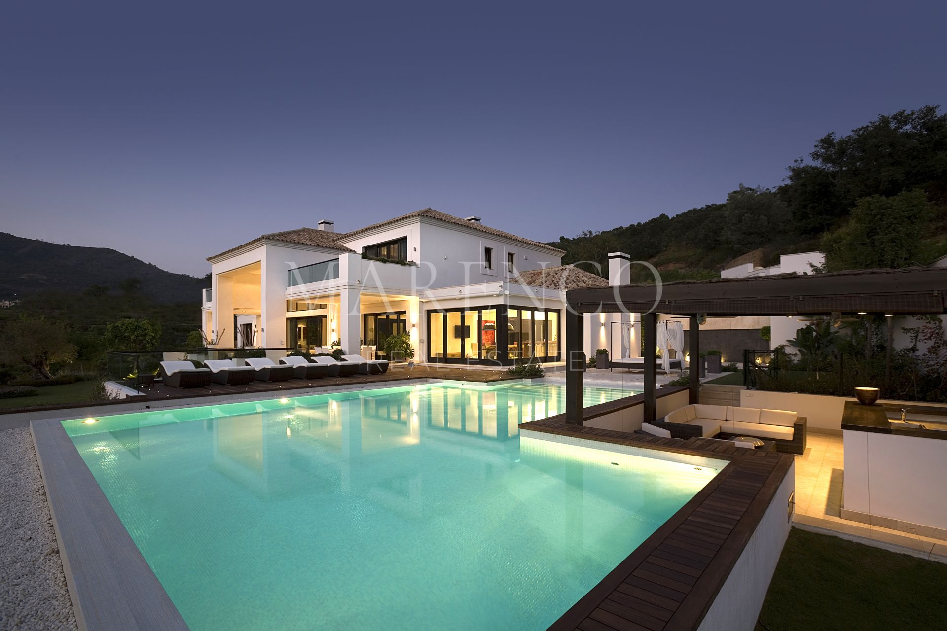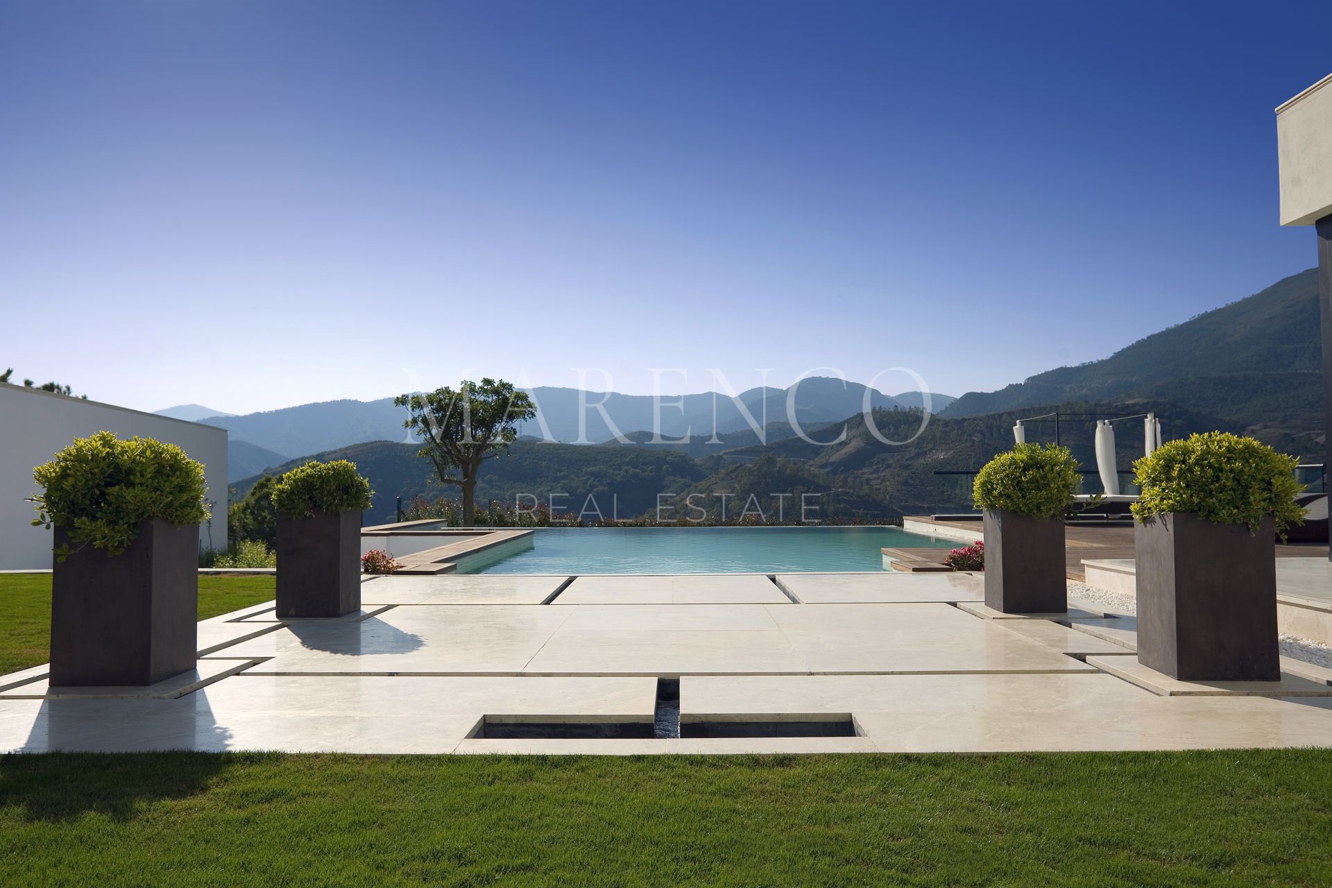 Una amplia sala de estar y comedor con chimenea. Enormes ventanas panorámicas y puertas de vidrio permiten inundar los espacios con luz natural, unen el interior y el exterior e invitan a disfrutar de la libertad de las vistas panorámicas. La fabulosa residencia está ubicada en una posición privilegiada en la colina que domina los pintorescos campos de golf y los suaves paisajes andaluces con verdes colinas y majestuosas montañas.