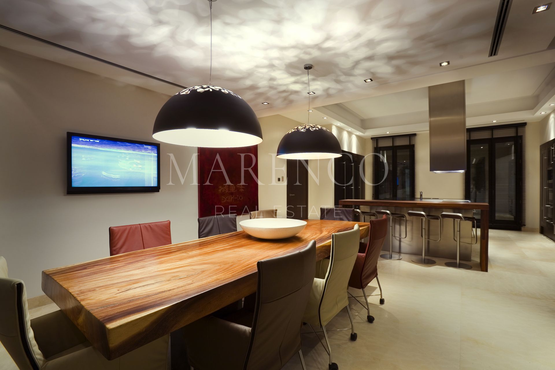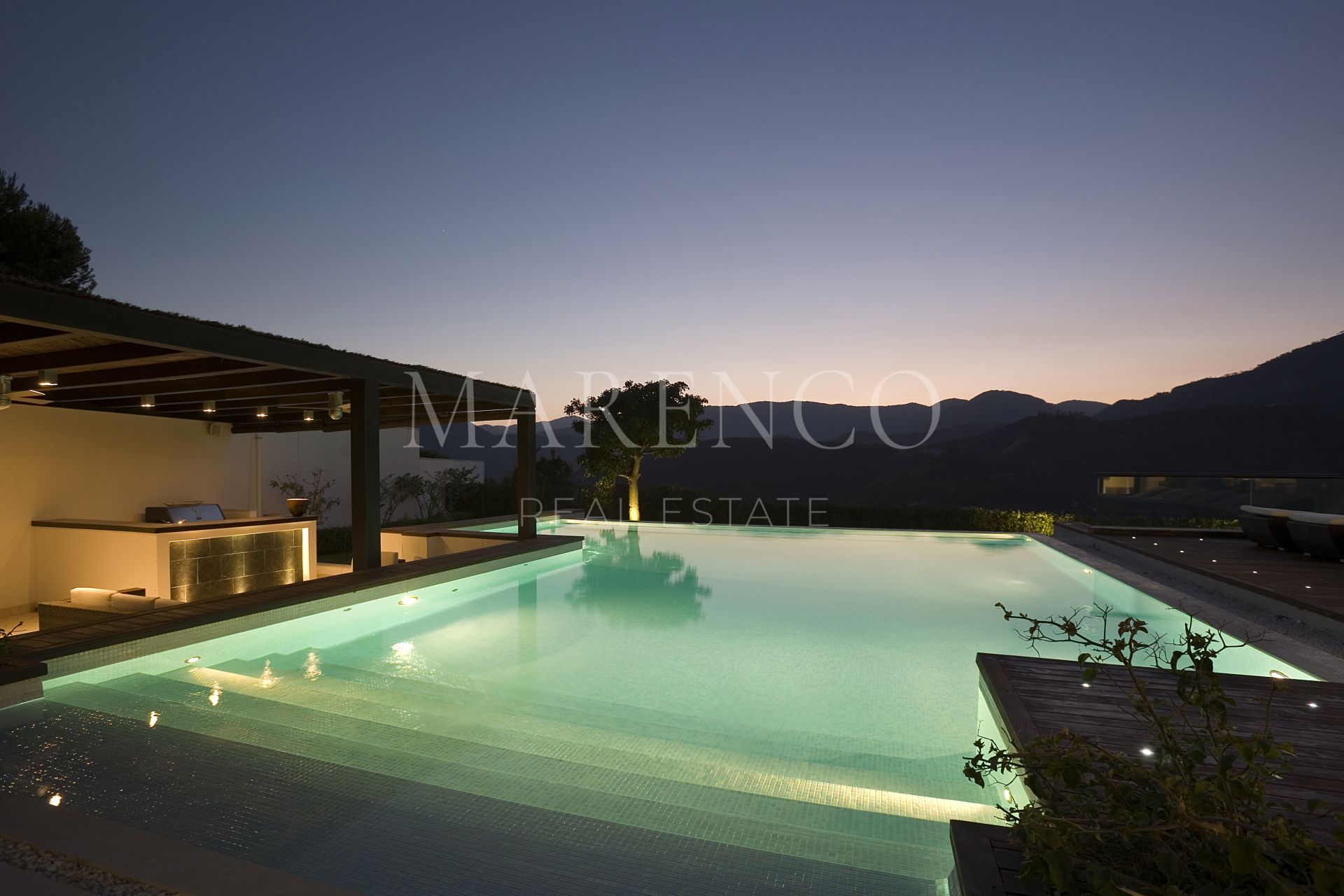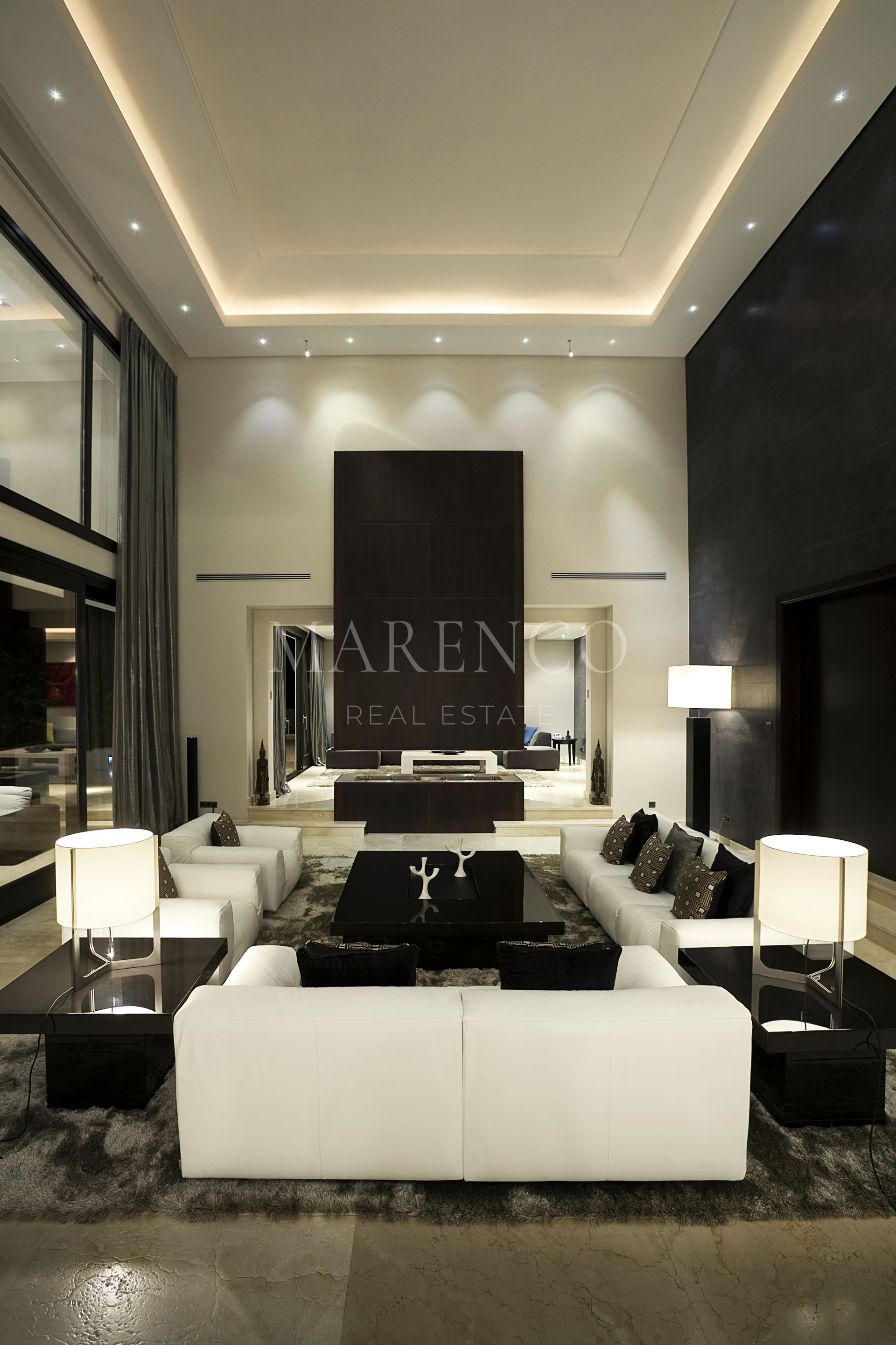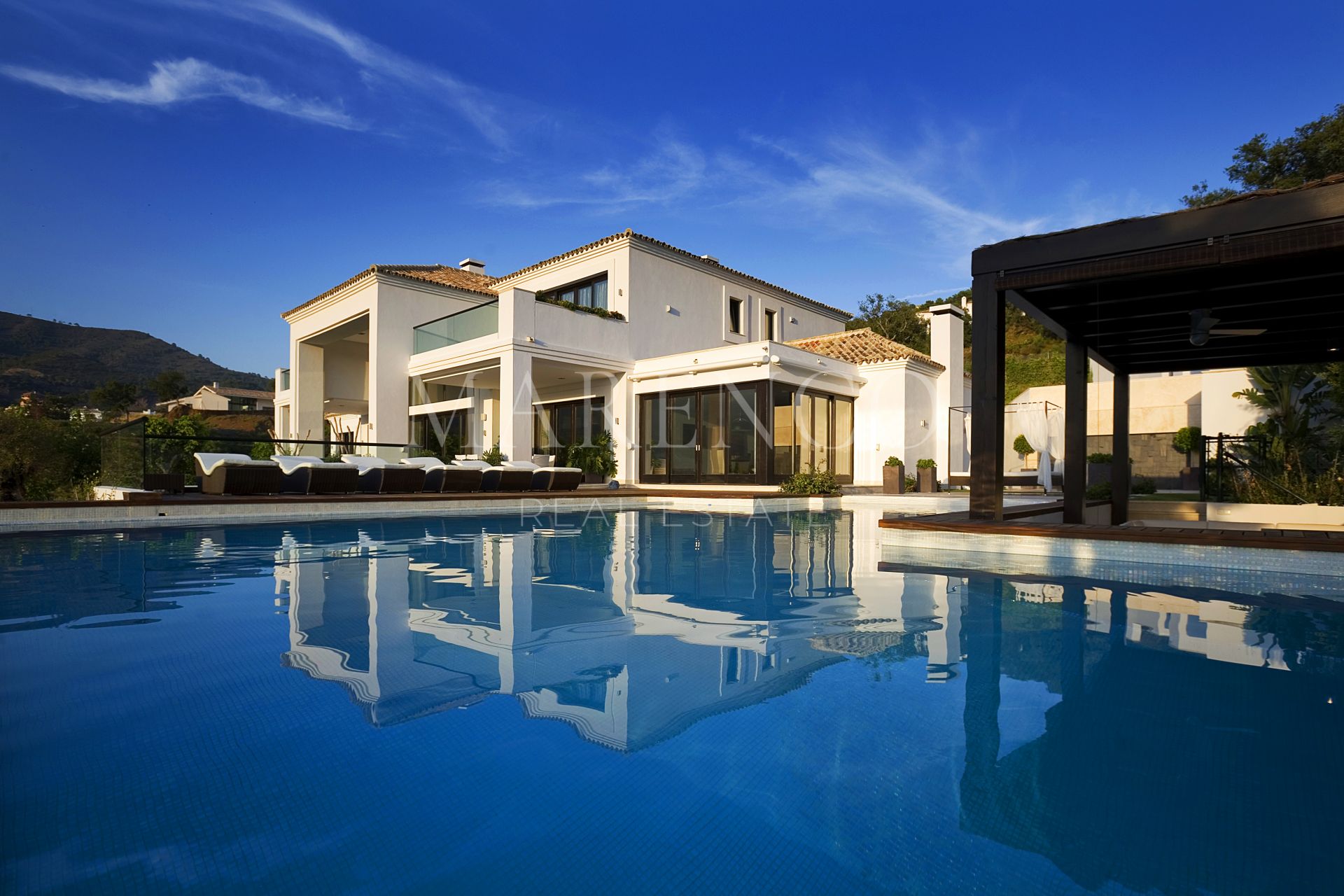 Una amplia sala de estar y comedor con chimenea. Enormes ventanas panorámicas y puertas de vidrio permiten inundar los espacios con luz natural, unen el interior y el exterior e invitan a disfrutar de la libertad de las vistas panorámicas. La fabulosa residencia está ubicada en una posición privilegiada en la colina que domina los pintorescos campos de golf y los suaves paisajes andaluces con verdes colinas y majestuosas montañas.