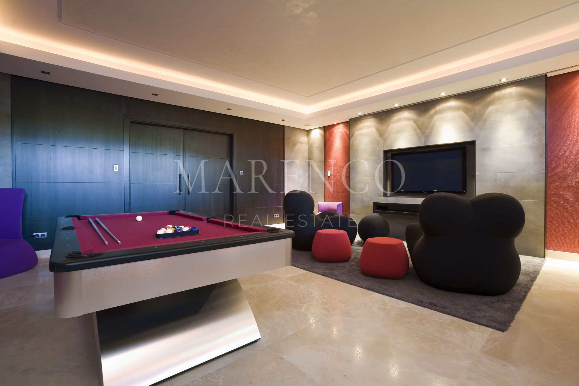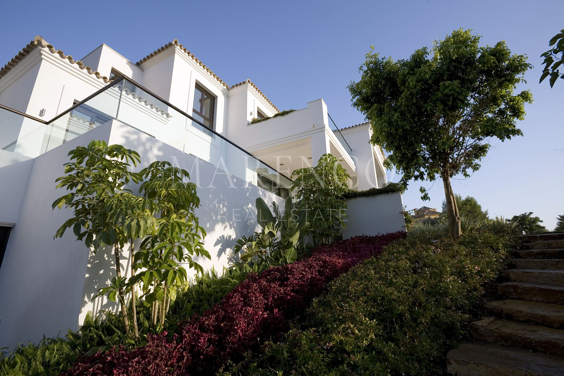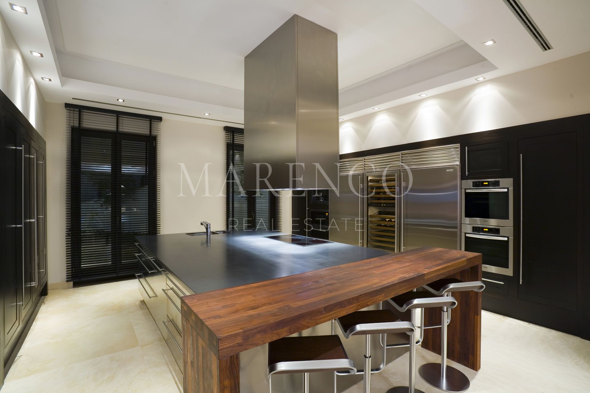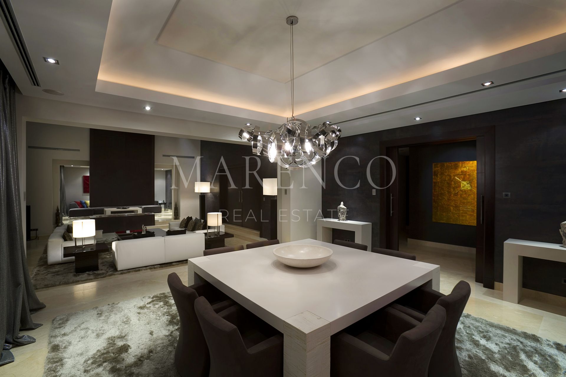 Una amplia sala de estar y comedor con chimenea. Enormes ventanas panorámicas y puertas de vidrio permiten inundar los espacios con luz natural, unen el interior y el exterior e invitan a disfrutar de la libertad de las vistas panorámicas. La fabulosa residencia está ubicada en una posición privilegiada en la colina que domina los pintorescos campos de golf y los suaves paisajes andaluces con verdes colinas y majestuosas montañas.