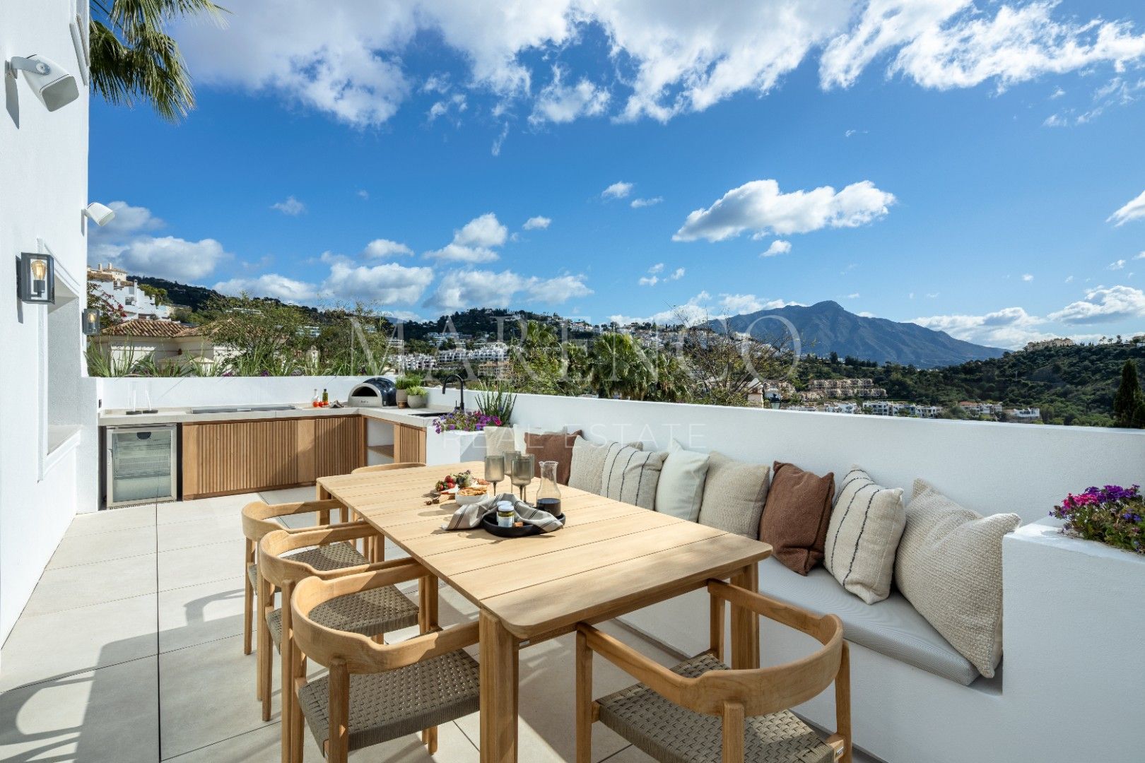 Con una superficie construida de 972 m² sobre una parcela de 1.016 m², Villa Fortuna ofrece interiores amplios y luminosos, terrazas espaciosas y vistas al mar que quitan el aliento, convirtiéndola en un refugio de tranquilidad para quienes buscan tanto relajación como entretenimiento. La villa cuenta con cinco dormitorios de generosas dimensiones, cada uno con su propio baño en suite, además de un aseo de cortesía para invitados. La planta baja de diseño abierto está pensada para un estilo de vida contemporáneo, con una elegante zona de estar, una cocina danesa de diseño personalizada equipada con electrodomésticos de alta gama Gaggenau y Siemens, encimeras Dekton y muebles lacados de líneas limpias. Junto a la cocina se encuentra un refinado comedor, ideal tanto para cenas íntimas como para reuniones más numerosas, y una acogedora sala de TV, perfecta para relajarse.