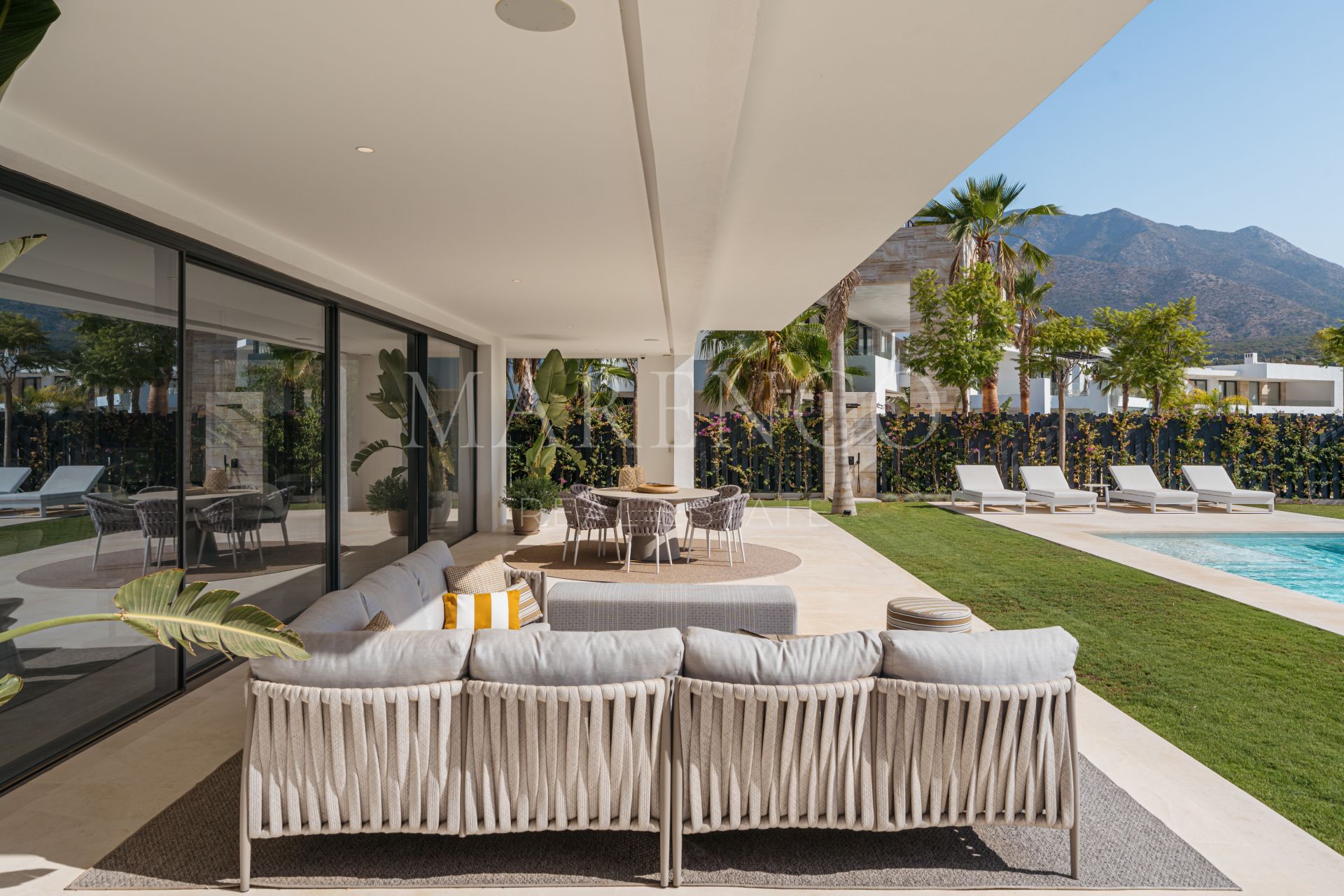 Los cinco dormitorios en suite son auténticos refugios privados, cada uno con acceso directo a amplias terrazas. La planta principal cuenta con un espacio de estar de concepto abierto, que incluye una moderna cocina, un área de comedor y una acogedora chimenea, todo iluminado por luz natural. Los espacios exteriores son igualmente impresionantes, con un exuberante jardín, una serena piscina y una terraza con porche ideal para el descanso.