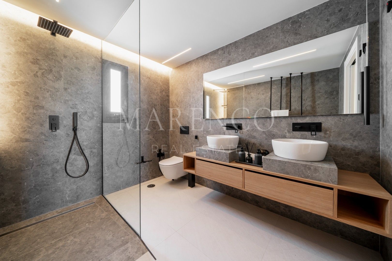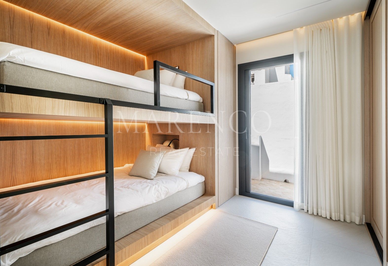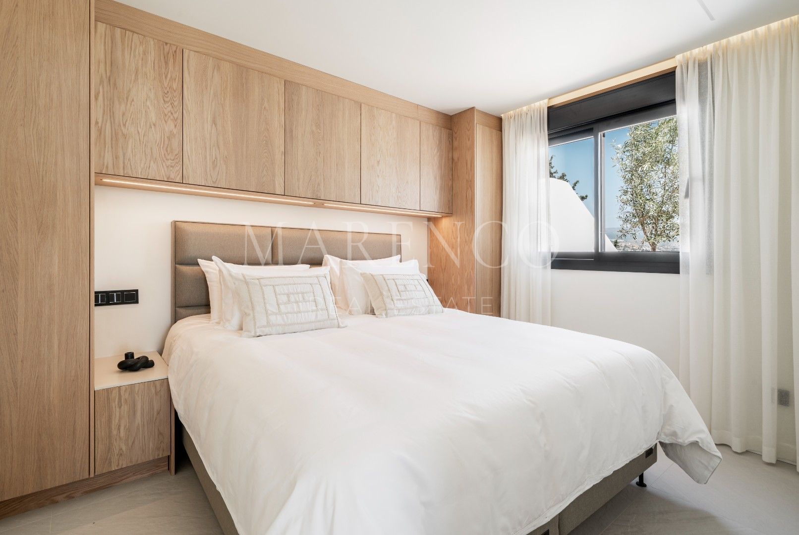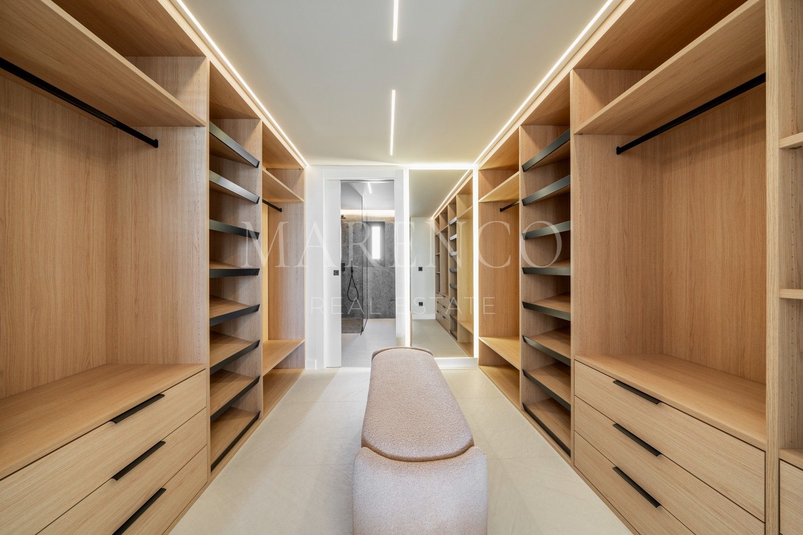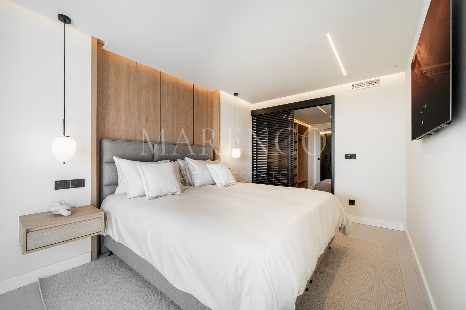 El dormitorio principal, adyacente a la terraza, cuenta con una decoración minimalista, un amplio vestidor hecho a medida y un baño cómodo con lavabos dobles y una gran área de ducha. Además, el ático incluye dos dormitorios adicionales equipados con muebles personalizados y generoso espacio de almacenamiento, que comparten un espacioso baño completo.