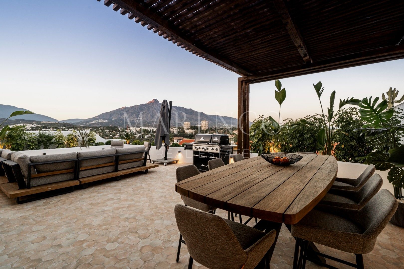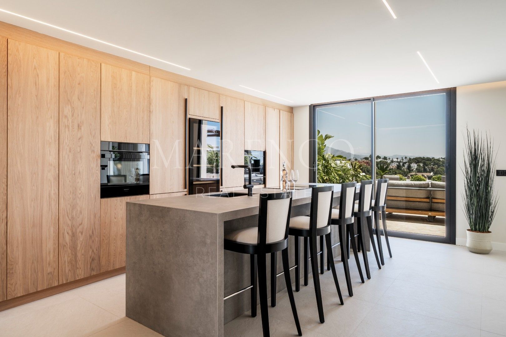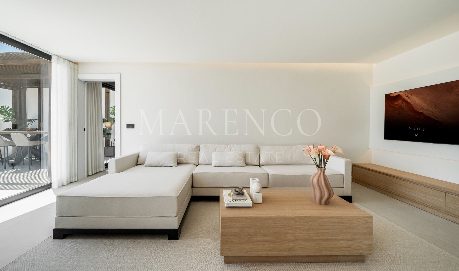 El salón cuenta con inmensas ventanas que se abren a la amplia terraza, ofreciendo vistas impresionantes y un espacio perfecto para el entretenimiento al aire libre.