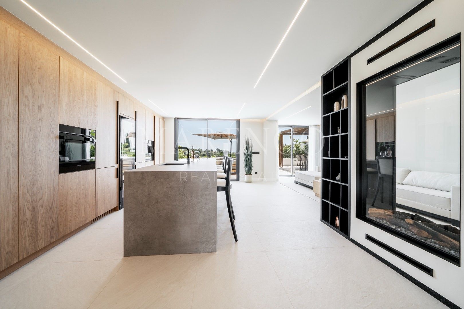 La cocina de diseño abierto, de la renombrada marca Ballingslöv, se integra con la sala de estar, que cuenta con una chimenea eléctrica de piso a techo. Los materiales de primera calidad en una paleta neutra crean un ambiente elegante y funcional. Los armarios de madera de roble con puertas minimalistas se integran con las paredes de la cocina, mientras que una gran isla de gres porcelánico proporciona un espacio acogedor para reuniones.