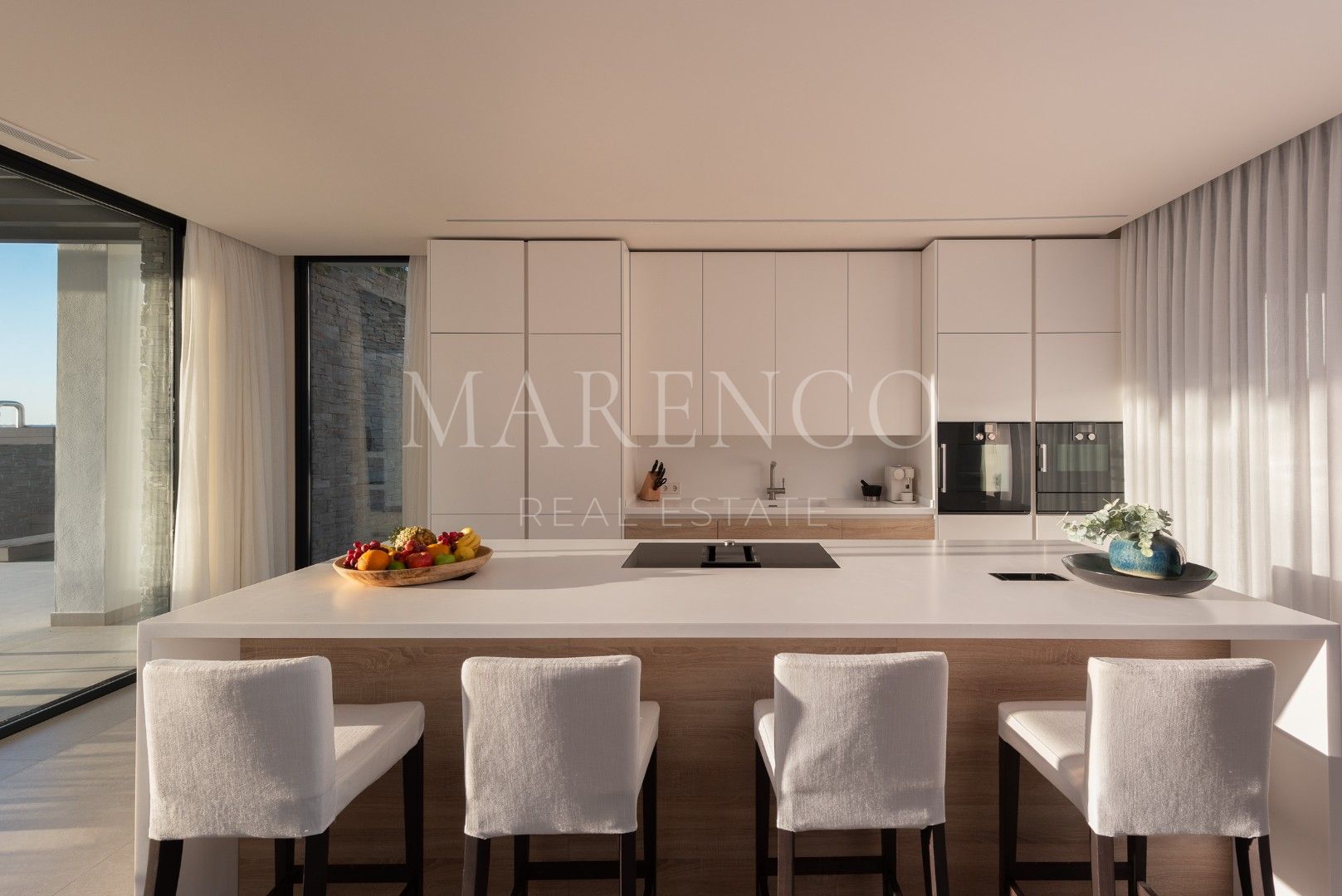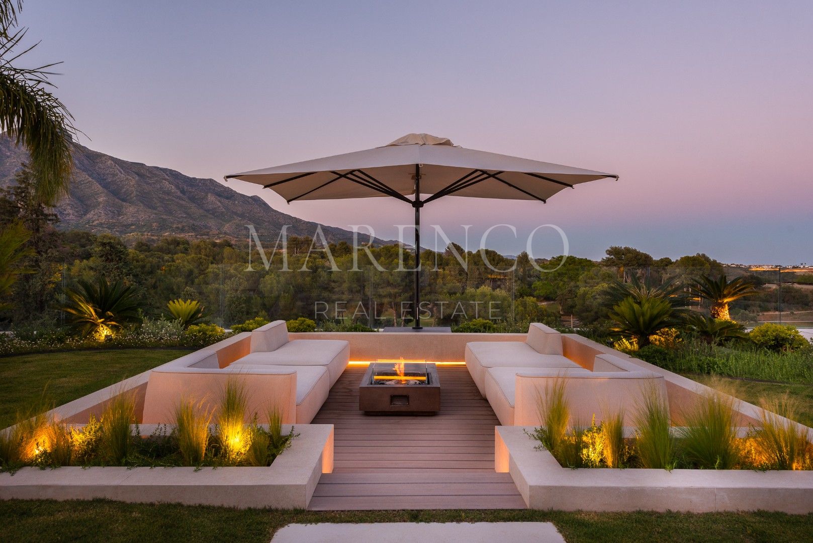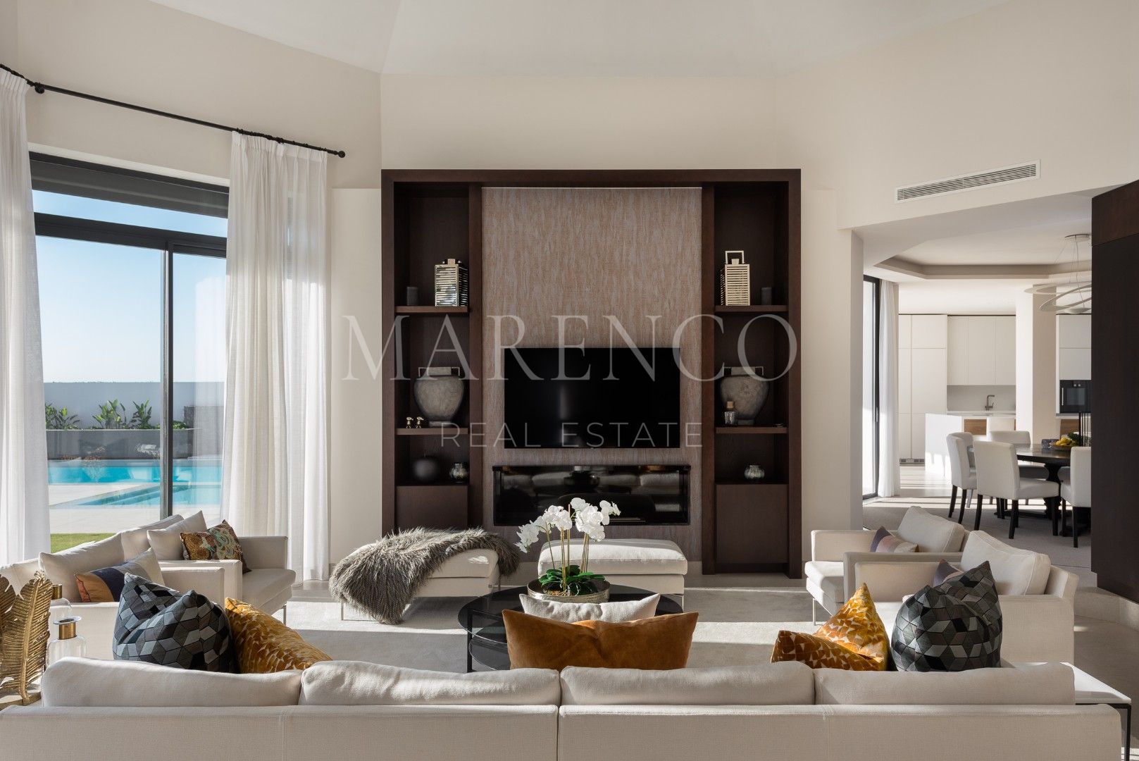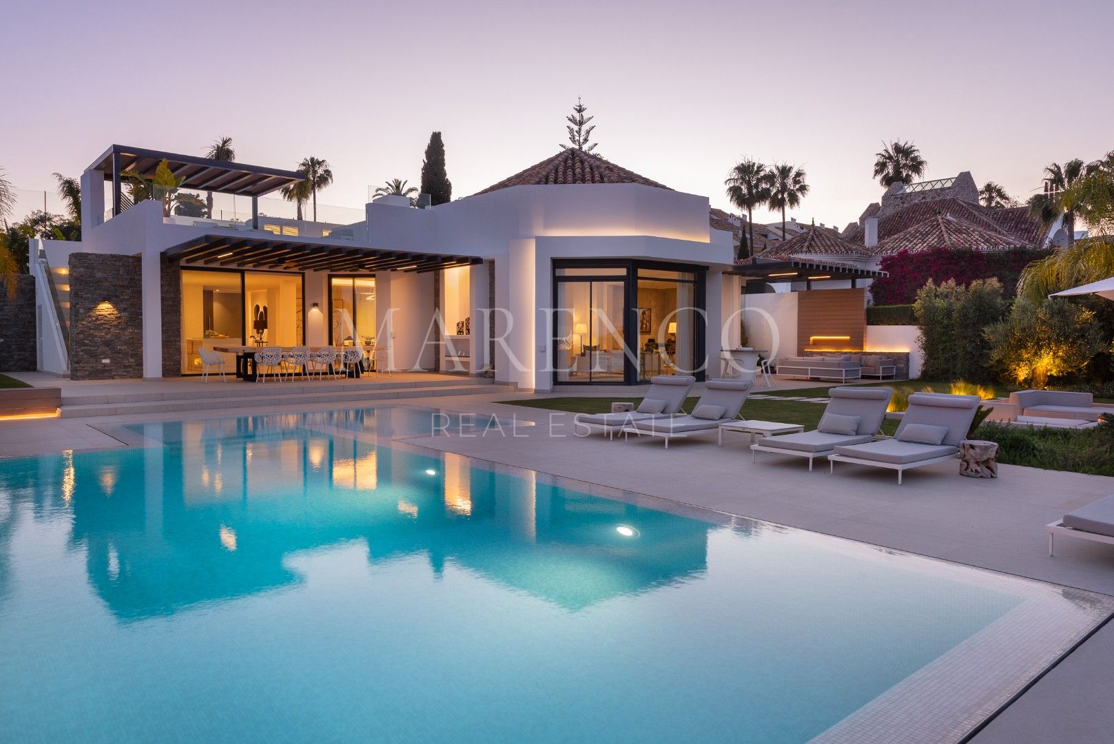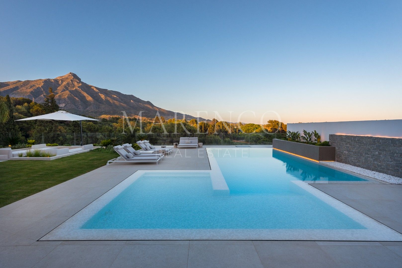Villa La Vista presenta un diseño contemporáneo con un toque andaluz. Ubicada en una parcela de 1158 m² y 351 m² construidos y 135 m² de terrazas y porches, todo en una sola planta. El salón en el corazón de la casa, ofrece vistas al jardín y a la montaña de La Concha, a través de amplios ventanales que van de suelo a techo, inundando el espacio de luz natural. La moderna cocina está equipada con electrodomésticos Gaggenau, una barra de desayuno y una Vinoteca Gaggenau integrado de altura completa.