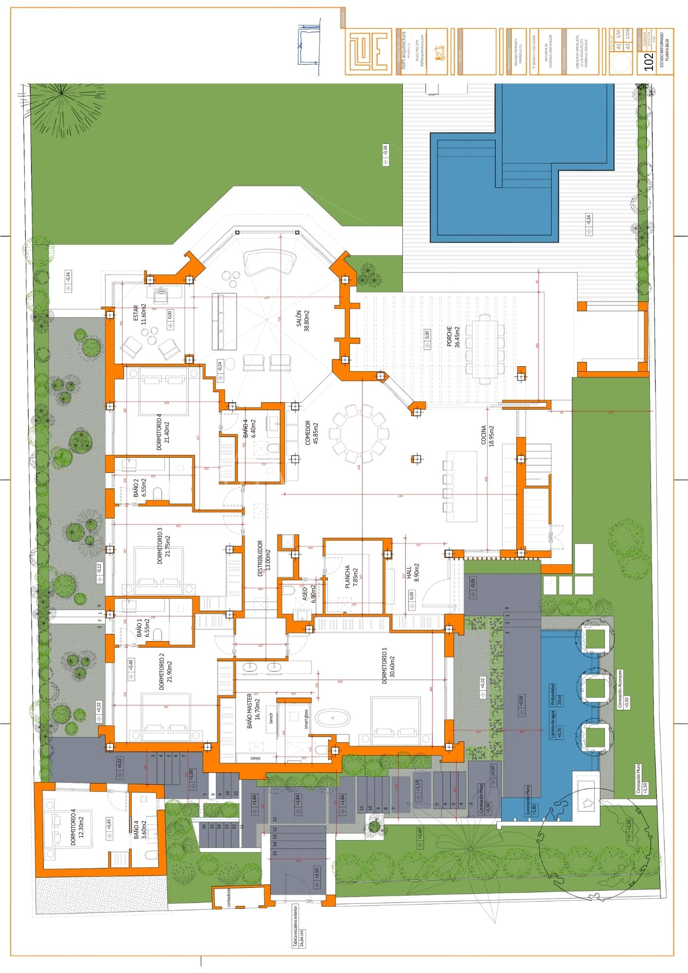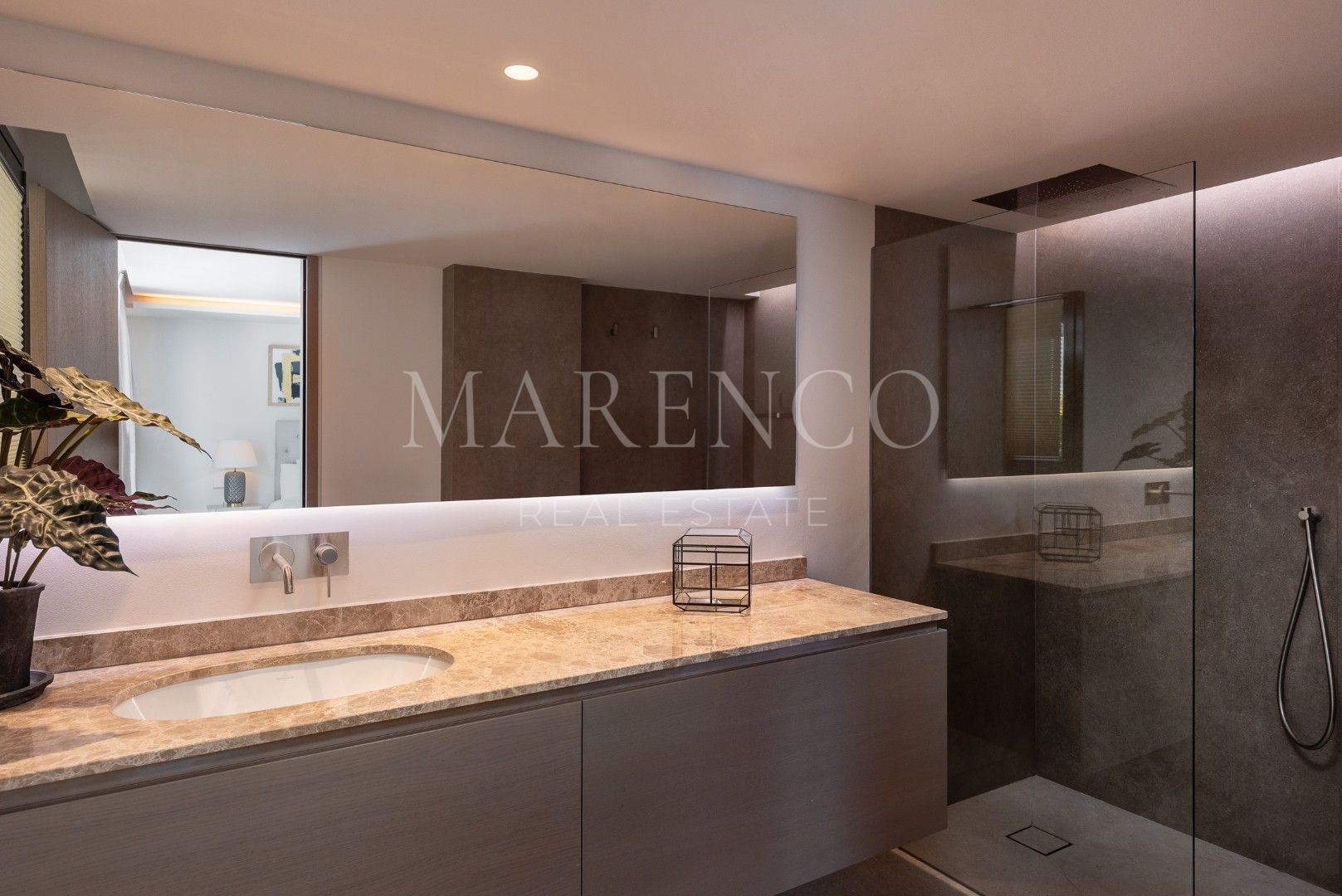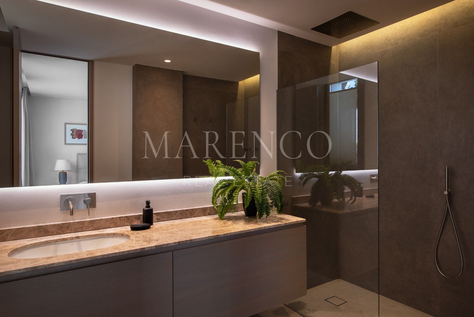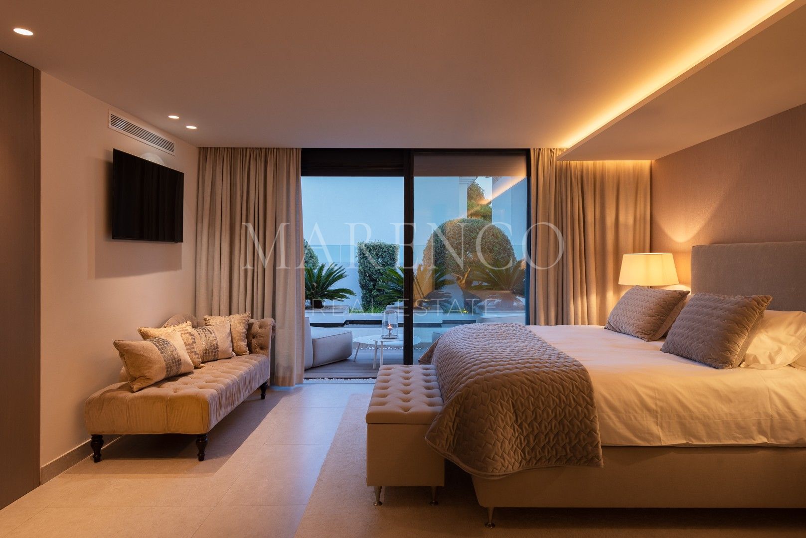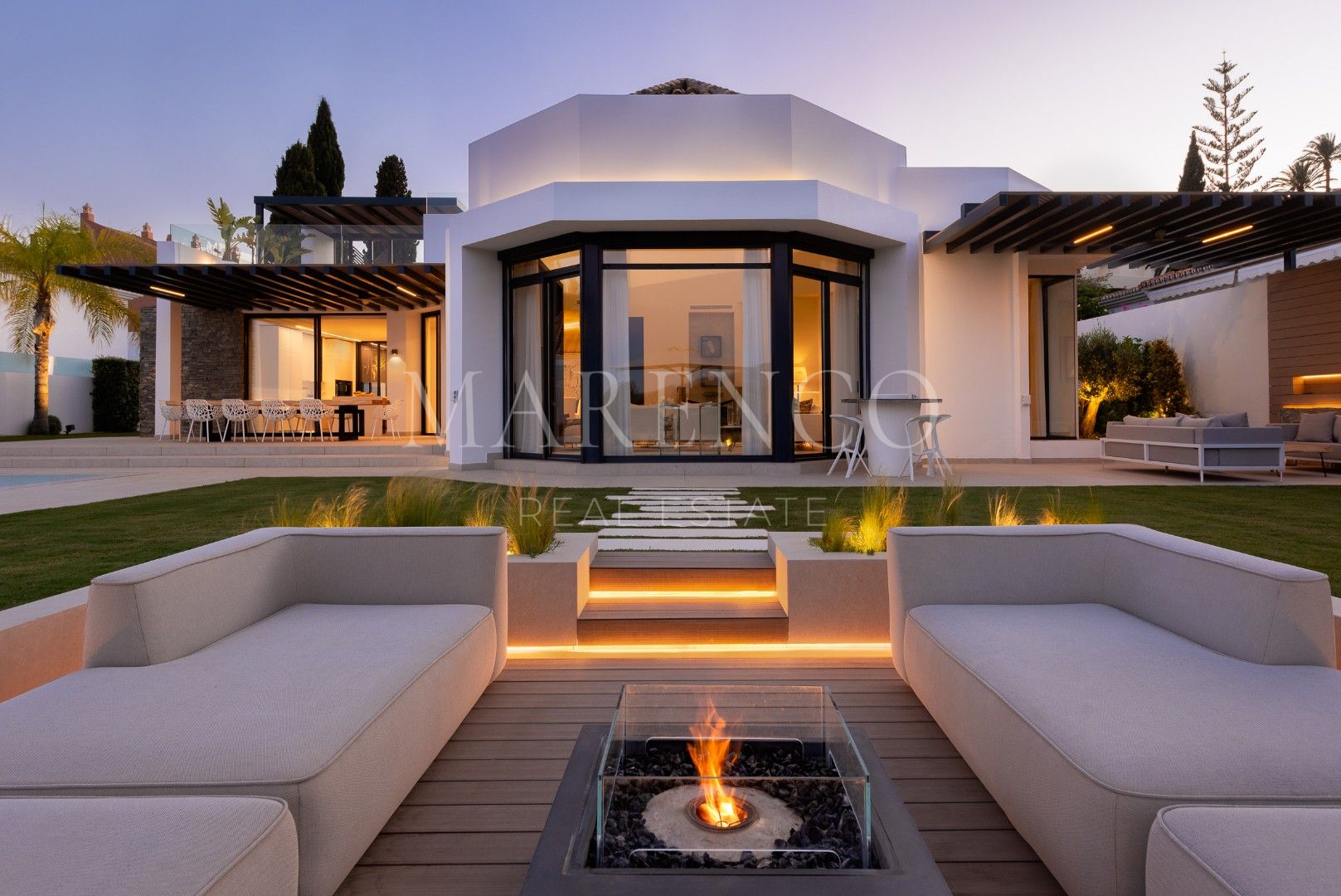 Villa La Vista presenta un diseño contemporáneo con un toque andaluz. Ubicada en una parcela de 1158 m² y 351 m² construidos y 135 m² de terrazas y porches, todo en una sola planta. El salón en el corazón de la casa, ofrece vistas al jardín y a la montaña de La Concha, a través de amplios ventanales que van de suelo a techo, inundando el espacio de luz natural. La moderna cocina está equipada con electrodomésticos Gaggenau, una barra de desayuno y una Vinoteca Gaggenau integrado de altura completa.