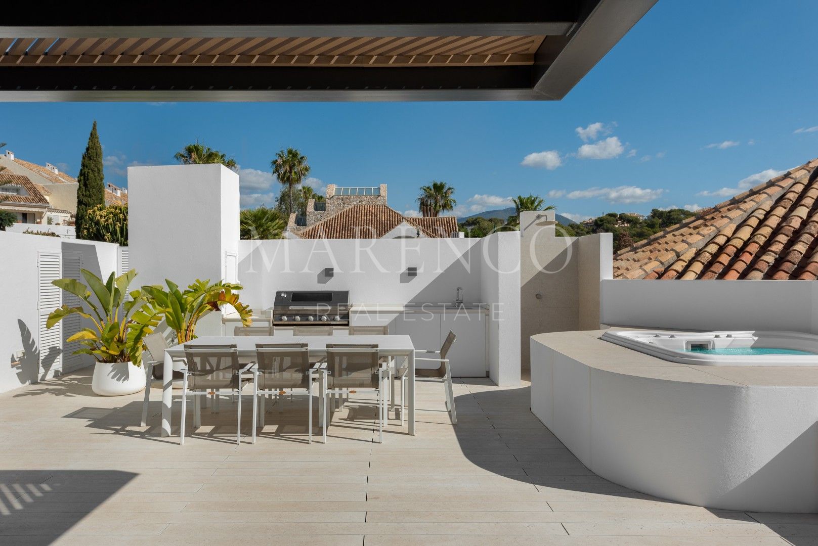 Subiendo las escaleras hacia el solarium hay una amplia zona de barbacoa con cocina exterior. Una zona cubierta ofrece sombra del sol veraniego, y hay un Jacuzzi para relajarse bajo las estrellas.