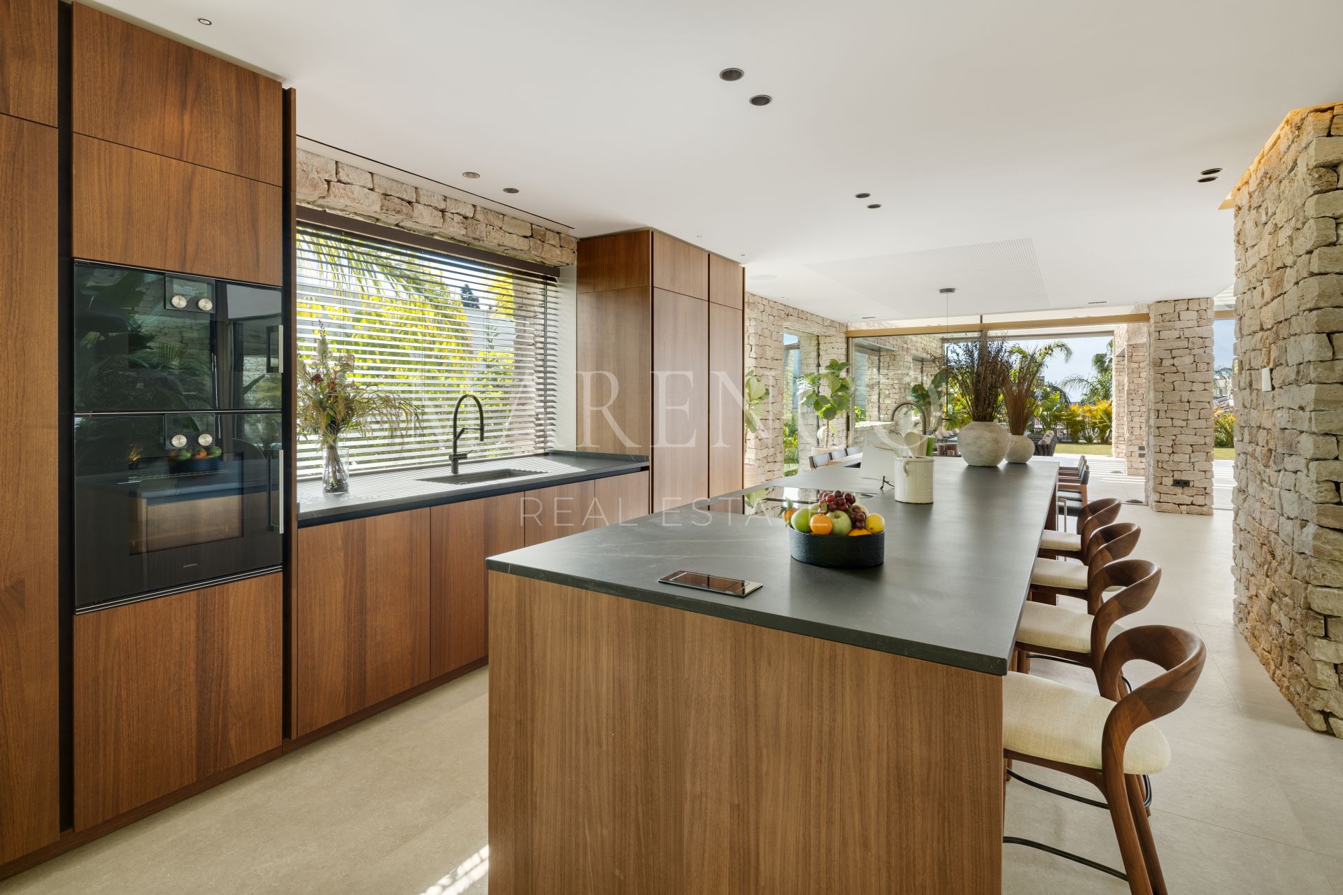 Al entrar, el interior es sencillamente espectacular. La zona de estar, comedor y cocina de planta abierta está bañada por luz natural gracias a los ventanales de suelo a techo y a un techo de doble altura que aporta una sensación de amplitud y ligereza. La zona de estar cuenta con impresionantes paredes de Travertino Tajalstone, que imitan el exterior de la villa, y un acogedor rincón decorado con encantadores árboles.