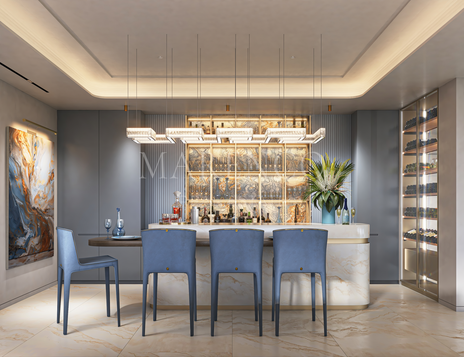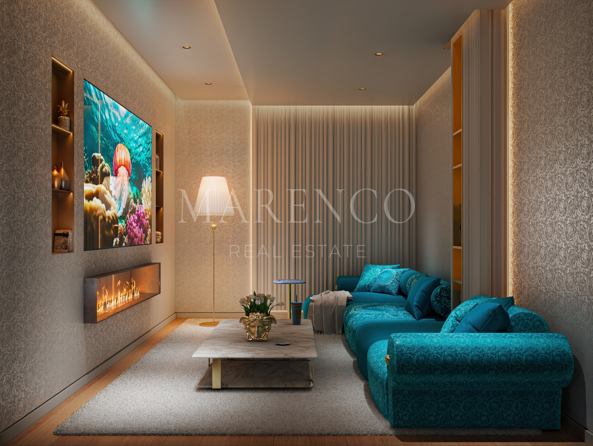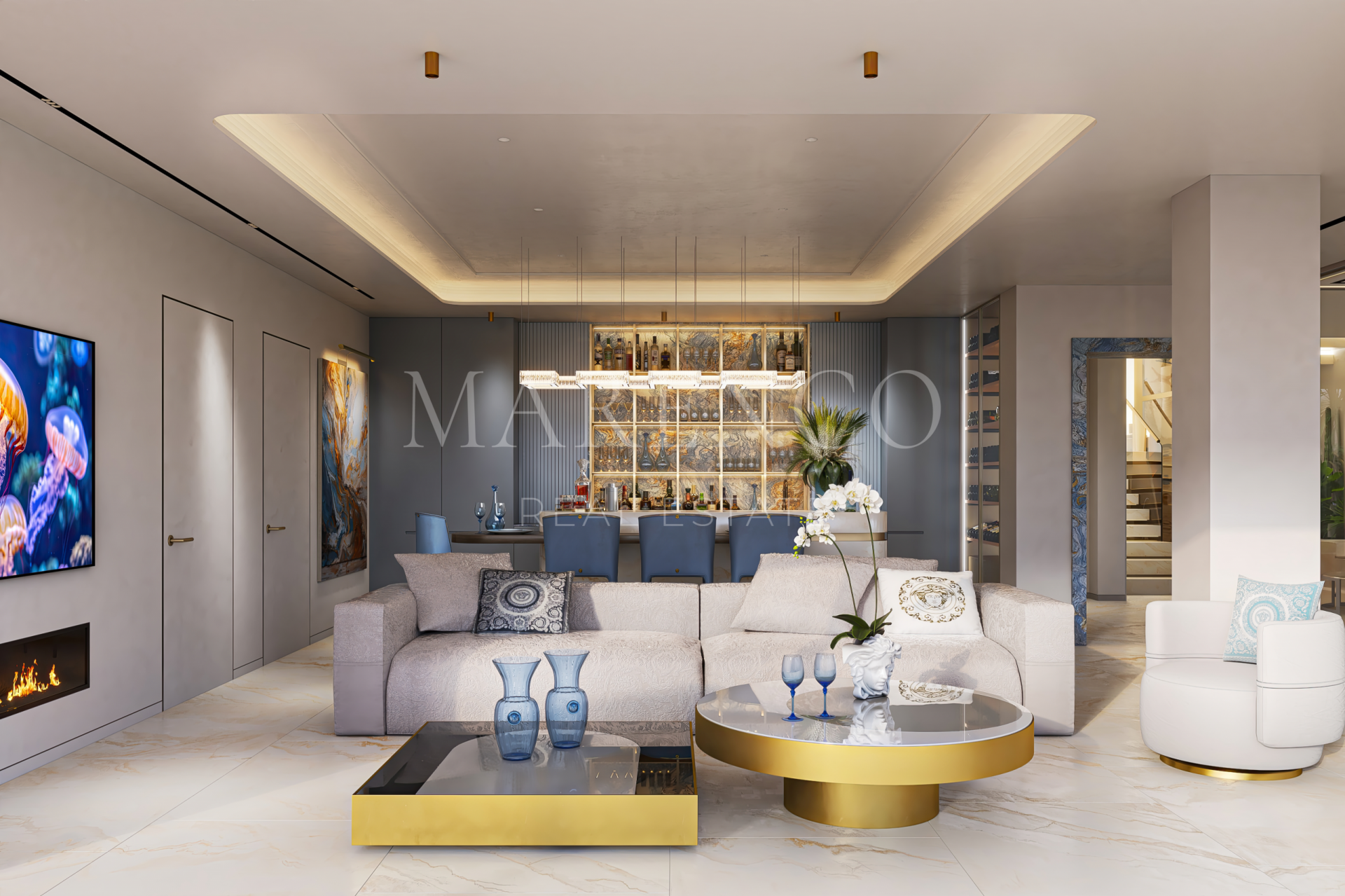 La villa se asienta sobre una amplia parcela de aproximadamente 2.000 m² y ofrece una superficie total construida cercana a los 1.639 m², distribuida en varias plantas conectadas mediante ascensor privado. La planta principal alberga espacios de vida de más de 200 m² que se abren hacia terrazas cubiertas y descubiertas, creando una transición natural entre interior y exterior. Dispone de cinco elegantes dormitorios en suite, incluyendo una impresionante suite principal con vestidor y baño de diseño. Mármol italiano, mosaicos personalizados y detalles icónicos como la Greca y la Medusa definen el carácter exclusivo de los interiores.