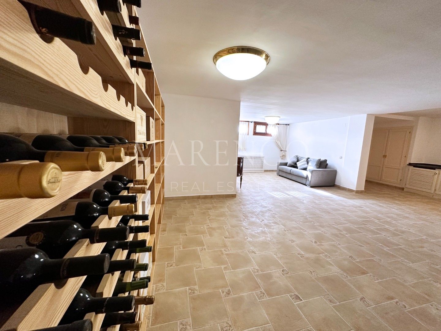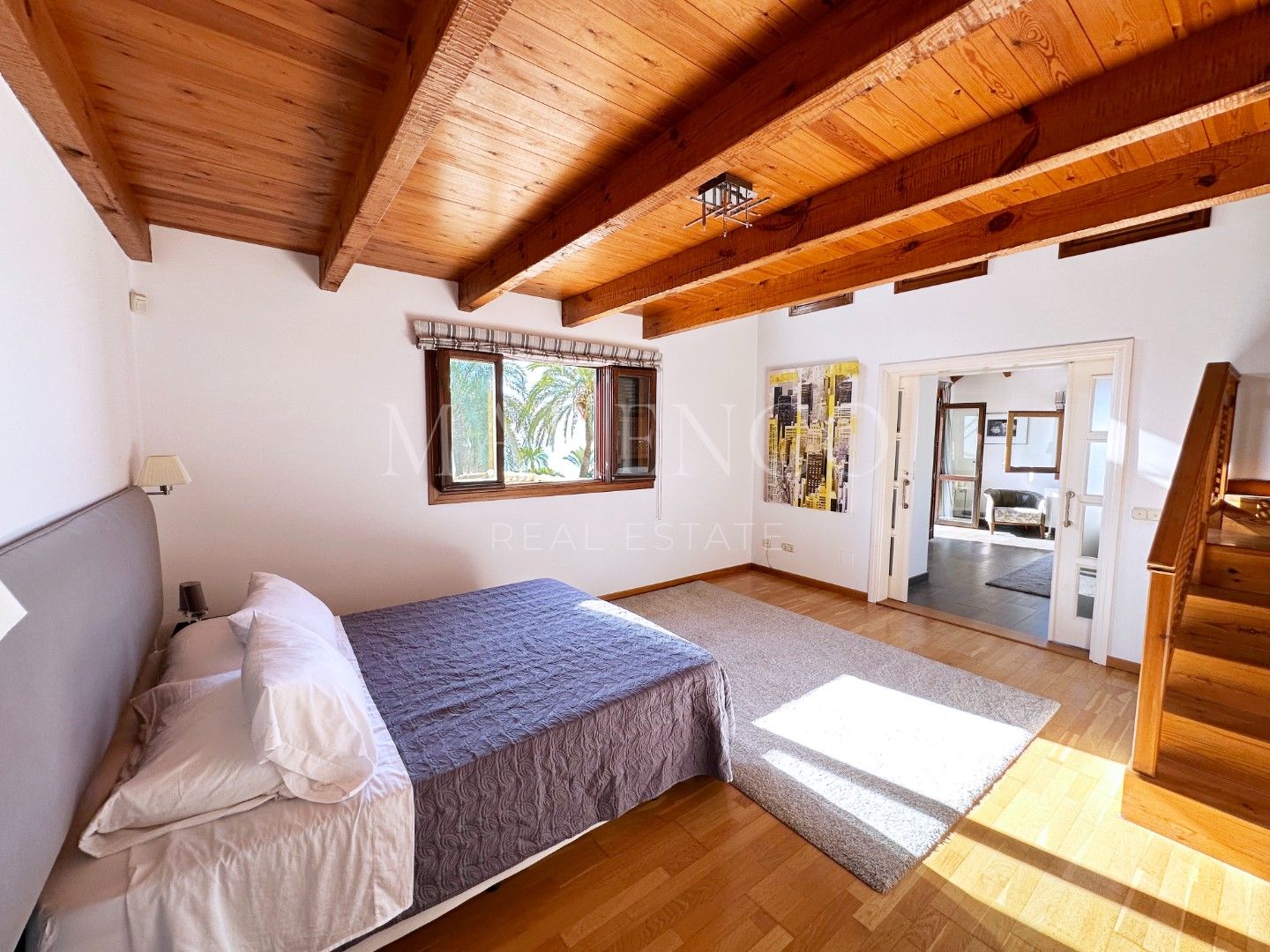En la primera planta hay un amplio dormitorio principal con su terraza privada para disfrutar de las fantásticas vistas al mar y del sol. En el mismo nivel se encuentra otro segundo dormitorio en-suite con chimenea y entrada a la terraza. En la primera planta hay posibilidad de hacer un dormitorio más. El sótano tiene un dormitorio junior en-suite con entrada independiente, sala de estar y cocina americana, esa zona se puede utilizar como un apartamento para el personal. También hay un amplio garaje para 4 coches y trastero grande. Además se puede encontrar aparcamiento exterior cubierto para dos coches.