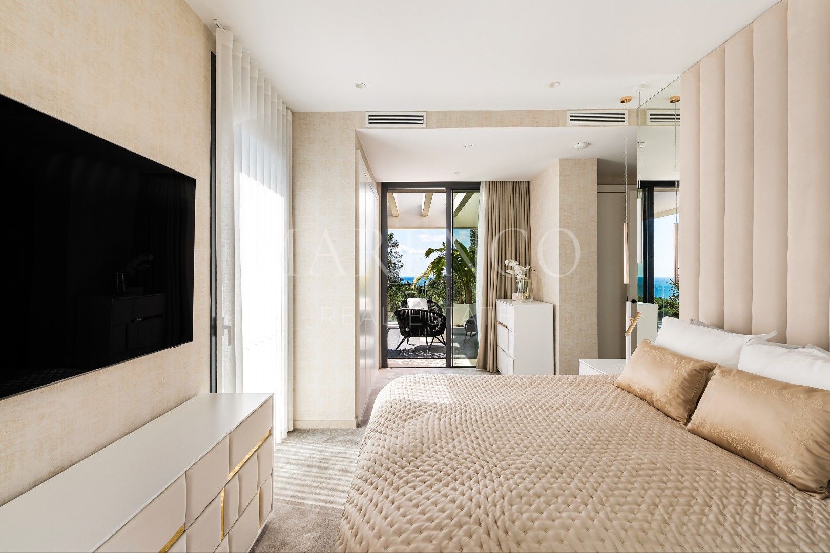 La distribución de la propiedad ofrece tres dormitorios en la planta superior y uno en la planta baja. Desde el área principal de la vivienda, se puede acceder a los diferentes niveles mediante escaleras o utilizando el ascensor interno Tyssenkrupp, que conecta todos los pisos de la propiedad. En la planta superior, se encuentran tres dormitorios, incluyendo la suite principal con baño privado y dos dormitorios adicionales que comparten un baño, ambos con acabados de alta gama de Porcelanosa. Cada dormitorio cuenta con su propia terraza privada, todas con impresionantes vistas al mar y acogedoras zonas de descanso. En la planta baja, hay un dormitorio con baño en suite, una zona de lavandería con electrodomésticos Miele, un espacio de almacenamiento y un amplio garaje privado cerrado. El garaje está equipado con una plataforma giratoria Tyssenkrupp para facilitar la maniobra de los vehículos, y en la entrada cerrada hay espacio adicional para otro coche.