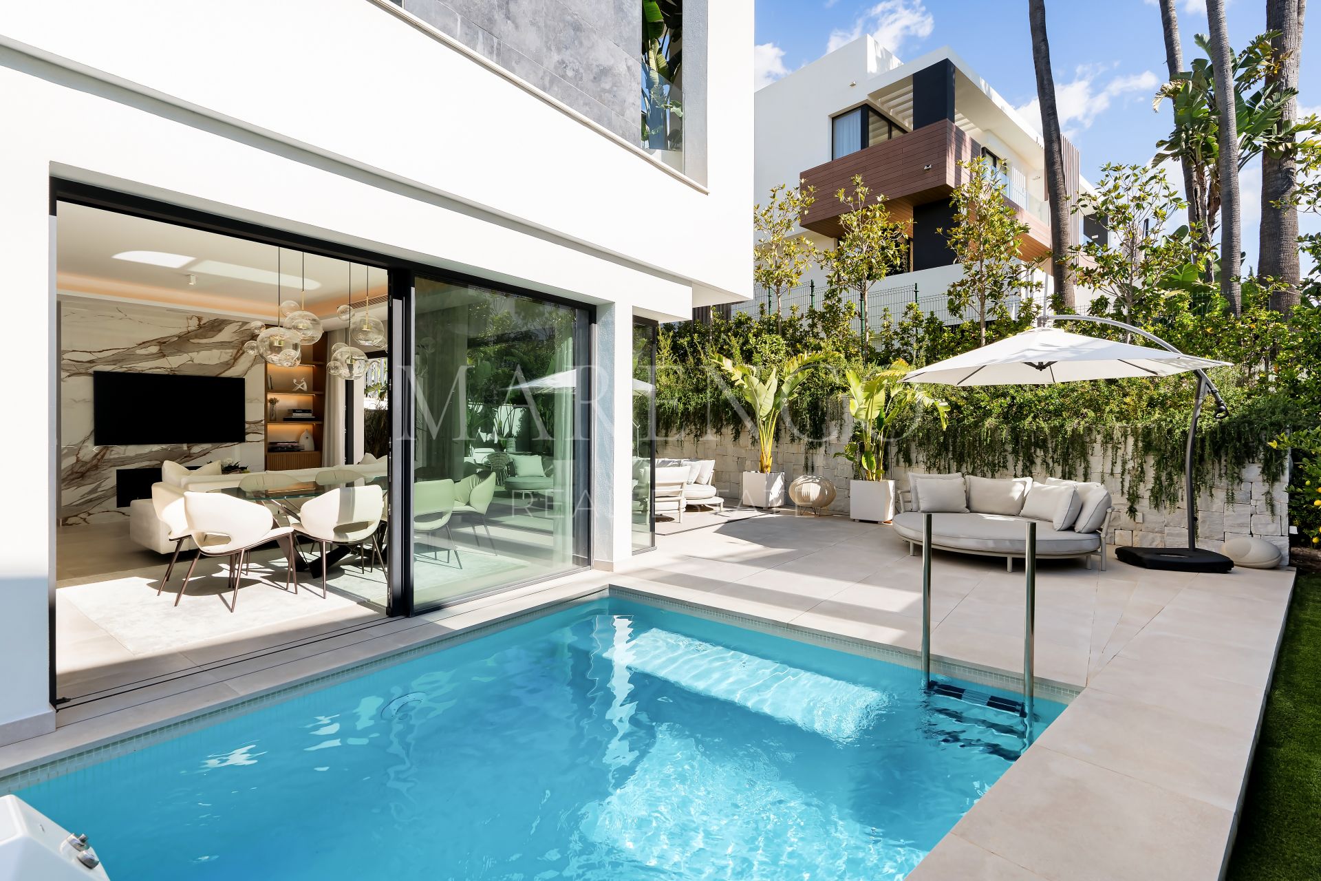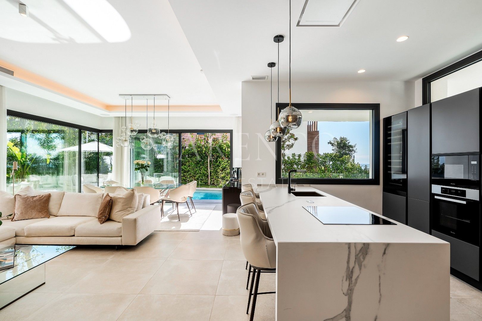 Esta villa fue construida y terminada en 2022, brindando un estilo de vida lujoso en una de las áreas más exclusivas y codiciadas de Marbella. Al ingresar a la propiedad, se percibe de inmediato la calidad en cada detalle. Una moderna cocina a medida con electrodomésticos Miele totalmente integrados da la bienvenida, conectándose con la sala de estar y comedor de concepto abierto, que fluye directamente hacia la amplia terraza, la piscina y el jardín. Gracias a su orientación sur, suroeste y oeste, la luz natural inunda la propiedad, realzada por los ventanales de suelo a techo. Solo se han utilizado las mejores marcas y materiales, como suelos de Porcelanosa tanto en interiores como en exteriores, puertas y ventanas de terraza Cortizo con triple acristalamiento, accesorios de baño Porcelanosa, calefacción por suelo radiante en toda la propiedad, sistemas de aire acondicionado zonificado y un sistema domótico para iluminación y control general. También cuenta con un sistema de sonido y entretenimiento de calidad cinematográfica, carpintería en roble e iluminación ambiental en toda la vivienda.