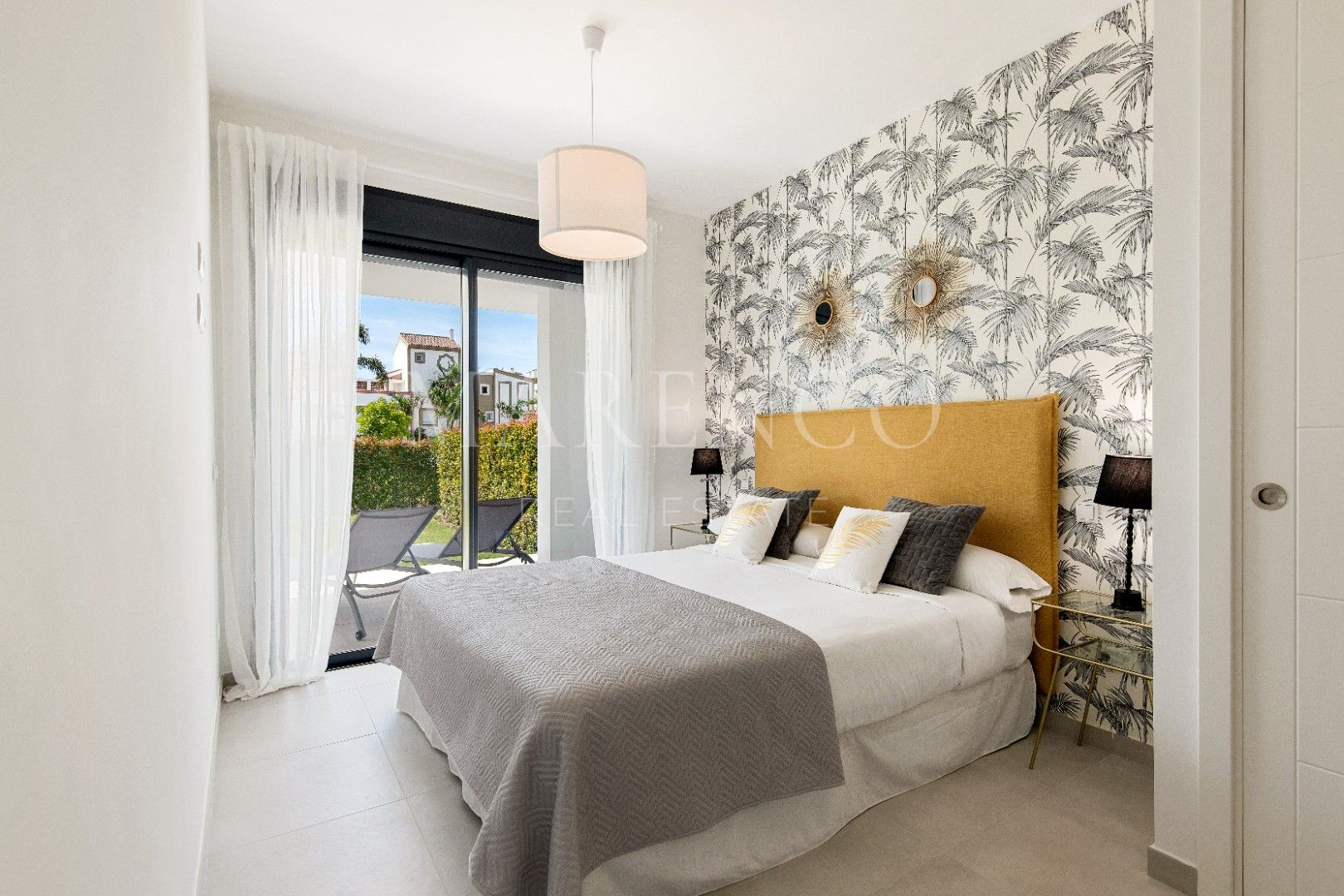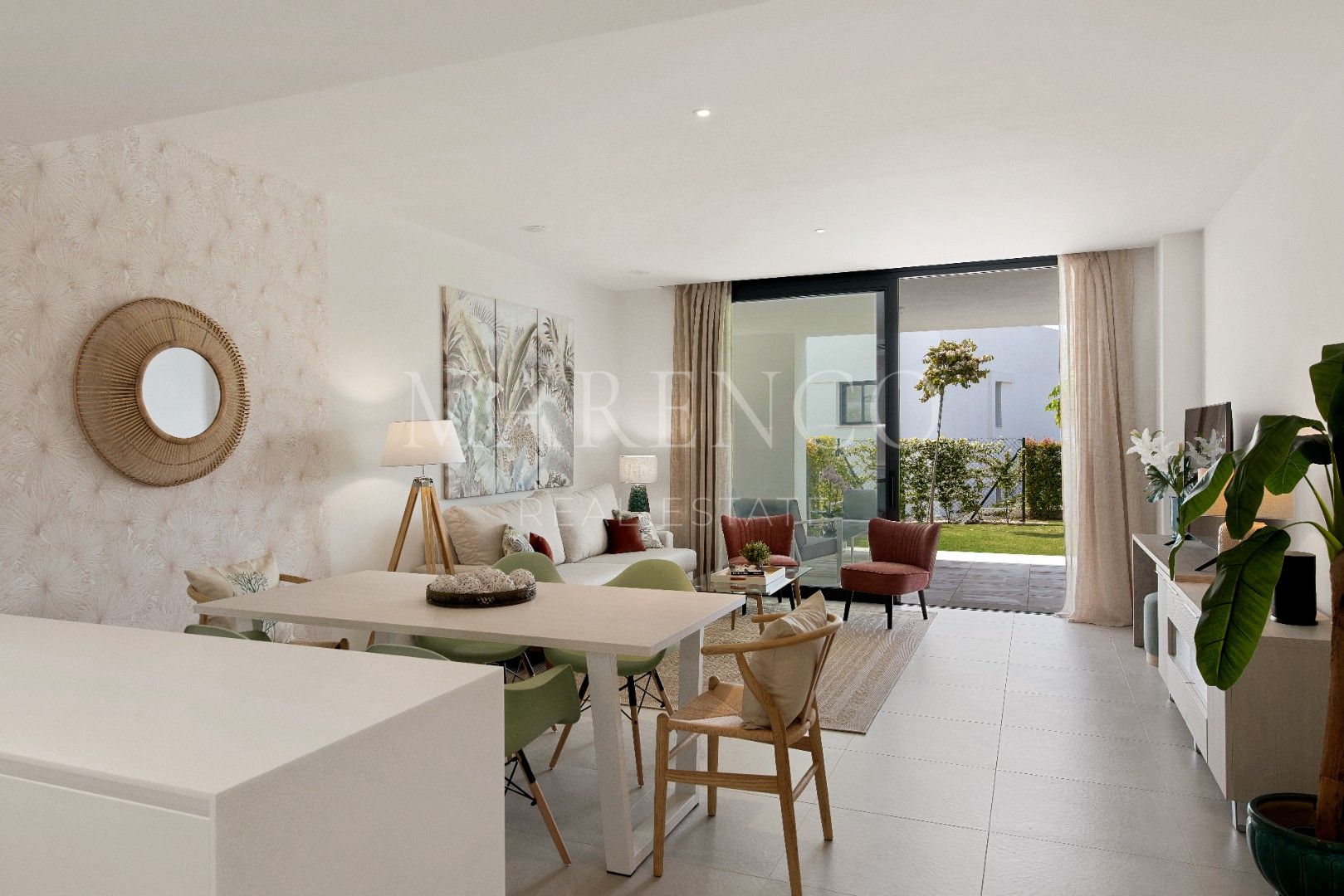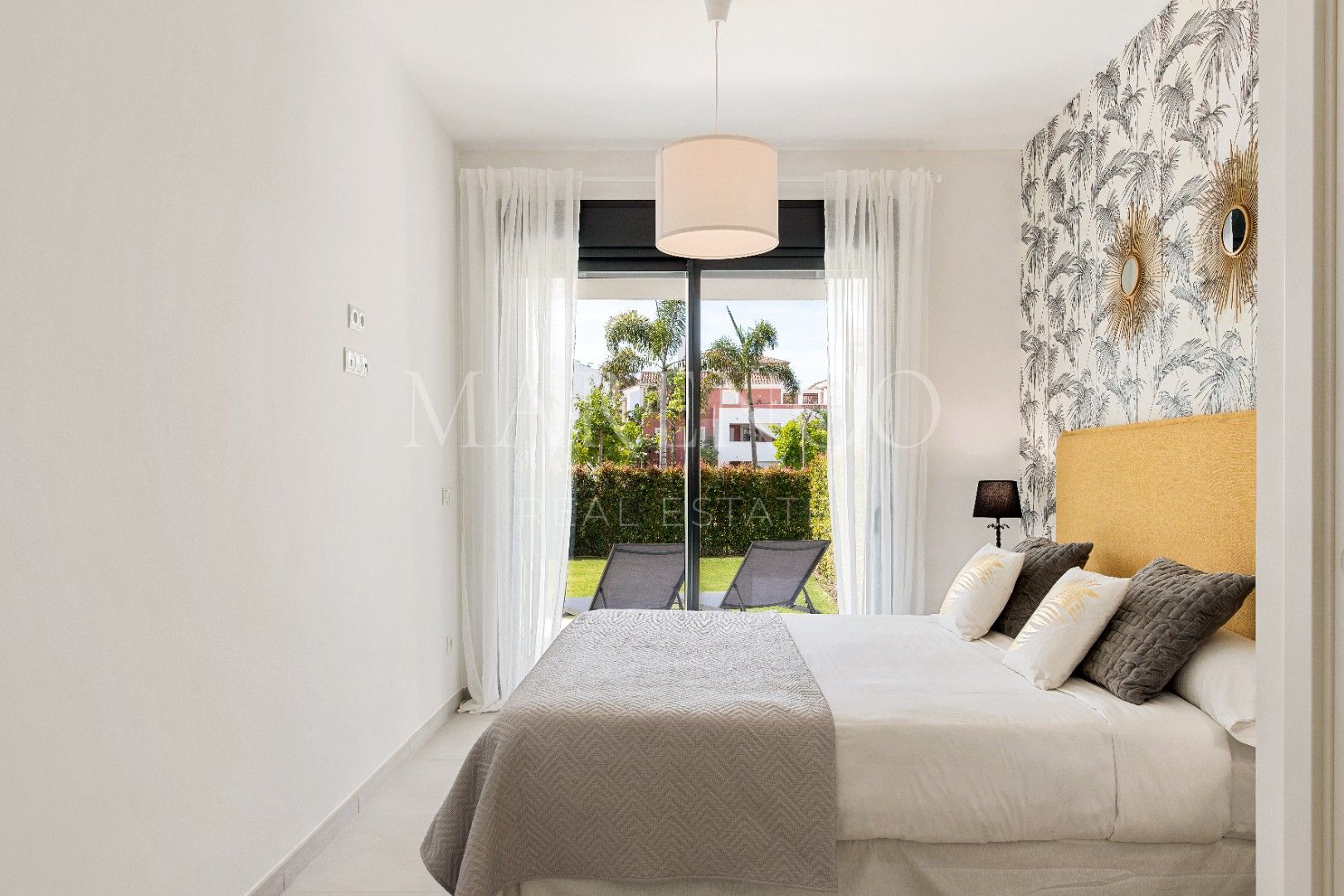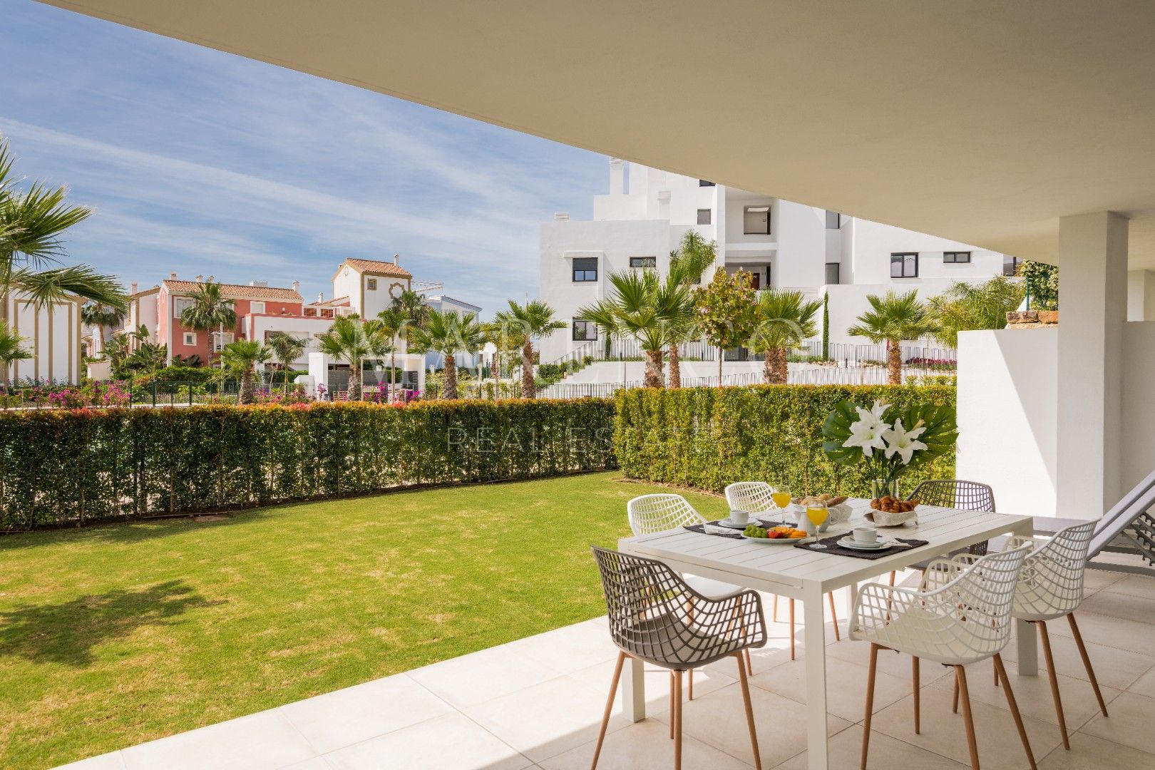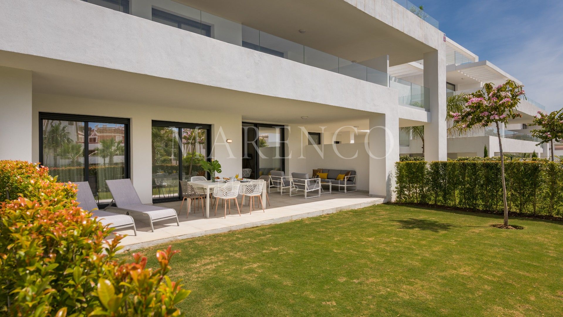 Appartement rez de chaussée à vendre à El Campanario, Estepona Est avec 2 Chambres, 2 Salles de bain et a piscine (communautaire), garage (communautaire) et garden (communautaire). Dimensions: 97.35m² construit, 83.23m² interior et 40.85m² terrasse.