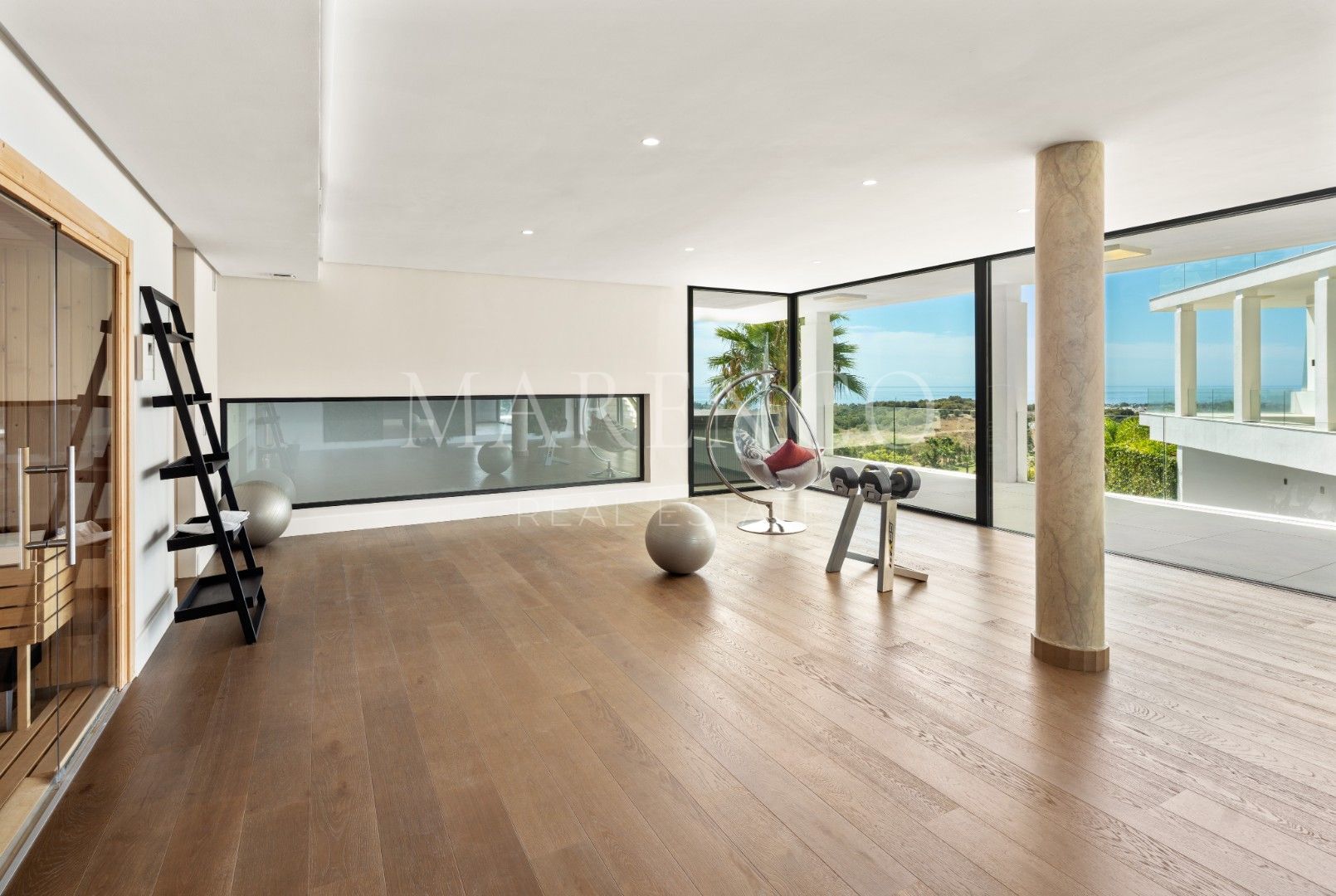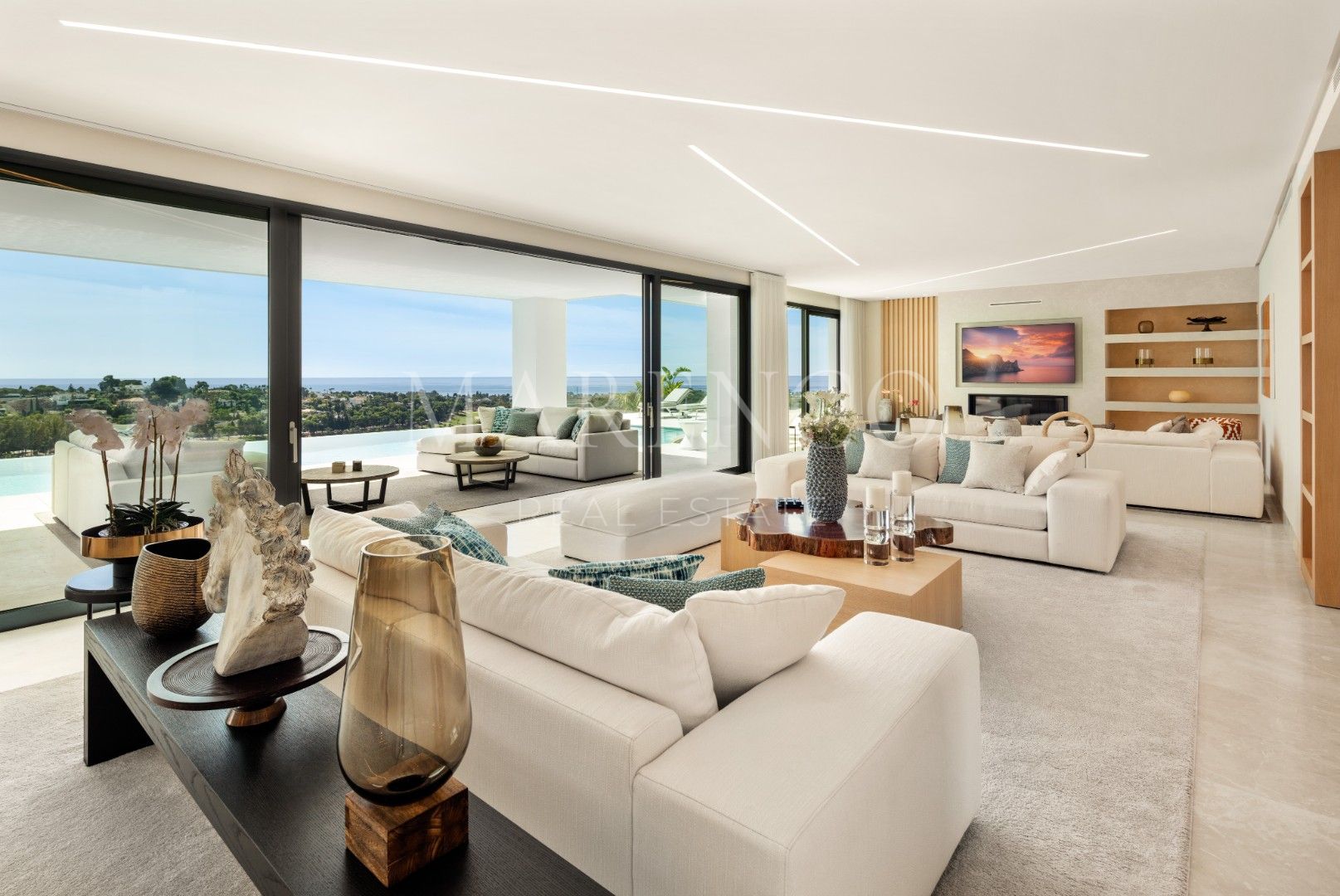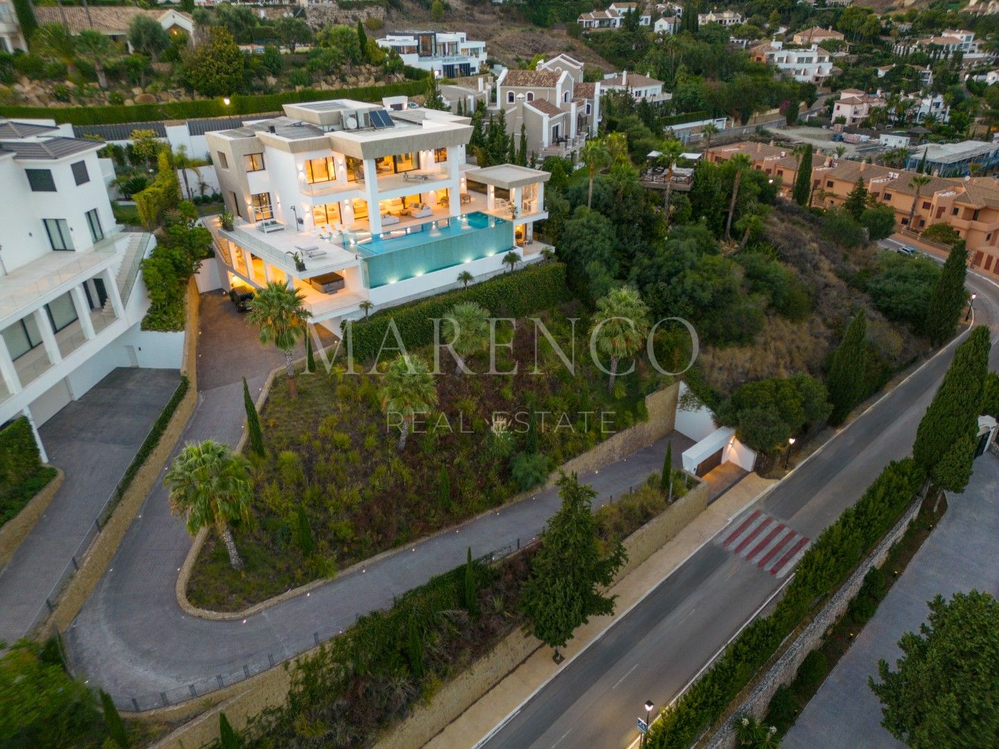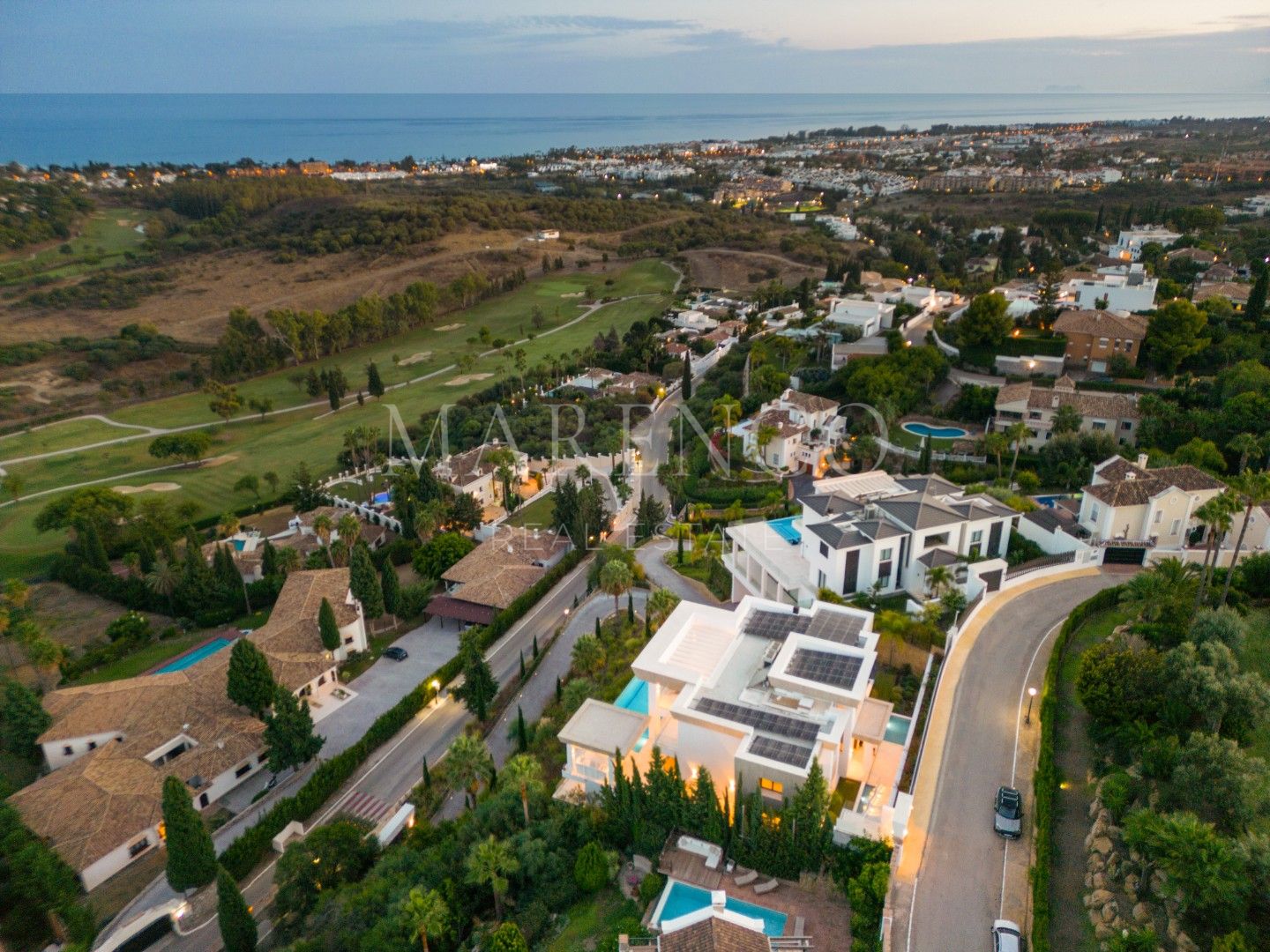 Élégamment perchée à El Paraíso, cette villa contemporaine offre des vues panoramiques à couper le souffle depuis son point de vue élevé. Les vues s’étendent sur le parcours de golf d’El Paraíso, la majestueuse montagne La Concha, la côte et la mer Méditerranée.