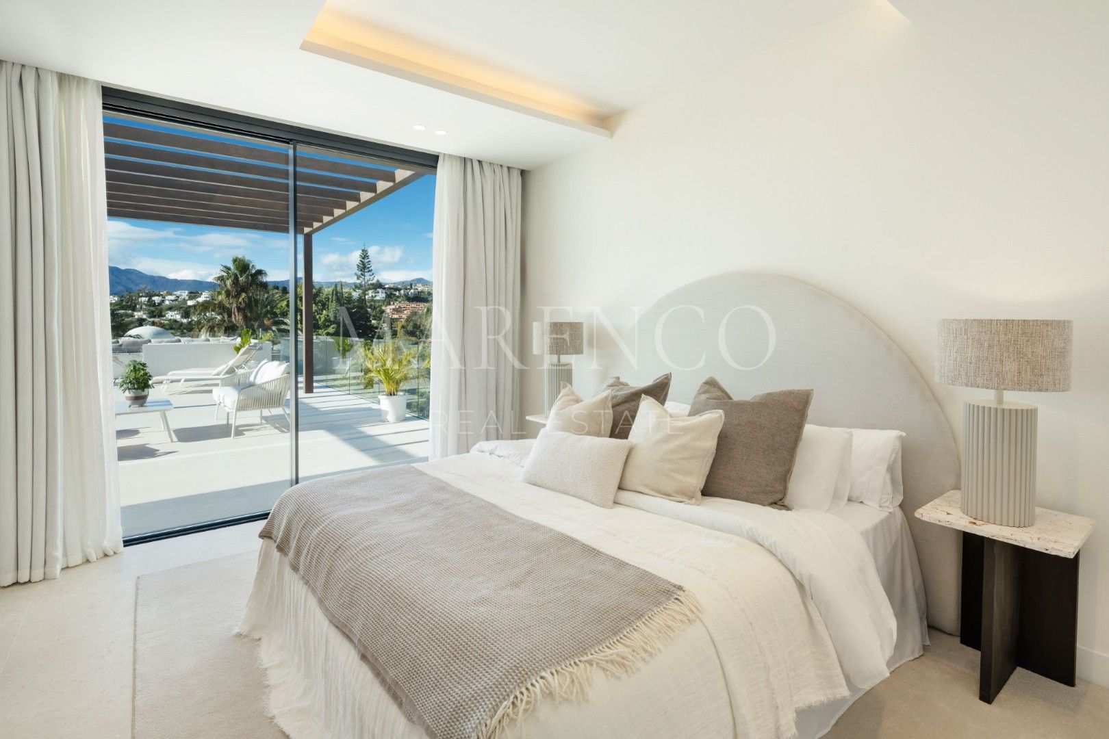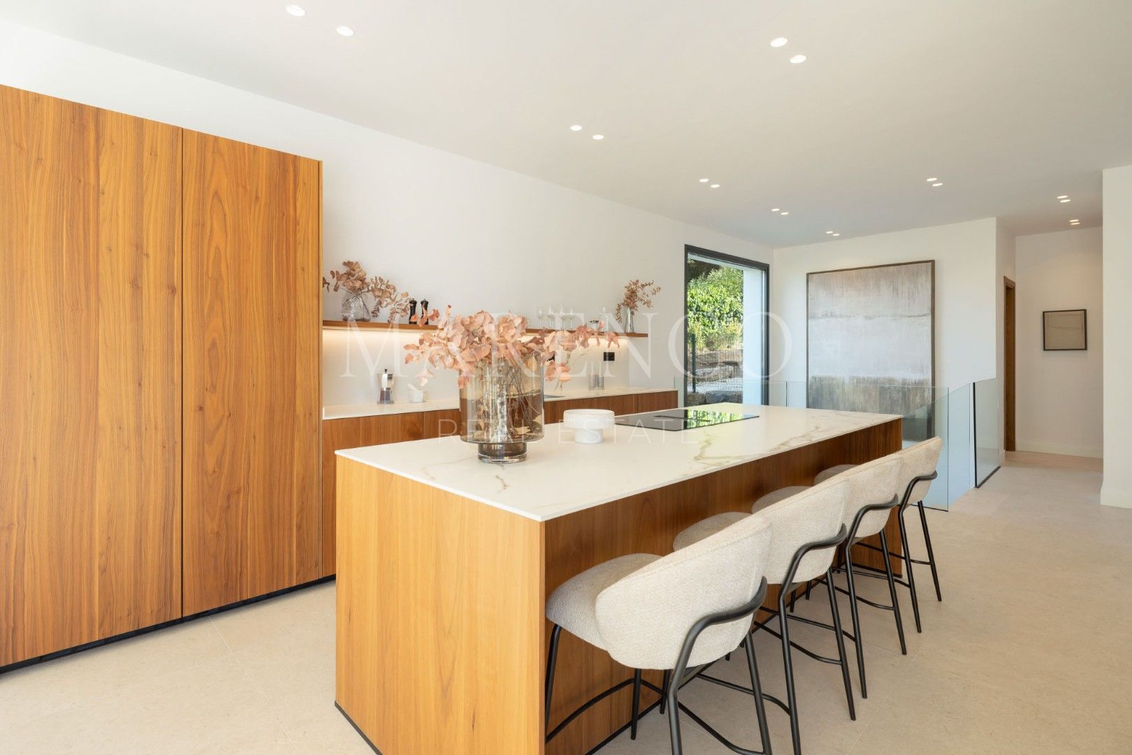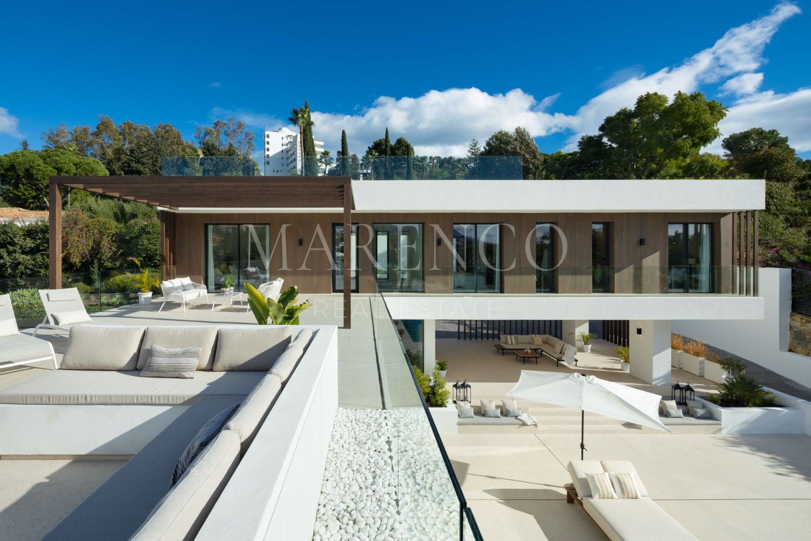 Répartie sur trois niveaux, la propriété offre 367 m² de surface intérieure construite sur un terrain de 1 540 m², ainsi que 531 m² de terrasses qui enrichissent considérablement l’expérience de la maison. Elle dispose de 5 chambres en suite et de 7 salles de bains, avec une distribution très confortable : trois chambres se trouvent à l’étage supérieur et deux au rez-de-chaussée, complétées par deux toilettes invités. Les espaces intérieurs sont lumineux, spacieux et élégants, avec de grandes baies vitrées, une palette neutre et un espace de vie ouvert qui intègre naturellement et de manière très fonctionnelle le salon, la salle à manger et la cuisine.