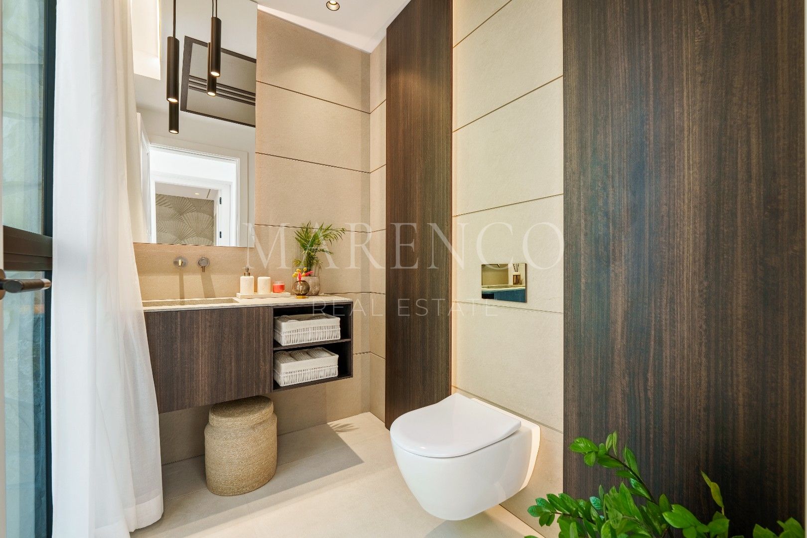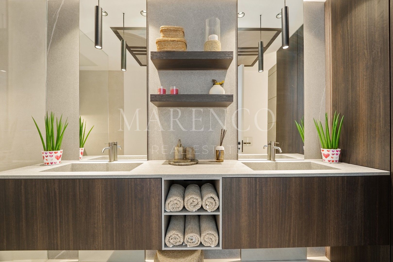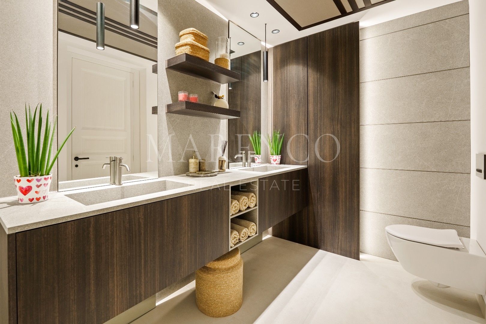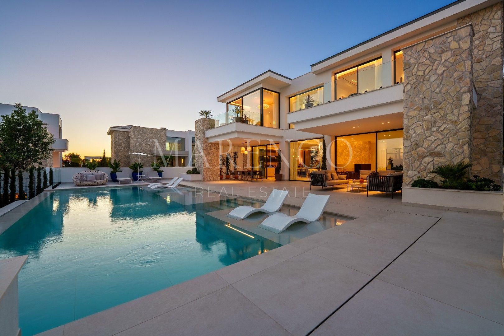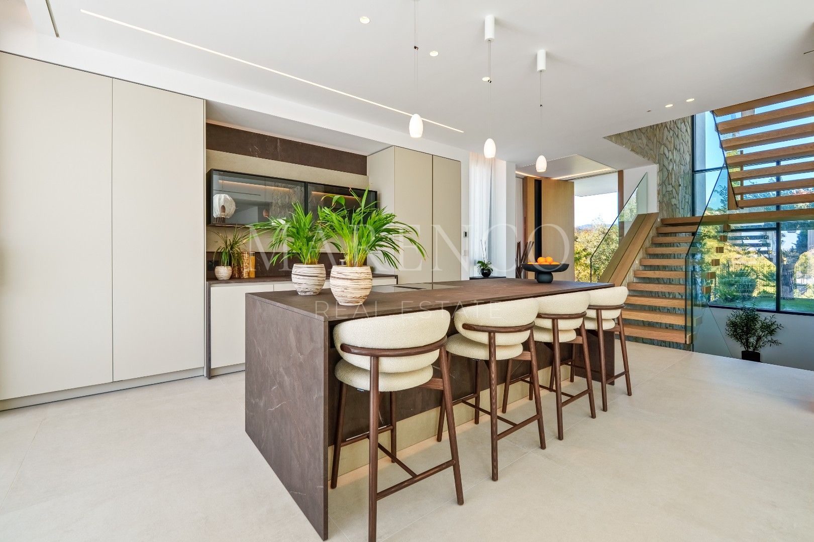 Avec 606 m² construits sur un terrain de 1 210 m² et 307 m² de terrasses, la propriété se répartit sur trois niveaux soigneusement conçus. Elle dispose de 5 chambres, 4 salles de bains et 1 toilette invités, avec des intérieurs spacieux, lumineux et fluides. L’espace principal réunit le salon, la salle à manger et la cuisine dans un volume ouvert qui se prolonge naturellement vers l’extérieur, créant une continuité très agréable entre l’intérieur et la terrasse. À l’étage supérieur, les chambres offrent une atmosphère plus intime et sereine, la suite principale se distinguant par sa terrasse privée, son dressing et ses vues dégagées.