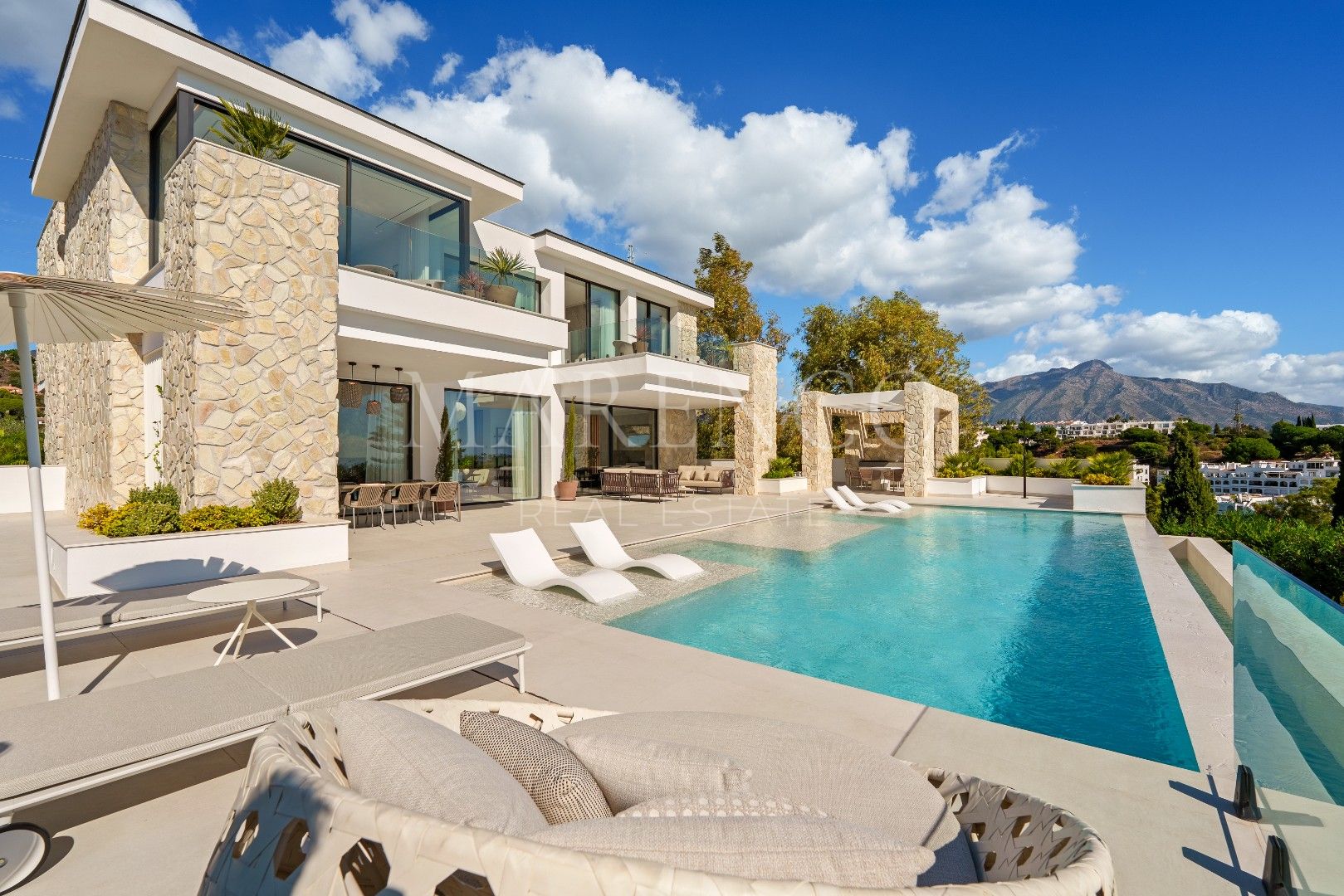 L’un des grands atouts de cette villa de luxe réside dans son magnifique espace extérieur, conçu pour profiter du climat de la Costa del Sol tout au long de l’année. Les vastes terrasses et la spectaculaire piscine à débordement de 73 m² font de chaque journée une invitation à se détendre, à partager et à contempler l’environnement. L’orientation sud-est, associée aux grandes baies vitrées du sol au plafond, renforce l’entrée de lumière naturelle et souligne le caractère contemporain de la maison.