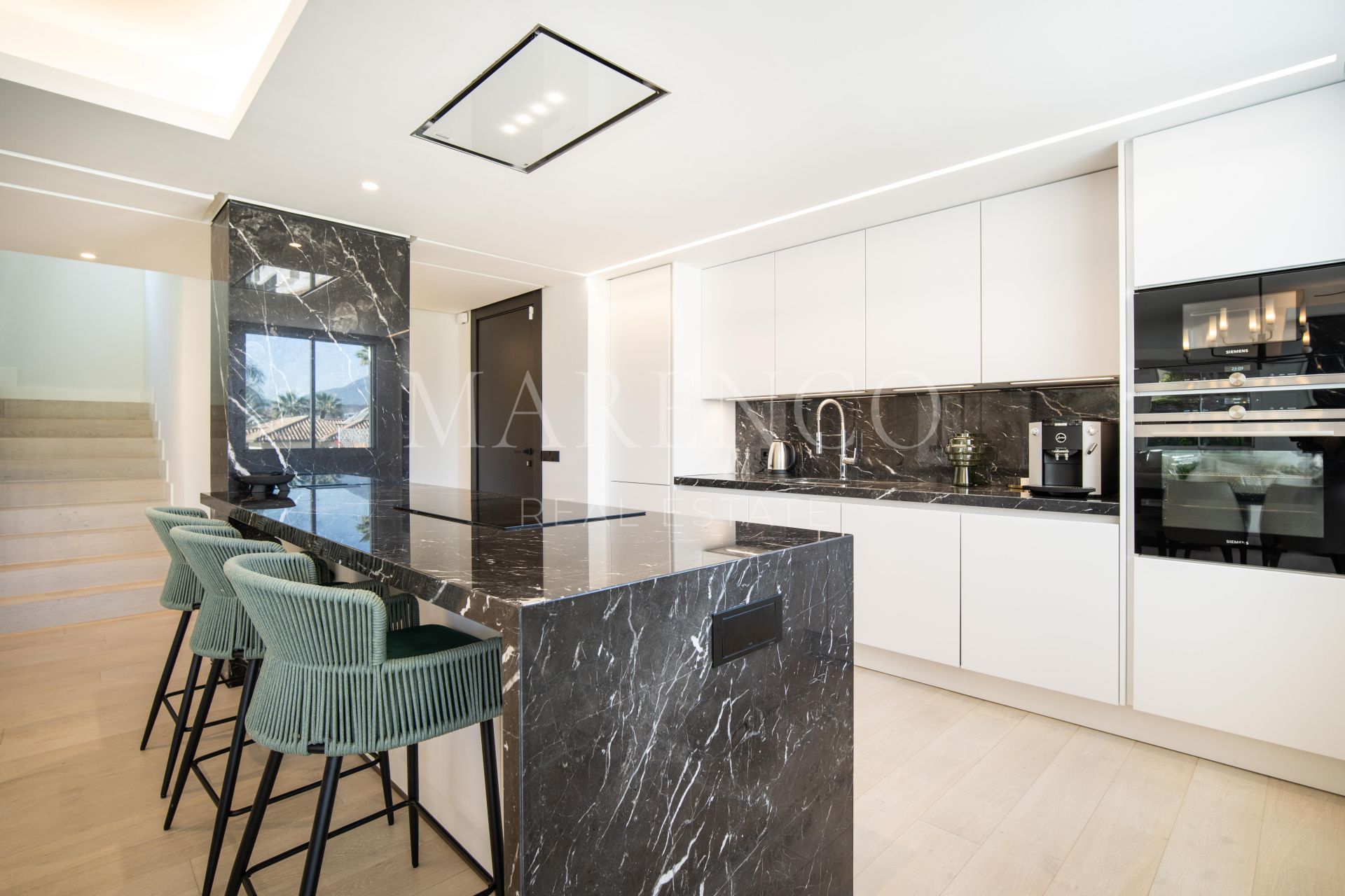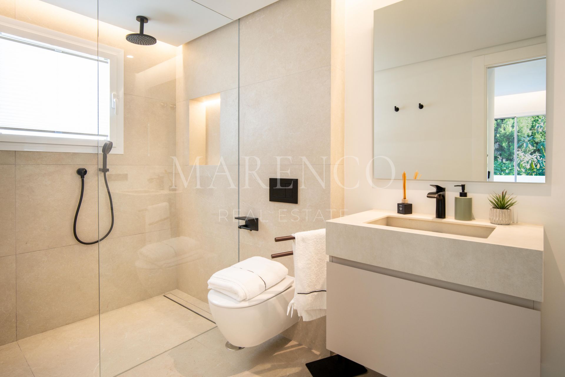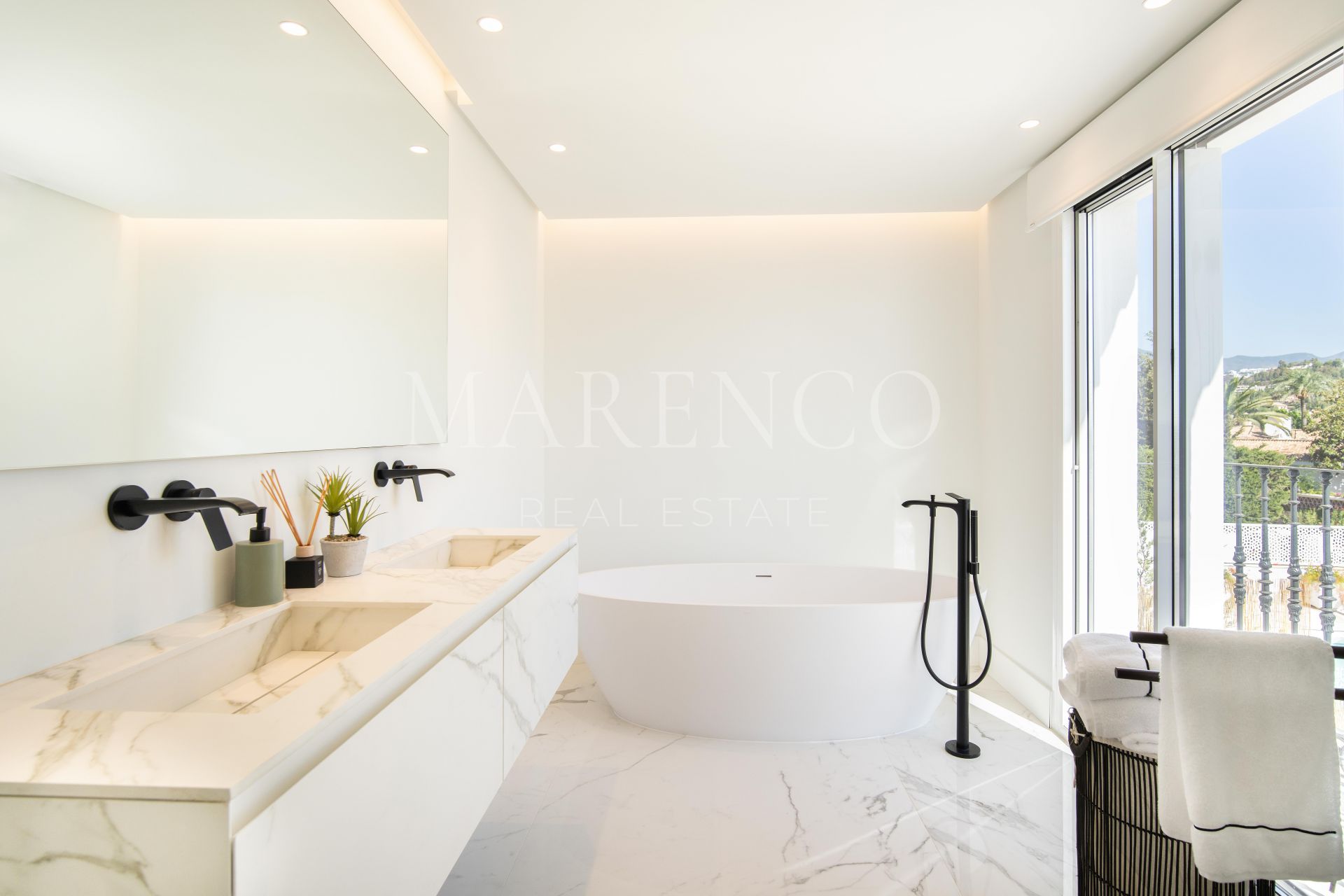 À l’étage, la villa dévoile ses prestations les plus exclusives. Deux suites supplémentaires occupent cet espace, dont la chambre principale avec accès direct à une terrasse privée offrant une vue pittoresque sur La Concha. Un grand solarium complète la maison, parfait pour profiter du soleil toute la journée tout en admirant la vue dégagée sur le parcours de Las Brisas. À l’extérieur, un jardin luxuriant entoure une vaste piscine privée, complété par un porche couvert idéal pour les repas en plein air. La propriété dispose également d’un sauna finlandais flambant neuf avec accès direct au jardin et à la piscine, conçu pour des moments de détente absolue.