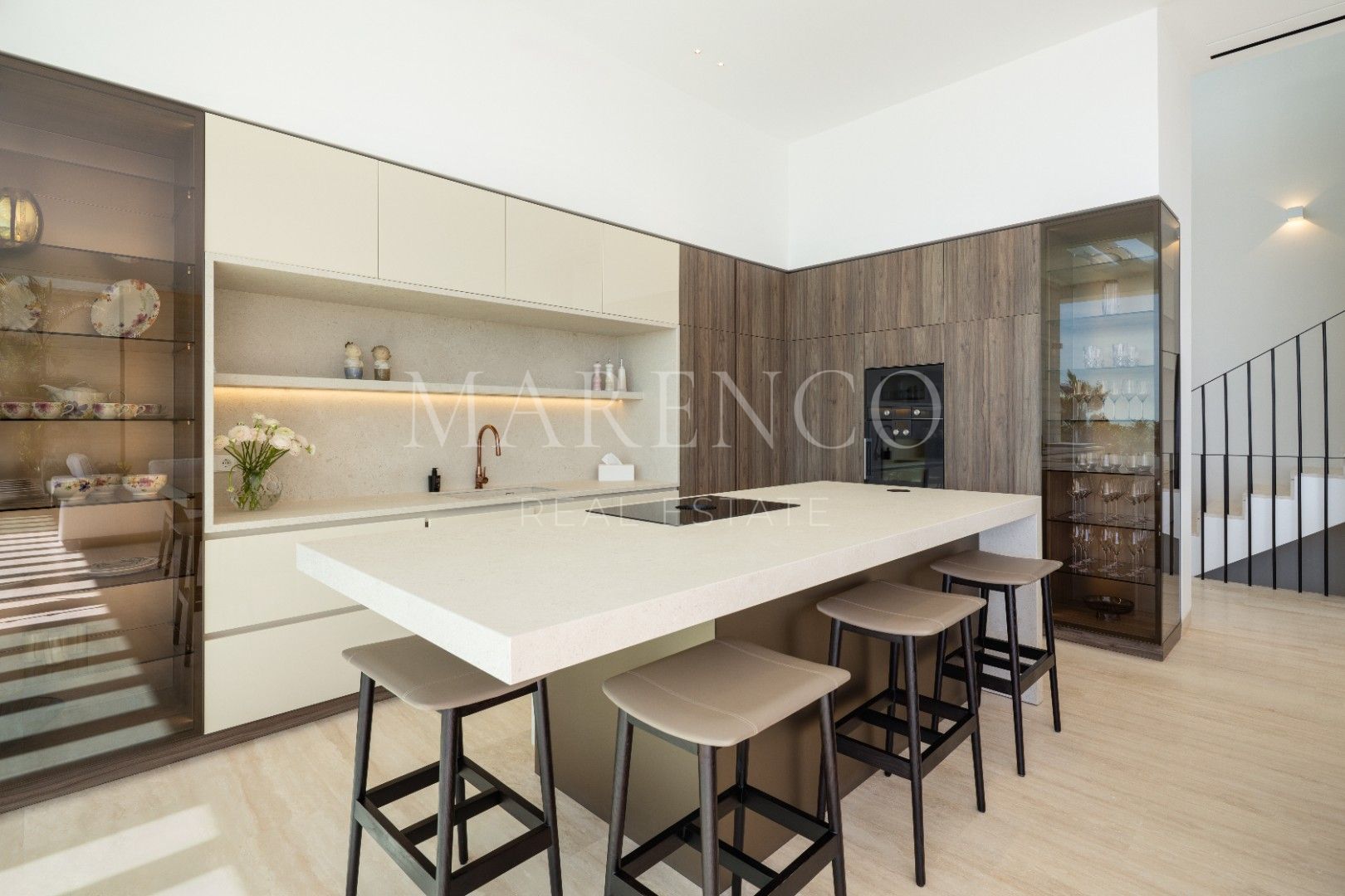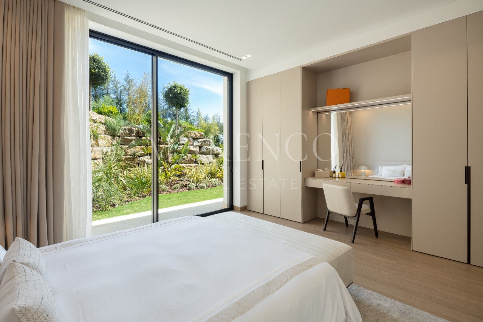 À l’intérieur, la disposition ouverte assure une circulation fluide entre les espaces salon, salle à manger et cuisine, sublimée par de grandes baies vitrées coulissantes qui relient l’intérieur aux terrasses. Le design se distingue par une palette neutre et raffinée, ainsi que par des finitions haut de gamme. Avec six chambres spacieuses au style élégant, cette villa marie confort et esthétique contemporaine.
