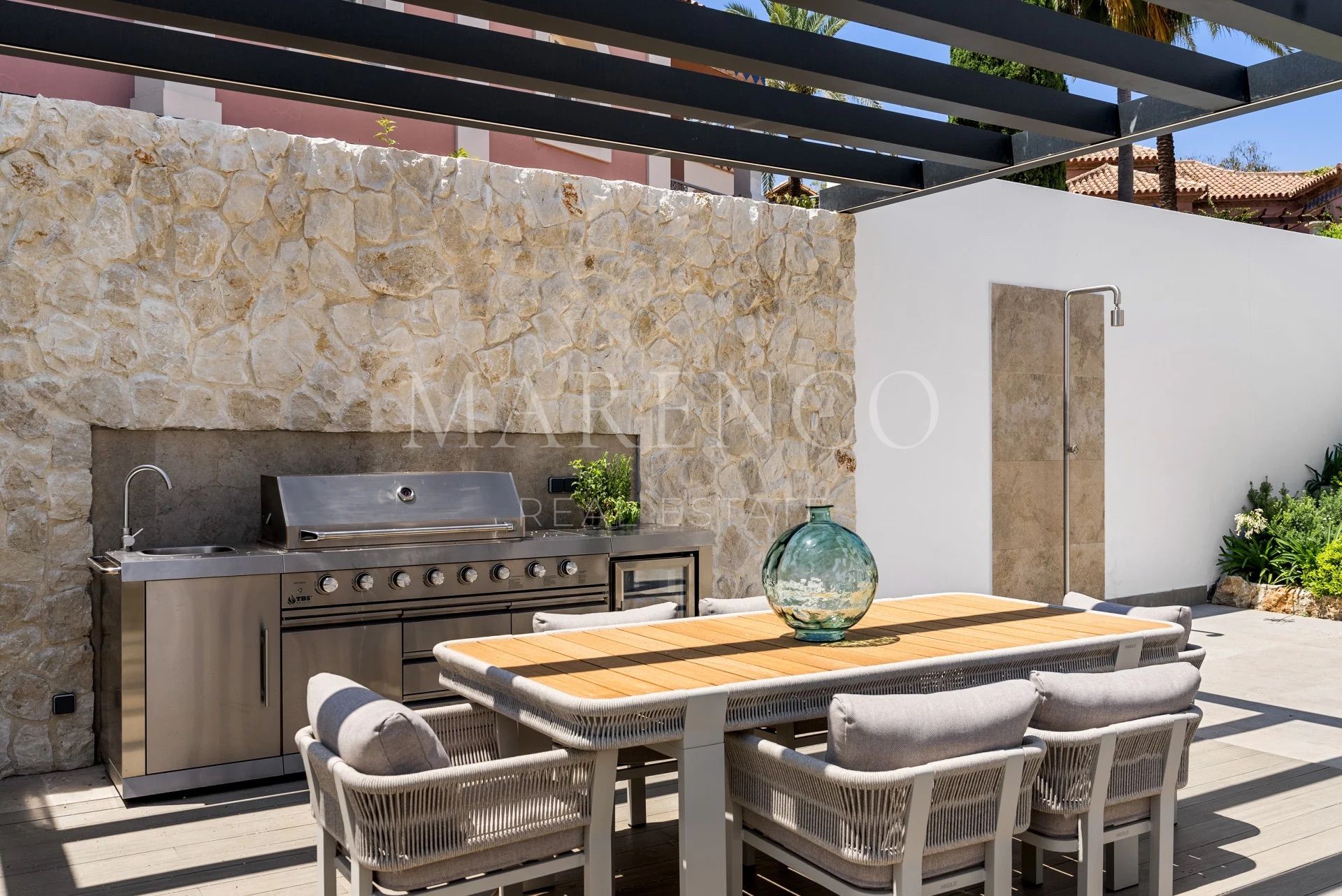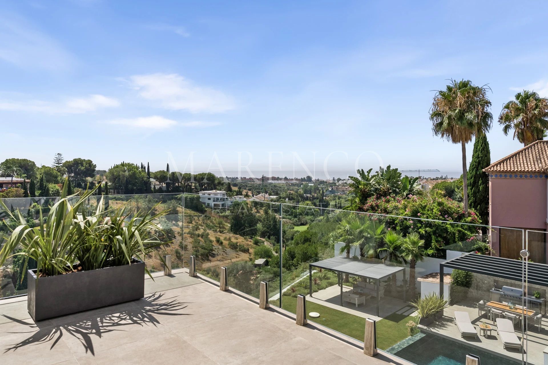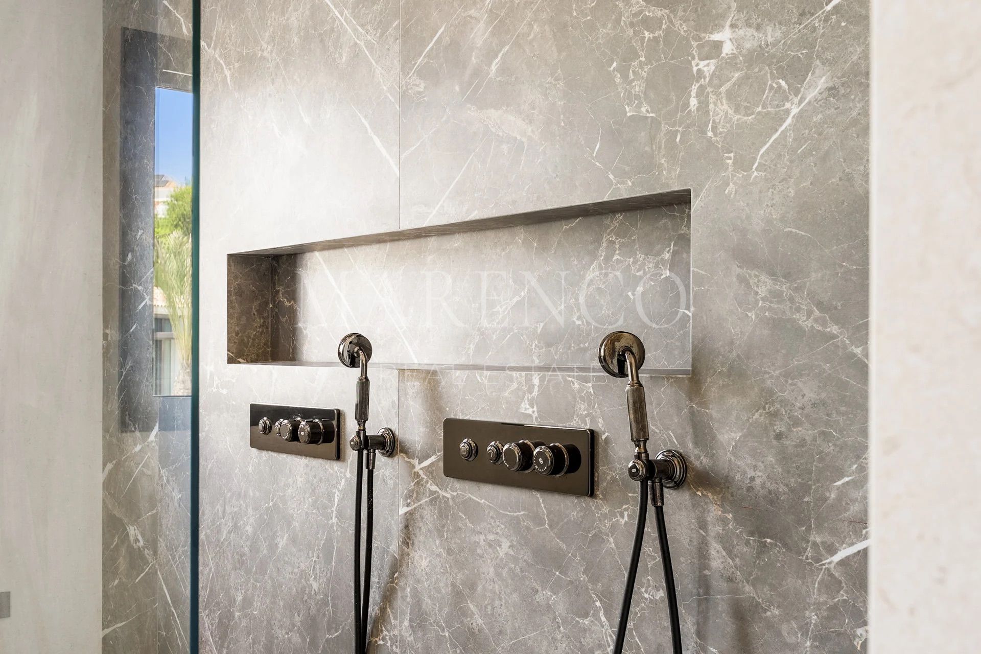 Les salles de bains sont équipées de robinetterie Gessi et de carreaux en porcelaine italienne grand format, reflétant le haut niveau de finitions de la propriété. À l’extérieur, le jardin paysager encadre une piscine d’eau salée chauffée et de vastes terrasses pensées pour la vie en plein air, idéales pour profiter du climat méditerranéen toute l’année en toute intimité.