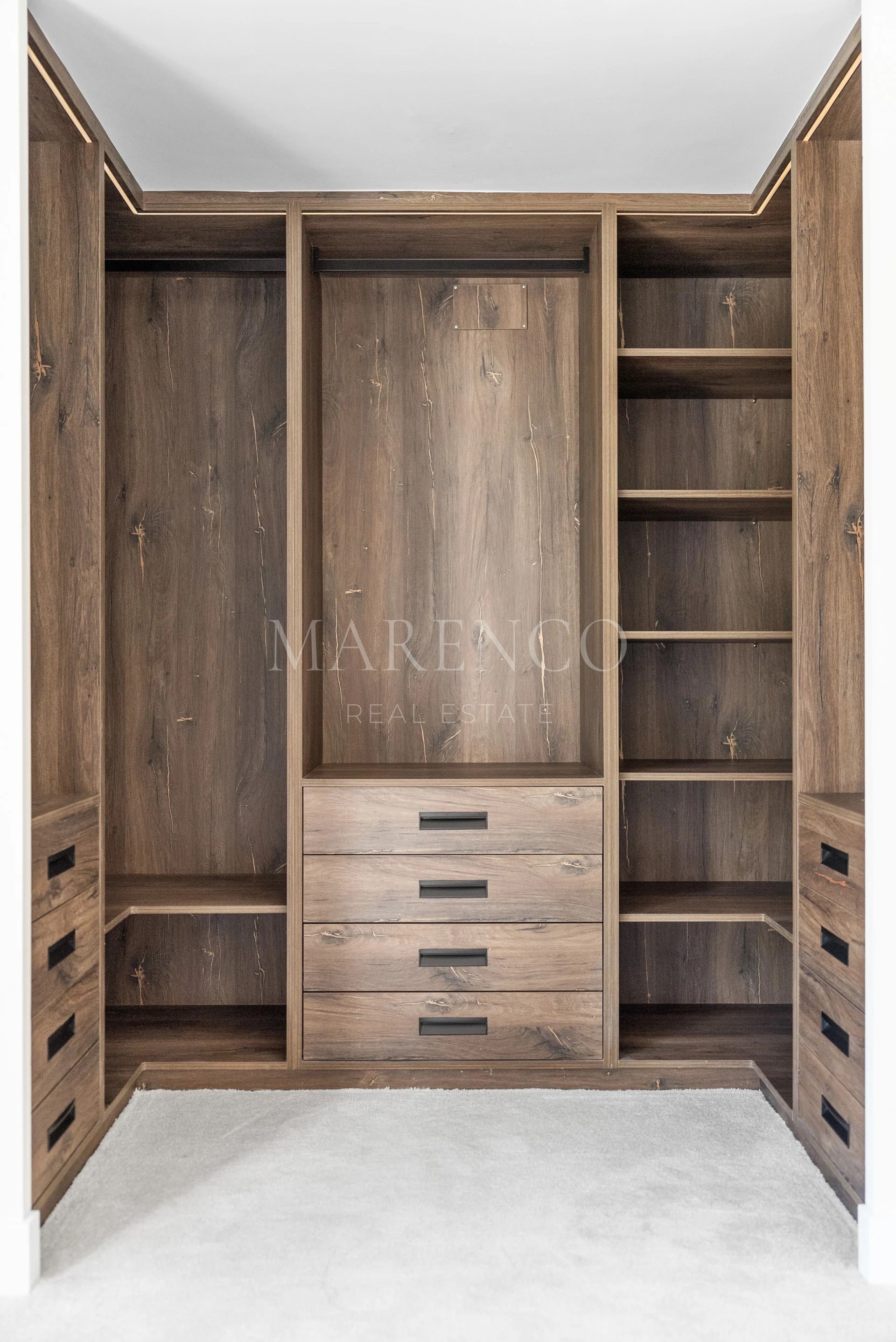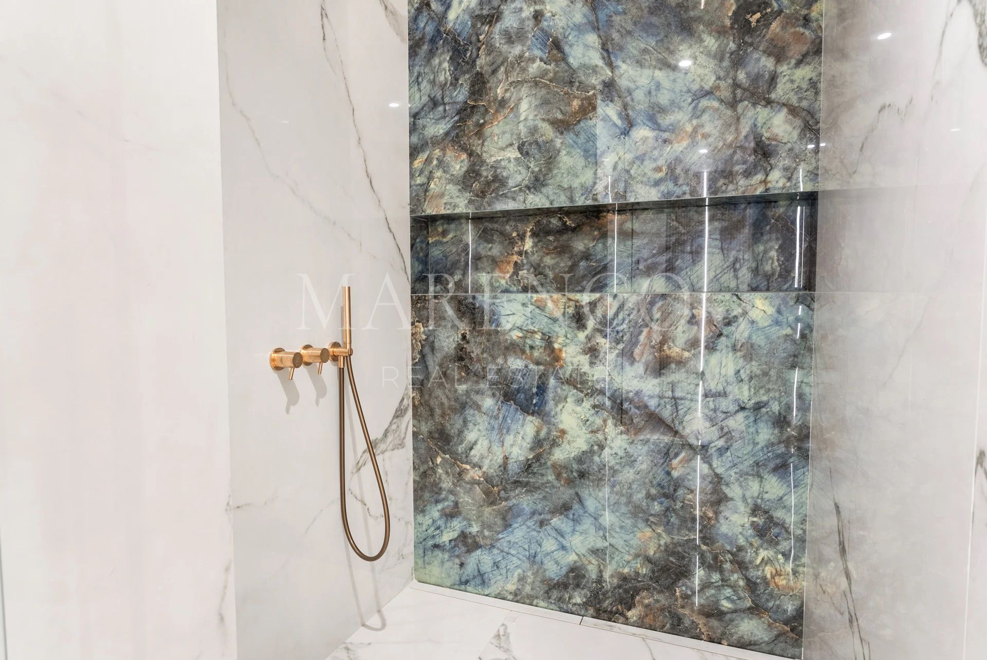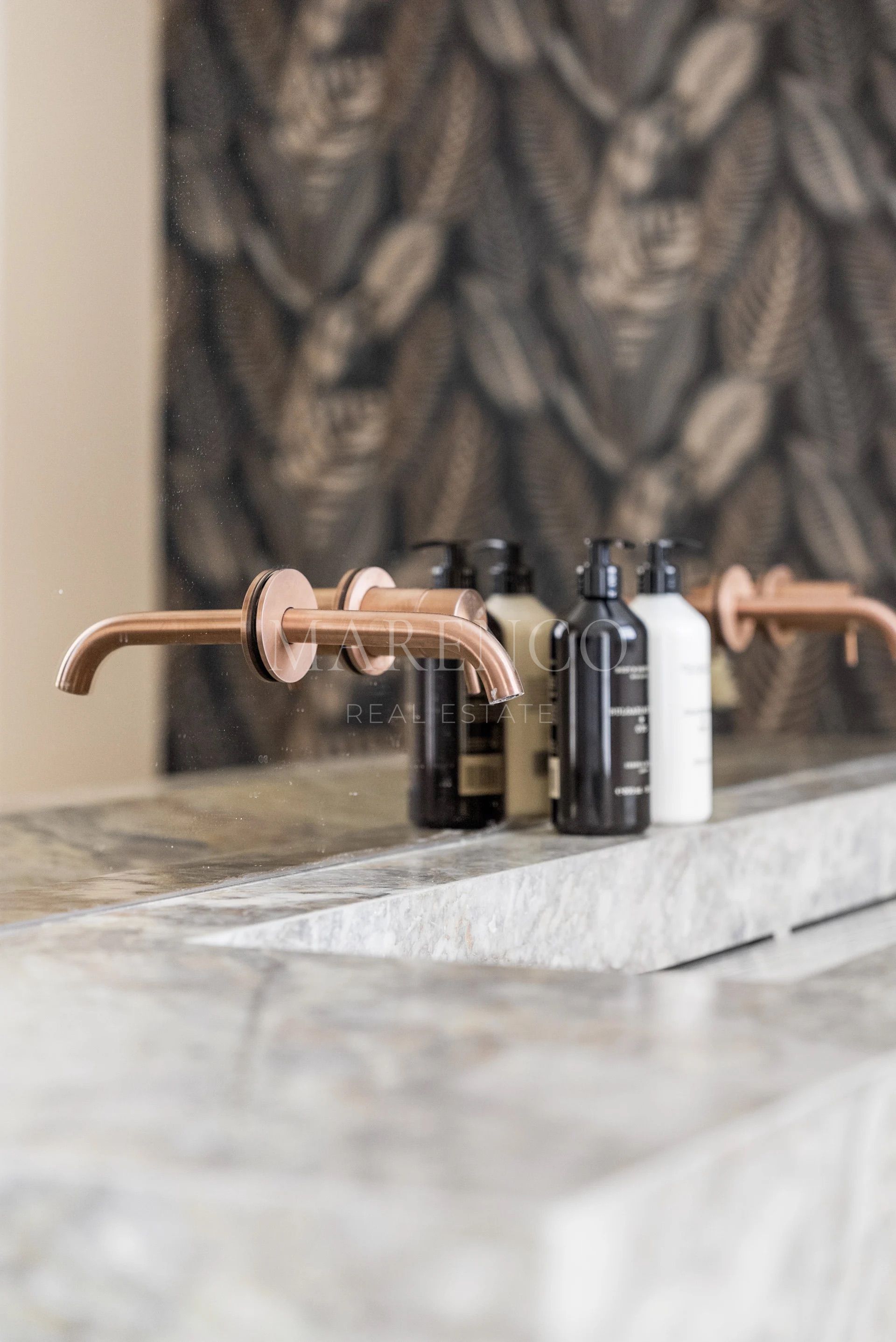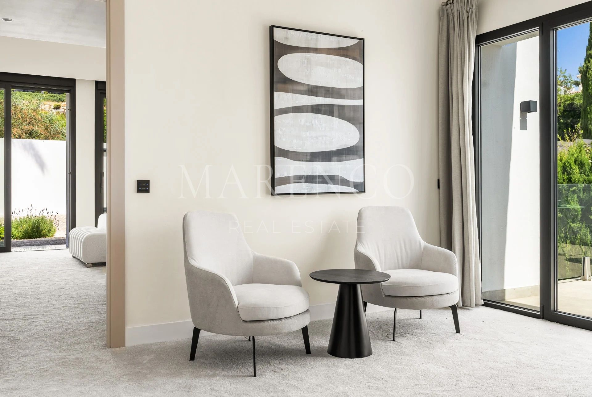 Les salles de bains sont équipées de robinetterie Gessi et de carreaux en porcelaine italienne grand format, reflétant le haut niveau de finitions de la propriété. À l’extérieur, le jardin paysager encadre une piscine d’eau salée chauffée et de vastes terrasses pensées pour la vie en plein air, idéales pour profiter du climat méditerranéen toute l’année en toute intimité.