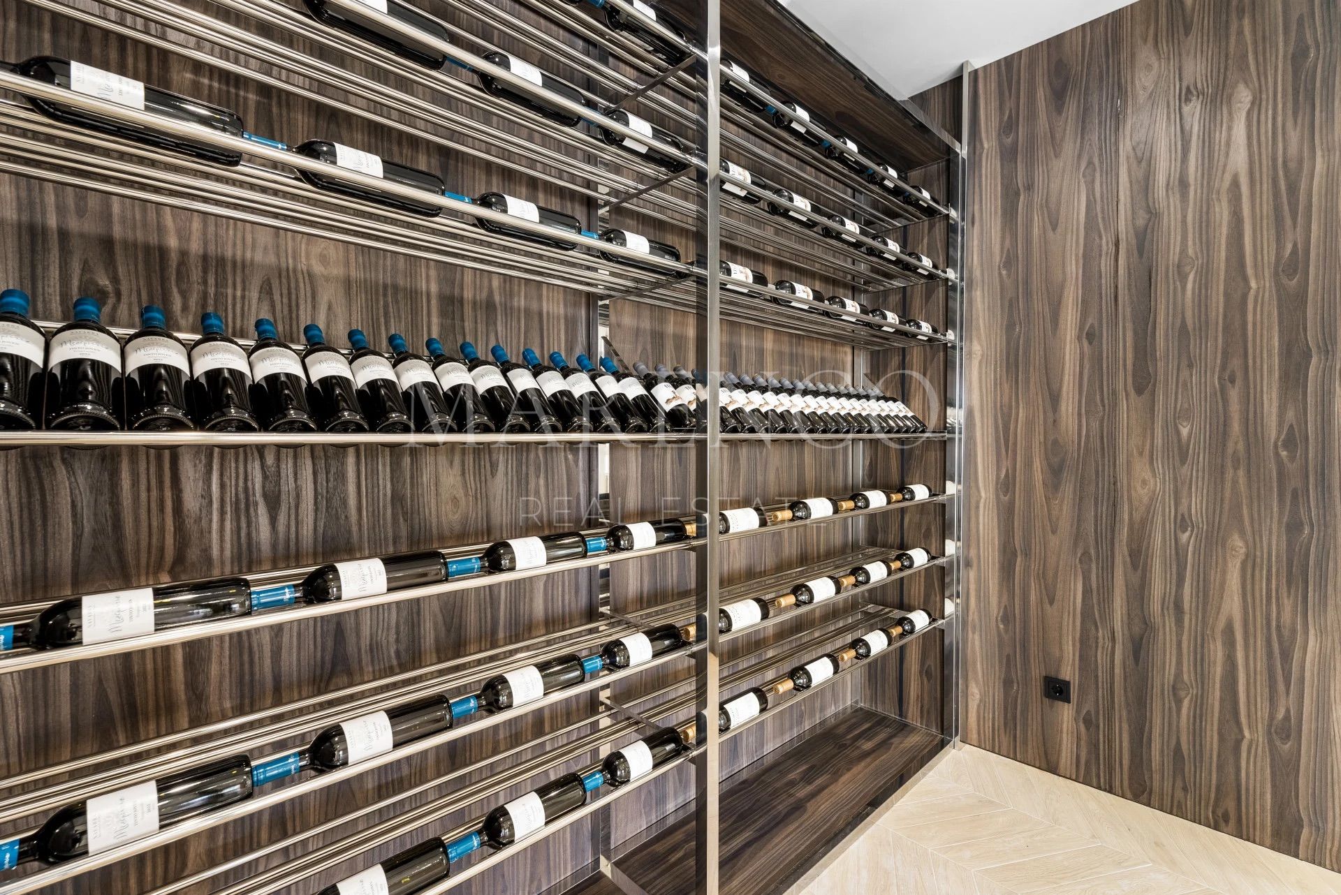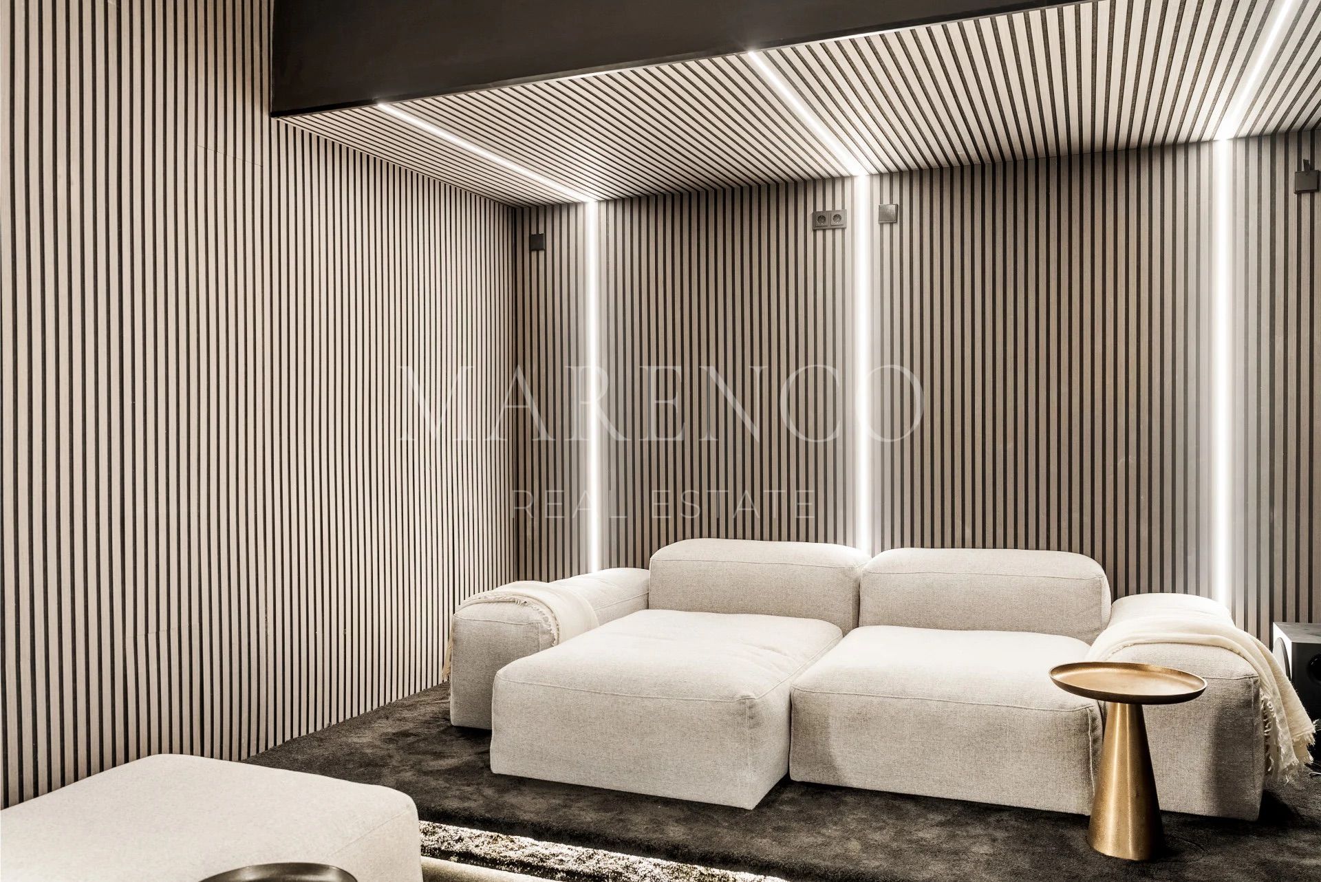 Le niveau inférieur prolonge les espaces de vie avec un second salon doté d’une kitchenette, une salle de cinéma privée et une salle de sport entièrement équipée avec hammam et douche, créant un véritable espace bien-être et loisirs au sein de cette villa de luxe à Los Flamingos, Benahavís. Une buanderie et des espaces fonctionnels complètent l’ensemble.