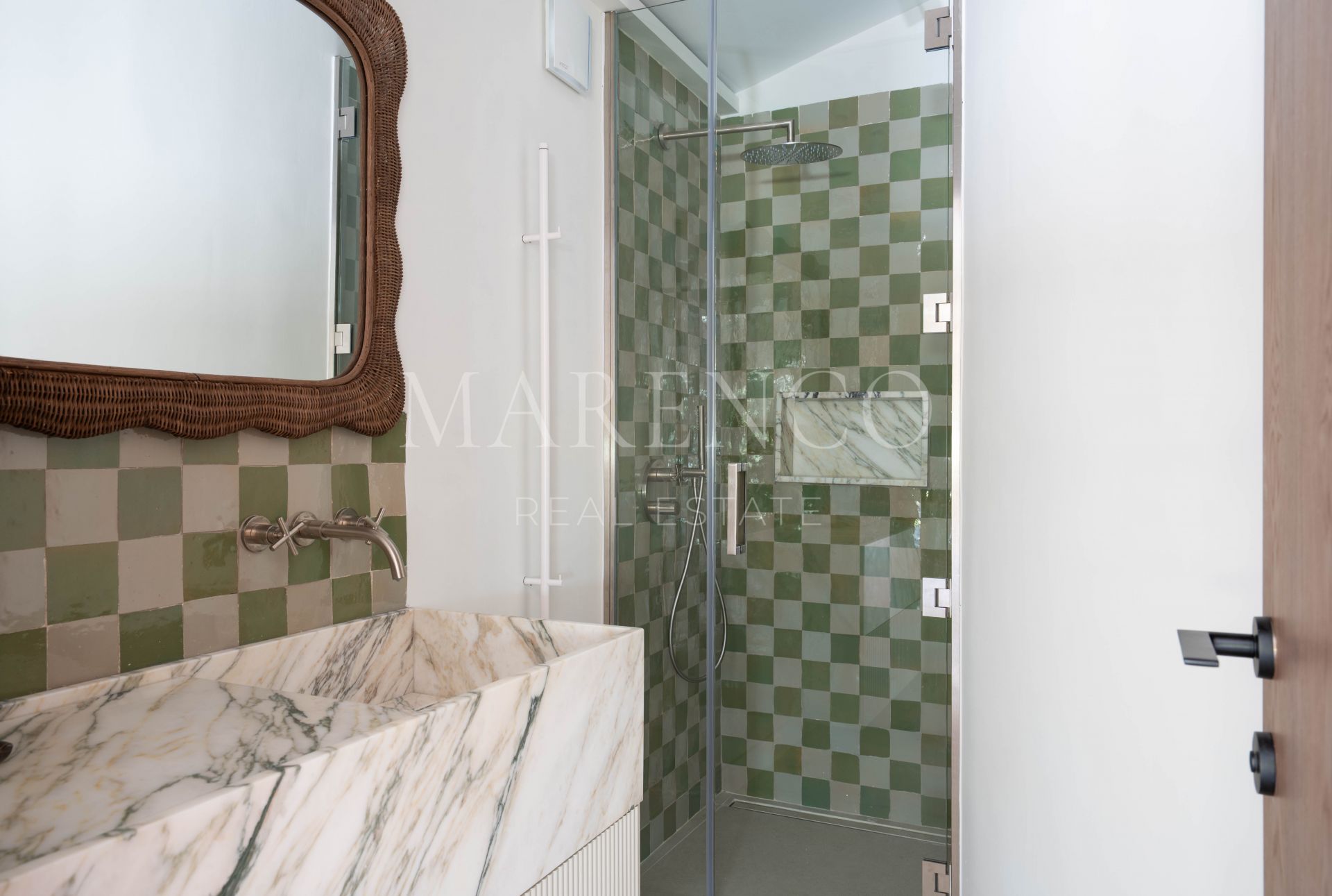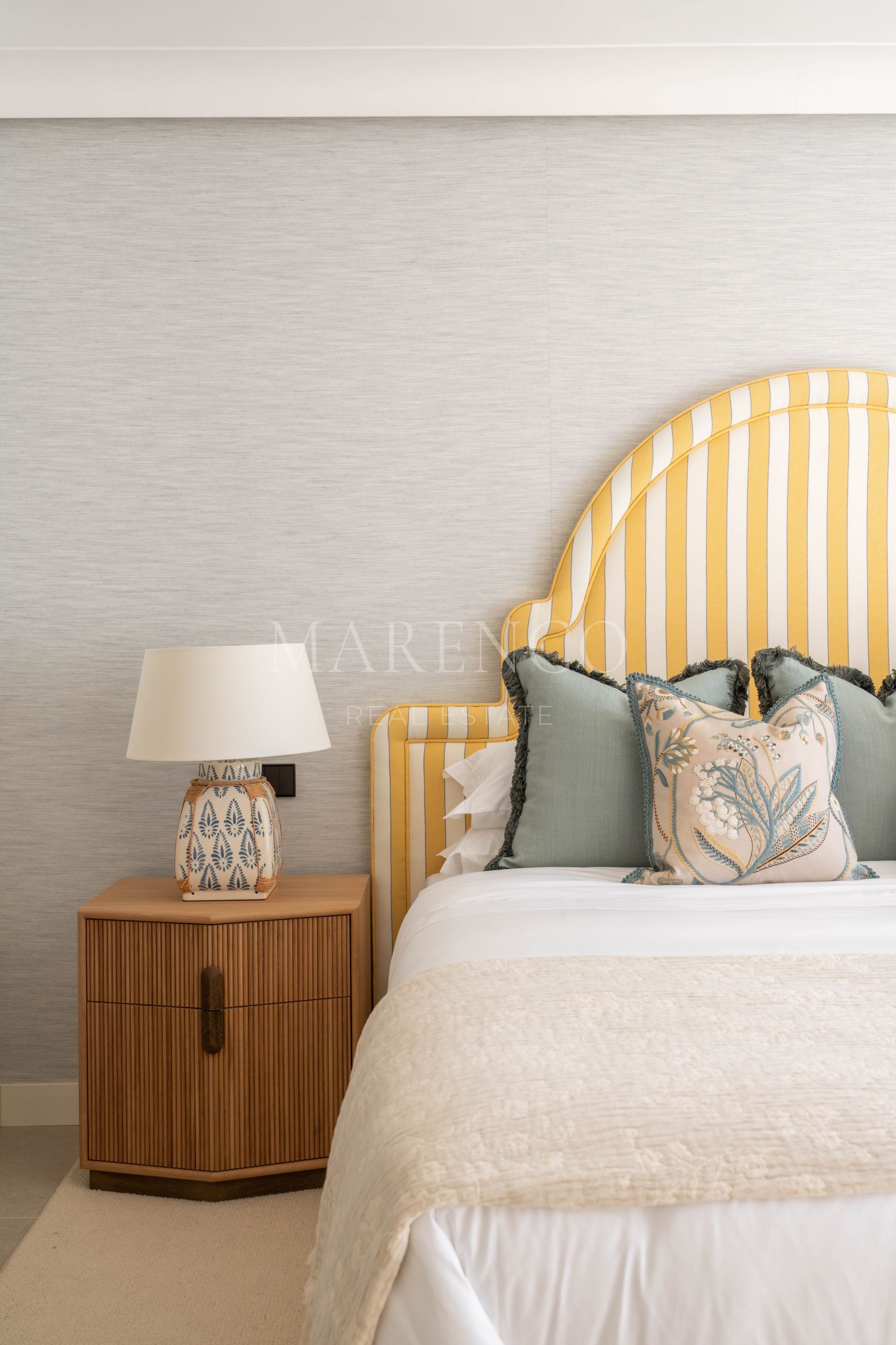 L’étage supérieur accueille deux suites supplémentaires, toutes deux avec vue panoramique sur la mer. La suite principale se distingue par son atmosphère méditerranéenne, sa salle de bains en suite et son dressing sophistiqué. La seconde suite s’ouvre sur une vaste terrasse privée avec espace lounge et wet bar, un coin particulièrement séduisant pour profiter des couchers de soleil de Marbella dans une atmosphère de calme absolu.