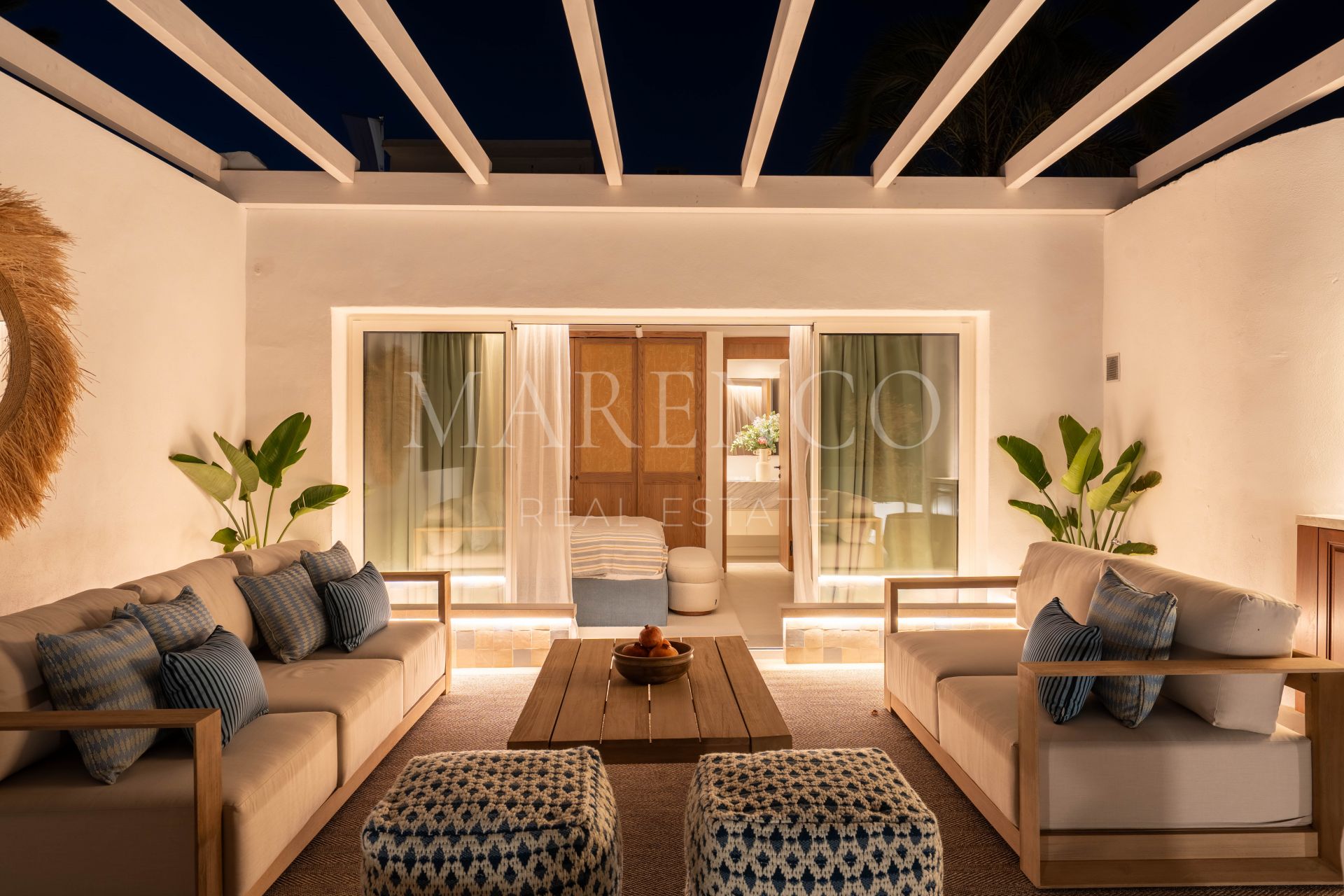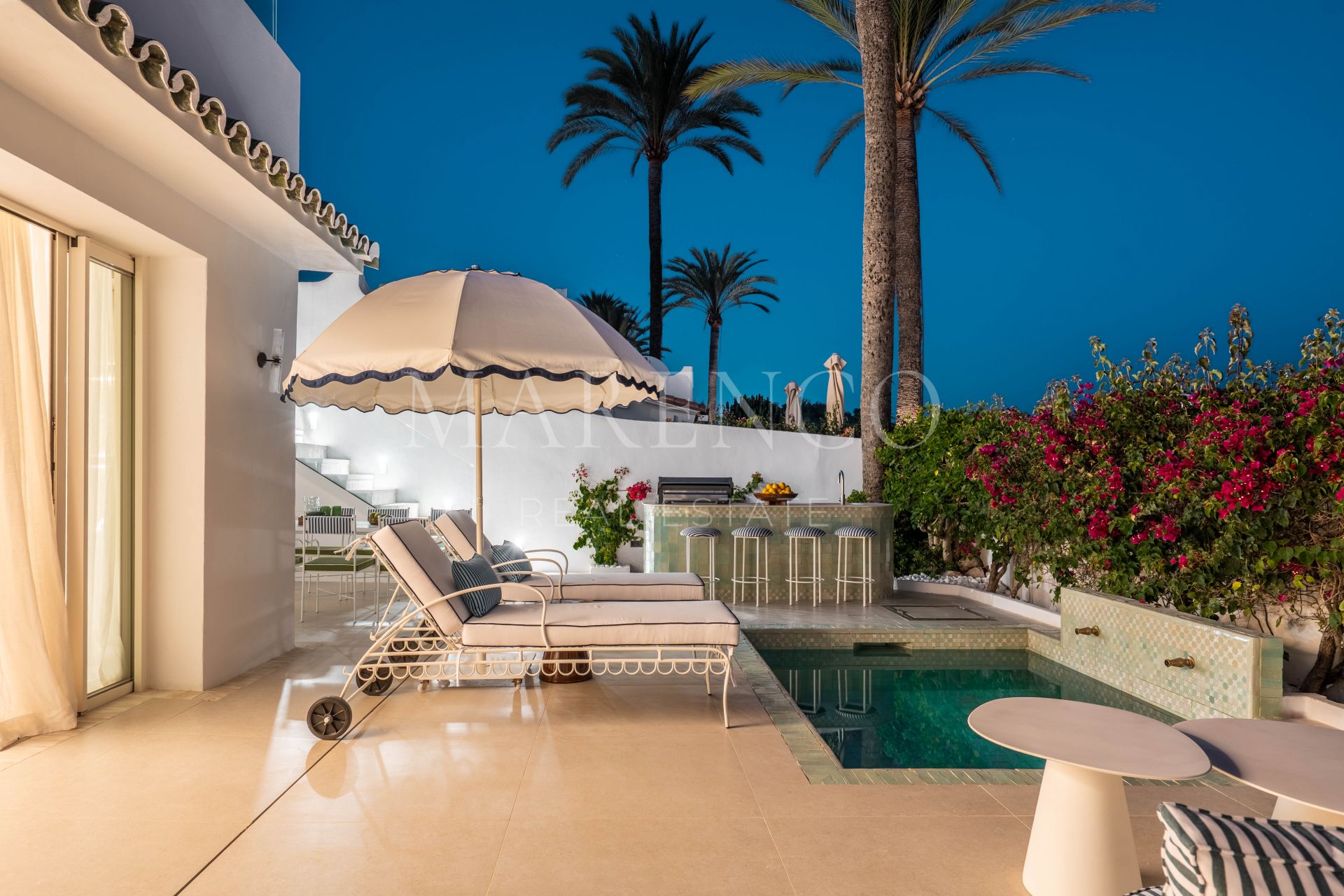 Découvrez cette impressionnante villa jumelée à Marbella Golden Mile, située à Oasis Club, l’une des communautés en bord de mer les plus exclusives et recherchées de la région. Cette propriété invite à imaginer une vie marquée par la lumière, l’intimité et la proximité de la Méditerranée, dans un cadre où chaque journée commence avec une vue dégagée sur la mer et se termine avec le confort d’avoir la promenade, Puente Romano et Marbella Club à seulement quelques pas. Sa rénovation récente, inspirée du style Marbella Club, lui confère une esthétique sereine, élégante et intemporelle.