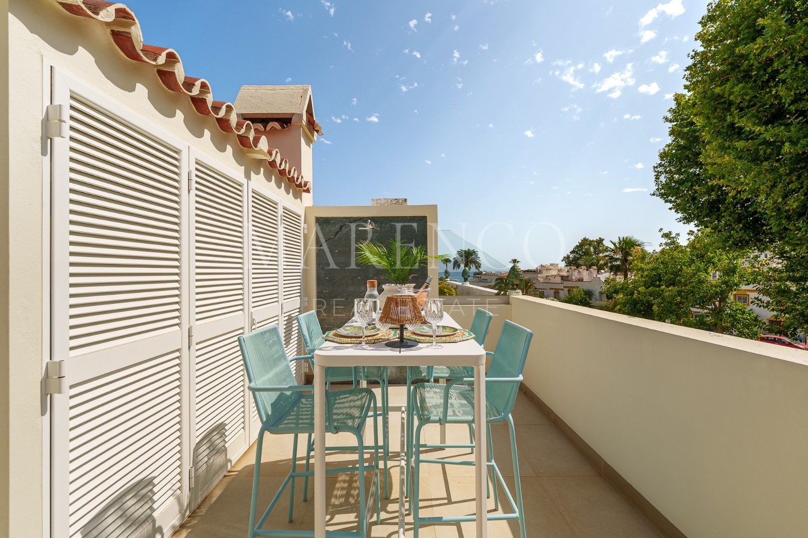 La vie en plein air se décline en trois espaces distincts : un jardin de petit-déjeuner bordé de jasmins et de bougainvilliers à l’entrée, la terrasse principale attenante au salon, et un solarium ensoleillé sur le toit avec des aperçus de la mer Méditerranée et de l’avenue bordée de palmiers en contrebas. Située côté plage et à quelques minutes de toutes les commodités de la Golden Mile, cette maison mitoyenne offre un art de vivre exceptionnel dans l’un des emplacements les plus prisés et pratiques de la côte.