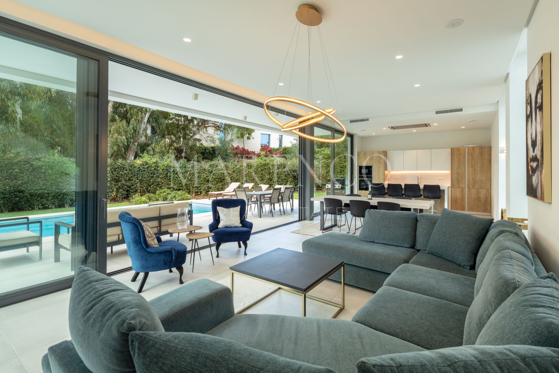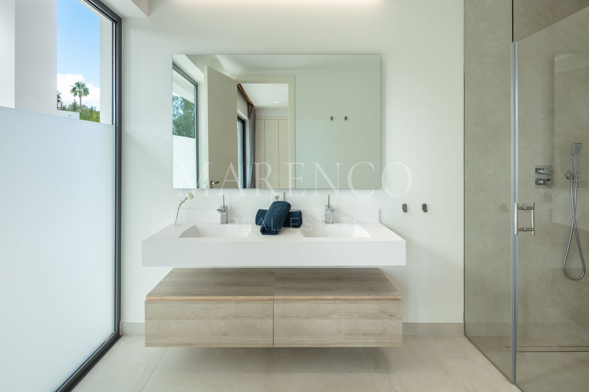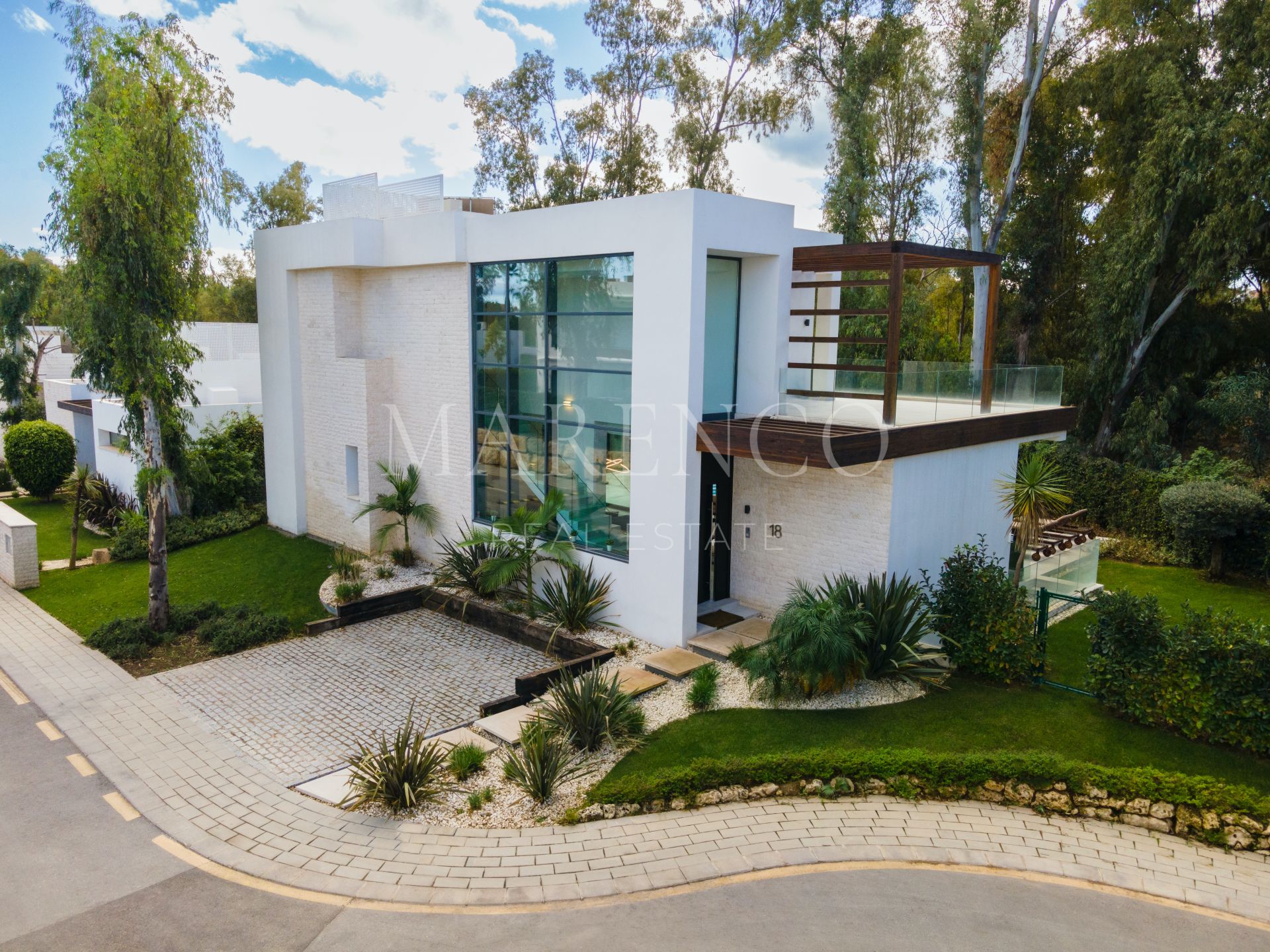 Villa à vendre à Monte Biarritz, Estepona Est avec 5 Chambres, 4 Salles de bain, 1 toilet et a piscine (privé), garage (privé) et garden (privé). Dimensions: 296m² construit, 609m² Parcelle, 296m² interior et 159m² terrasse.