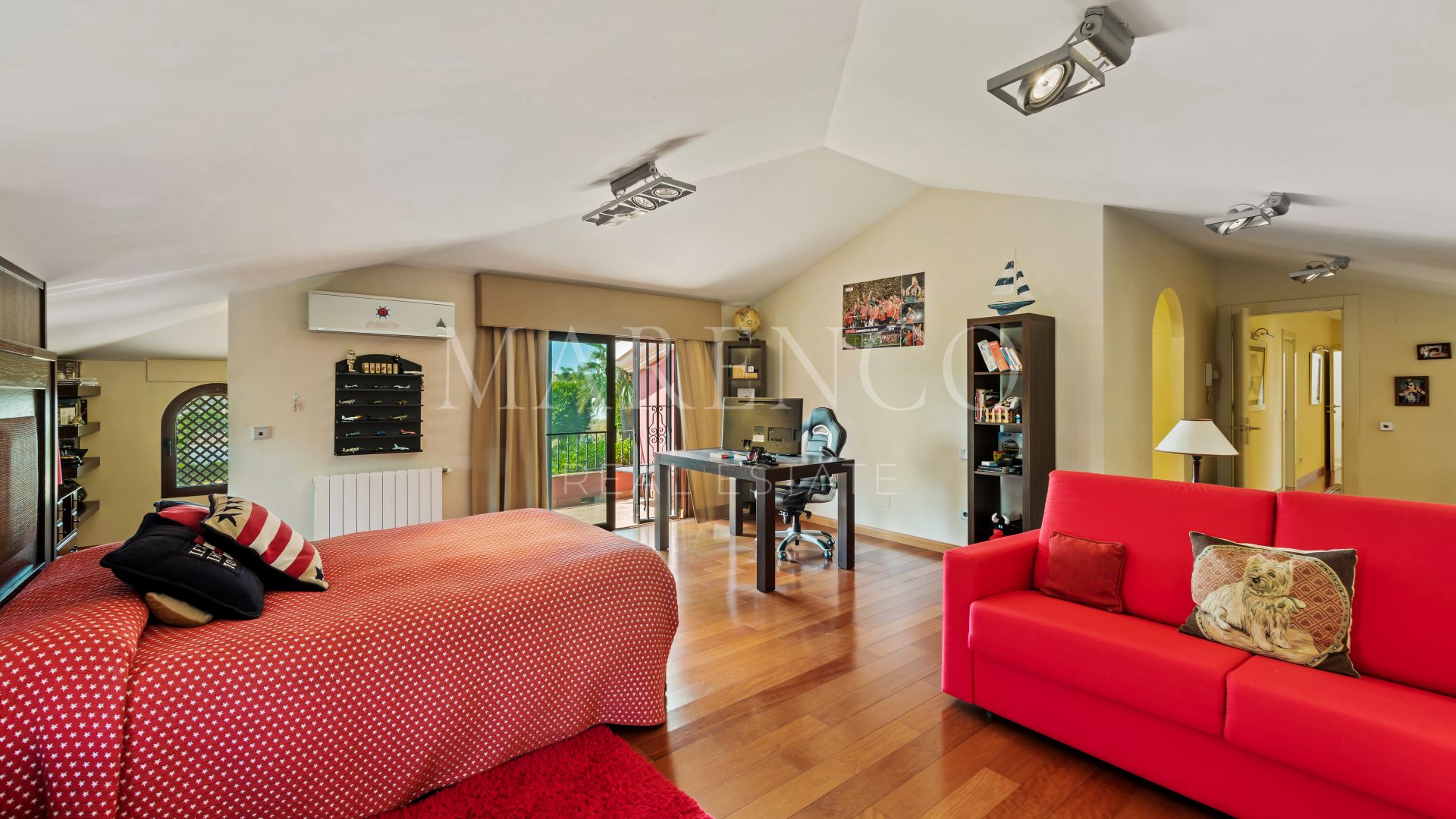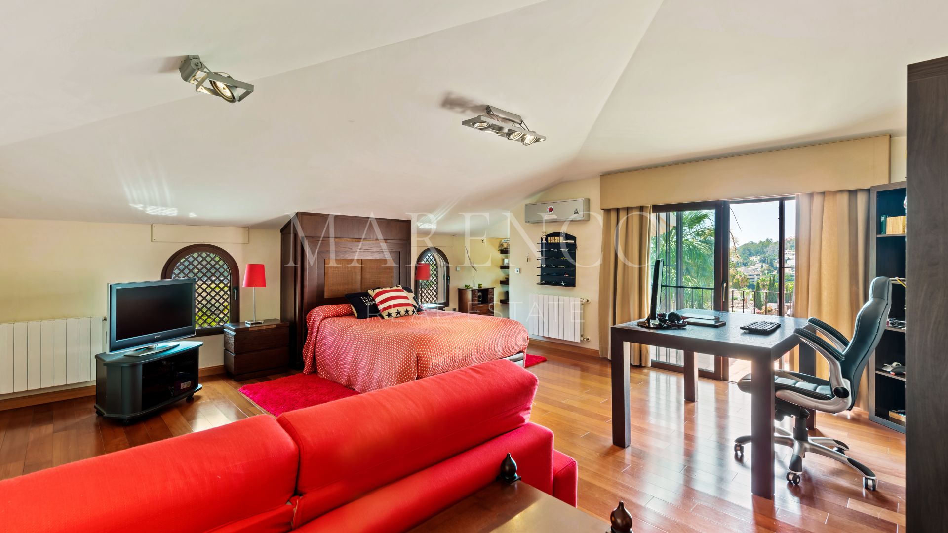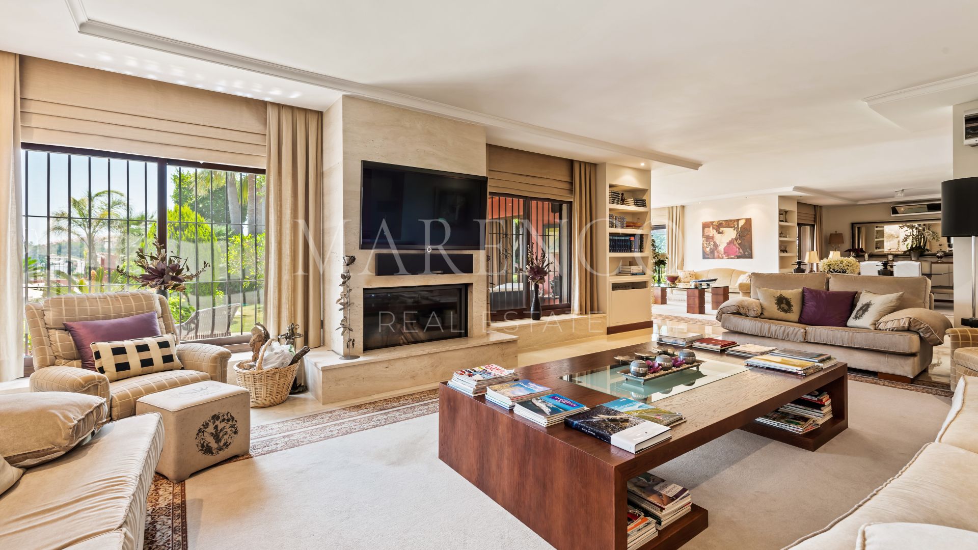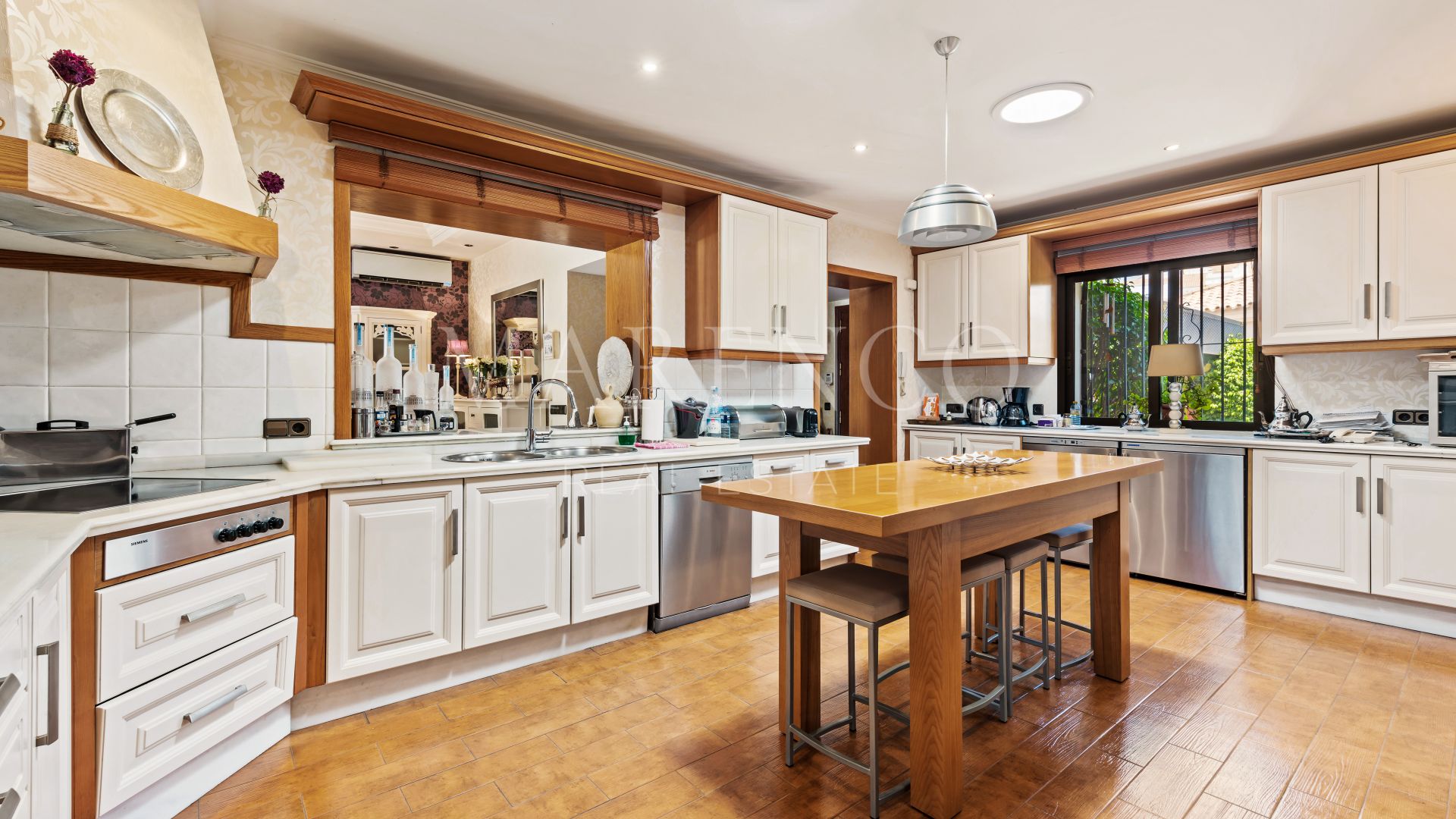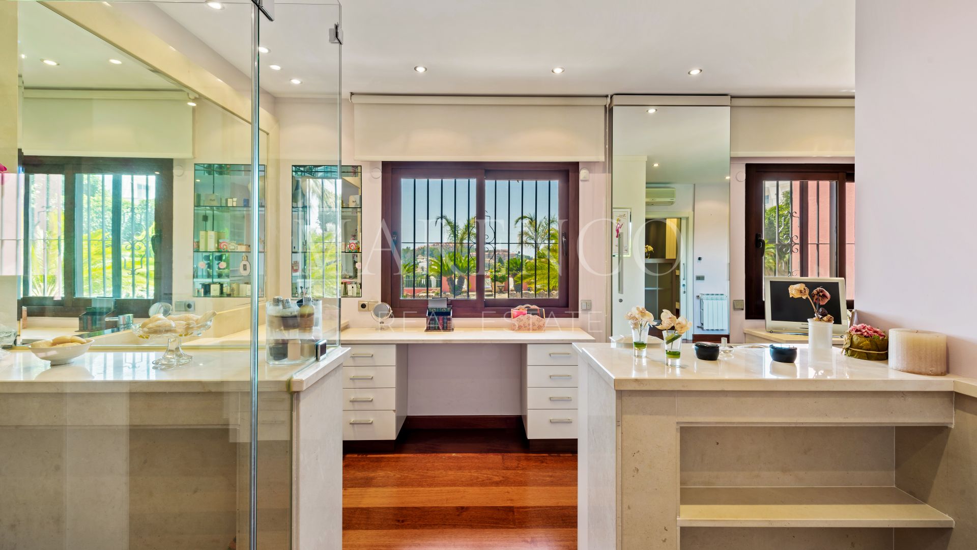La villa a été construite dans un style méditerranéen et rénovée en 2015, en conservant le style andalou à l’extérieur tout en introduisant des touches modernes et des spécifications de haute qualité à l’intérieur, telles que le marbre, le bois d’iroko ou les fenêtres Technal avec double vitrage climalit, entre autres.