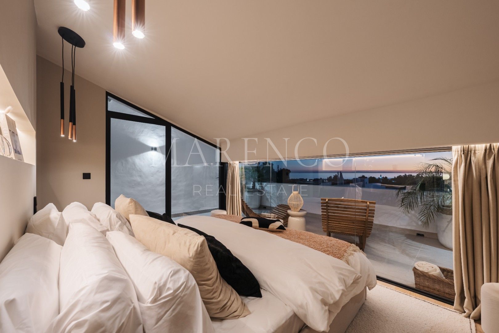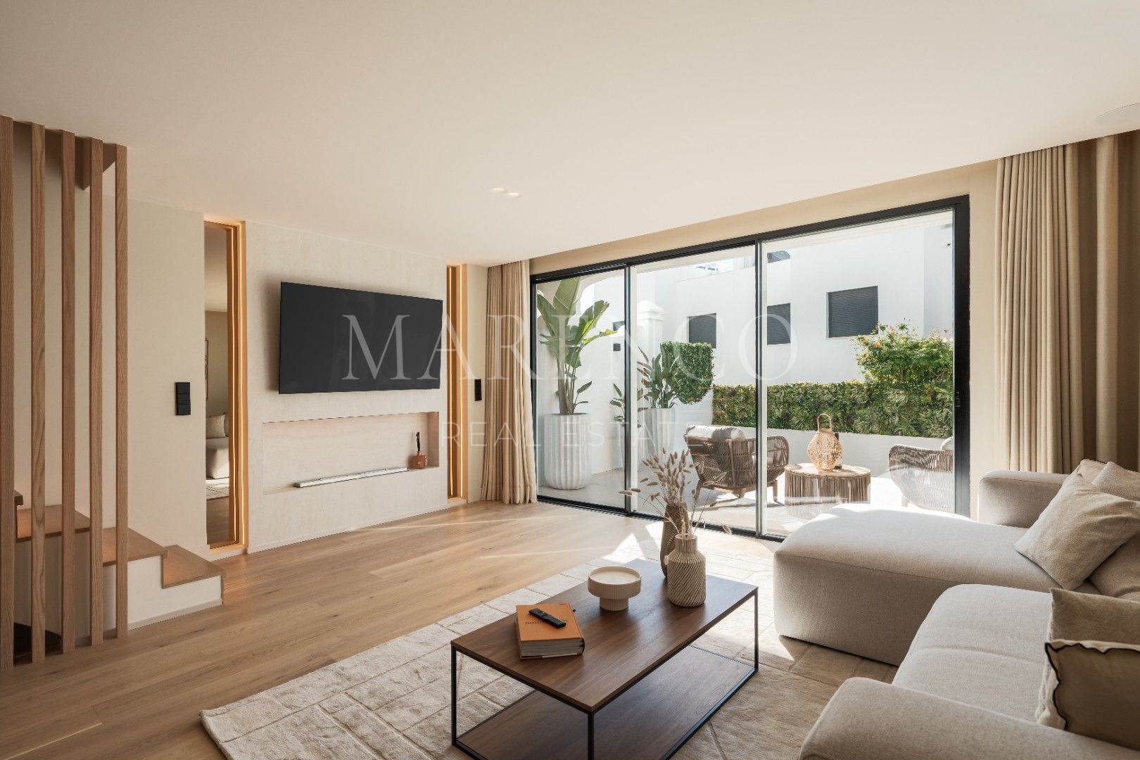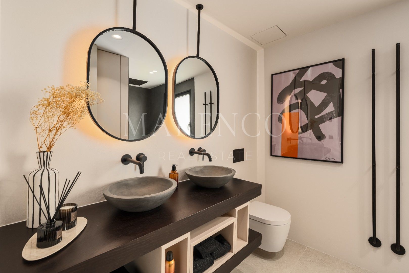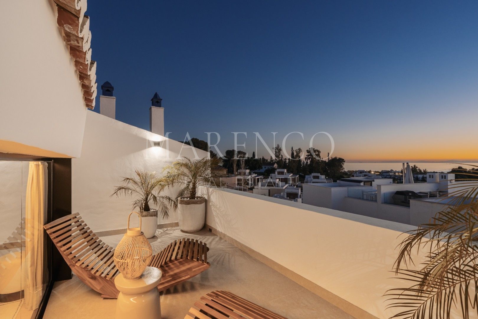 Maison Vanguard is een luxueuze, recent gerenoveerde townhouse in Altos de Puente Romano, waar eigentijds design en exclusiviteit naadloos samenkomen. Met een bebouwde oppervlakte van 352 m² beschikt het over vier ruime slaapkamers en vier en een halve badkamers, waaronder een prachtige master suite met een inloopkast, een luxe badkamer en een privéterras met adembenemend uitzicht op de Middellandse Zee.