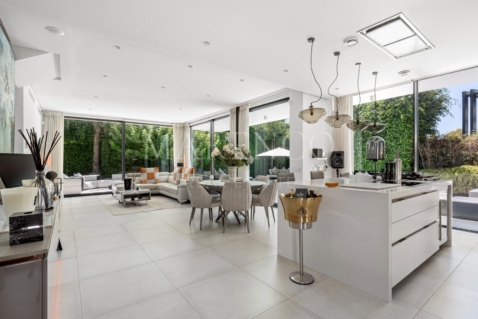 De villa beschikt over 250 m² verdeeld over drie verdiepingen, met een terras van 93 m² dat het buitenleven versterkt. De begane grond omvat een lichte open woonkamer, eetgedeelte en keuken met hoogwaardige NEFF-apparatuur, met directe toegang tot het terras en het verwarmde zoutwaterzwembad. In totaal zijn er 4 slaapkamers en 5 badkamers, waaronder een hoofdsuite met eigen badkamer en privéterras, plus twee extra en-suites met gedeelde toegang tot een tweede terras.