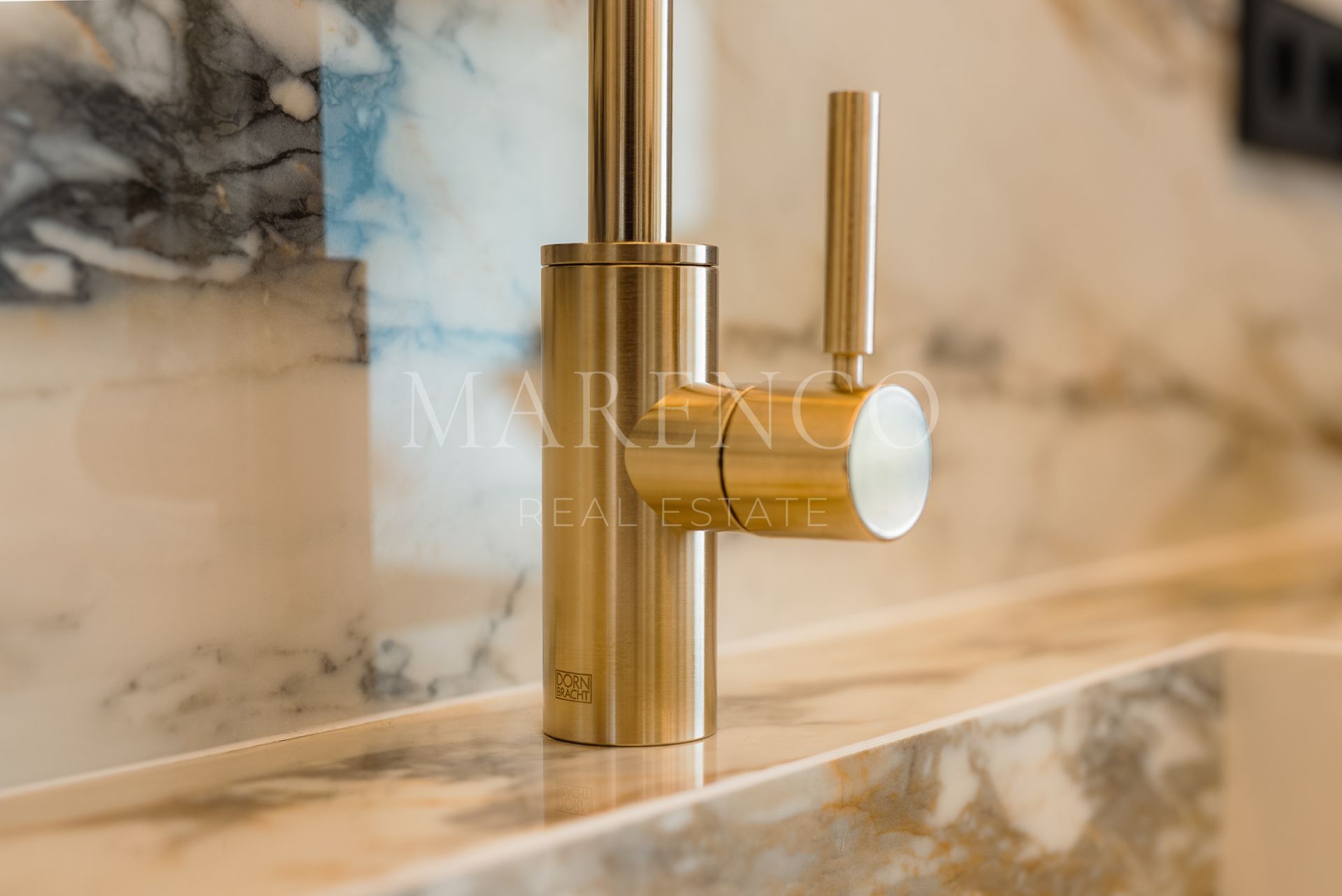 Deze exclusieve woning op de Golden Mile van Marbella onderscheidt zich ook door het maatwerk in het schrijnwerk, ontworpen in harmonie met de gebogen architectonische lijnen van het gebouw, en door het Jung domoticasysteem, dat technologie en comfort op een discrete manier toevoegt. Het resultaat is een stijlvolle en volledig eigentijdse residentie waar natuurlijke materialen en zachte tinten zorgen voor een tijdloze en uitnodigende sfeer.