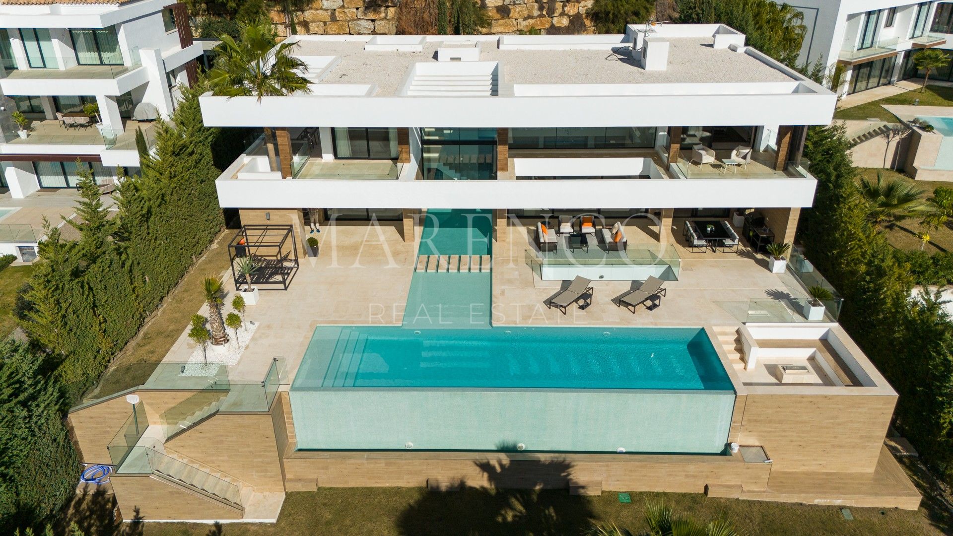 Buiten geniet u van een exclusief zwembad met een prachtig design en een stijlvolle zithoek, evenals een groot terras, perfect om te ontspannen en te genieten van het mediterrane klimaat.