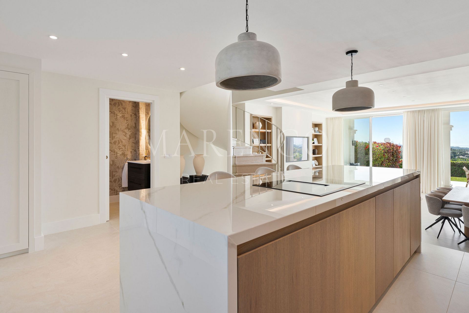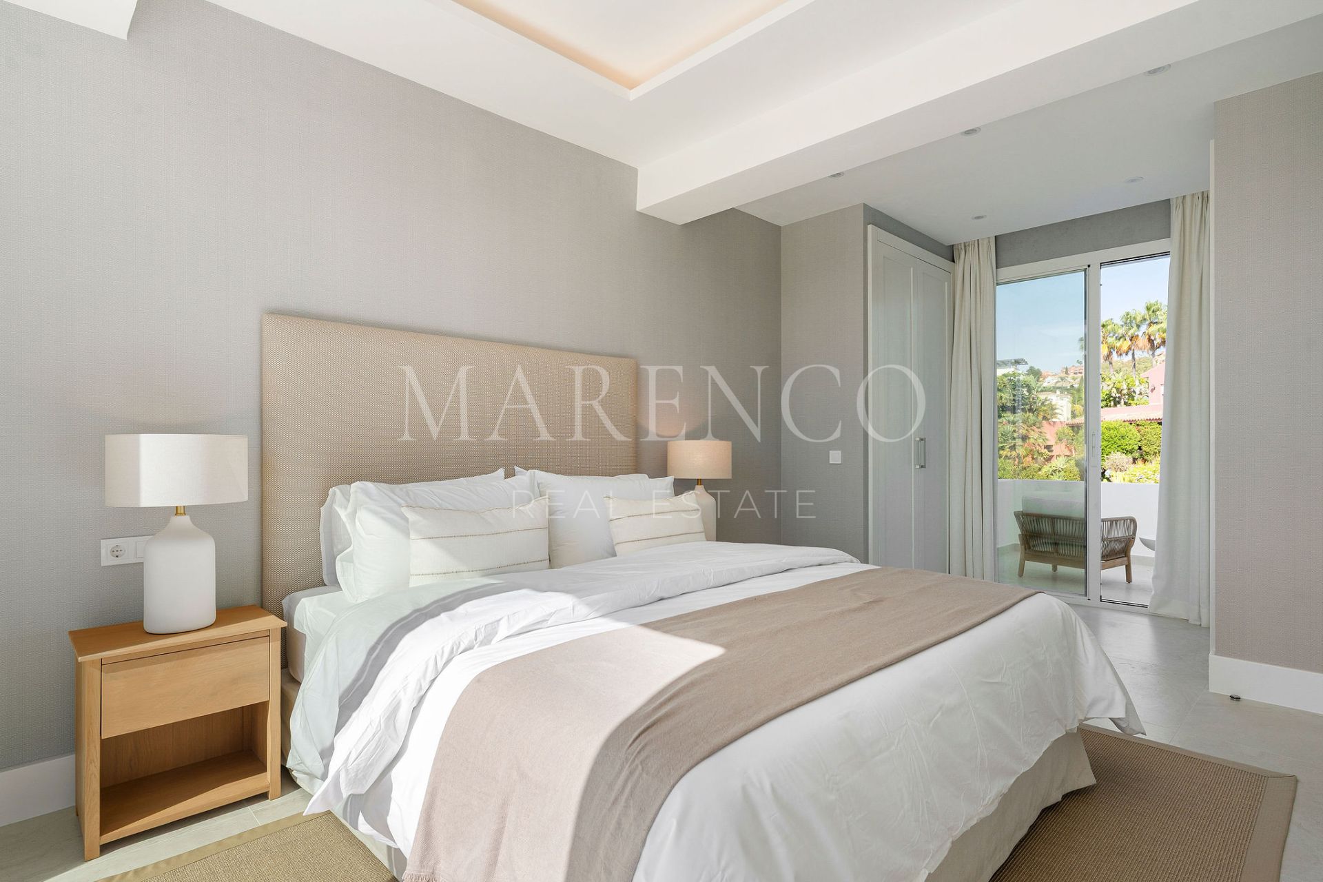 Met een bebouwde oppervlakte van 263 m² is deze volledig gerenoveerde woning verdeeld over drie niveaus en beschikt zij over 4 slaapkamers en 4 badkamers. De hoofdverdieping valt op door de ruime open indeling met woonkamer, eetkamer en volledig uitgeruste designkeuken, met hoge plafonds en grote ramen die direct aansluiten op een zonnig overdekt terras. Op de bovenverdiepingen bieden de slaapkamers privacy en veel ruimte, waaronder een elegante master suite met inloopkast, complete badkamer en privéterras met open zeezicht.