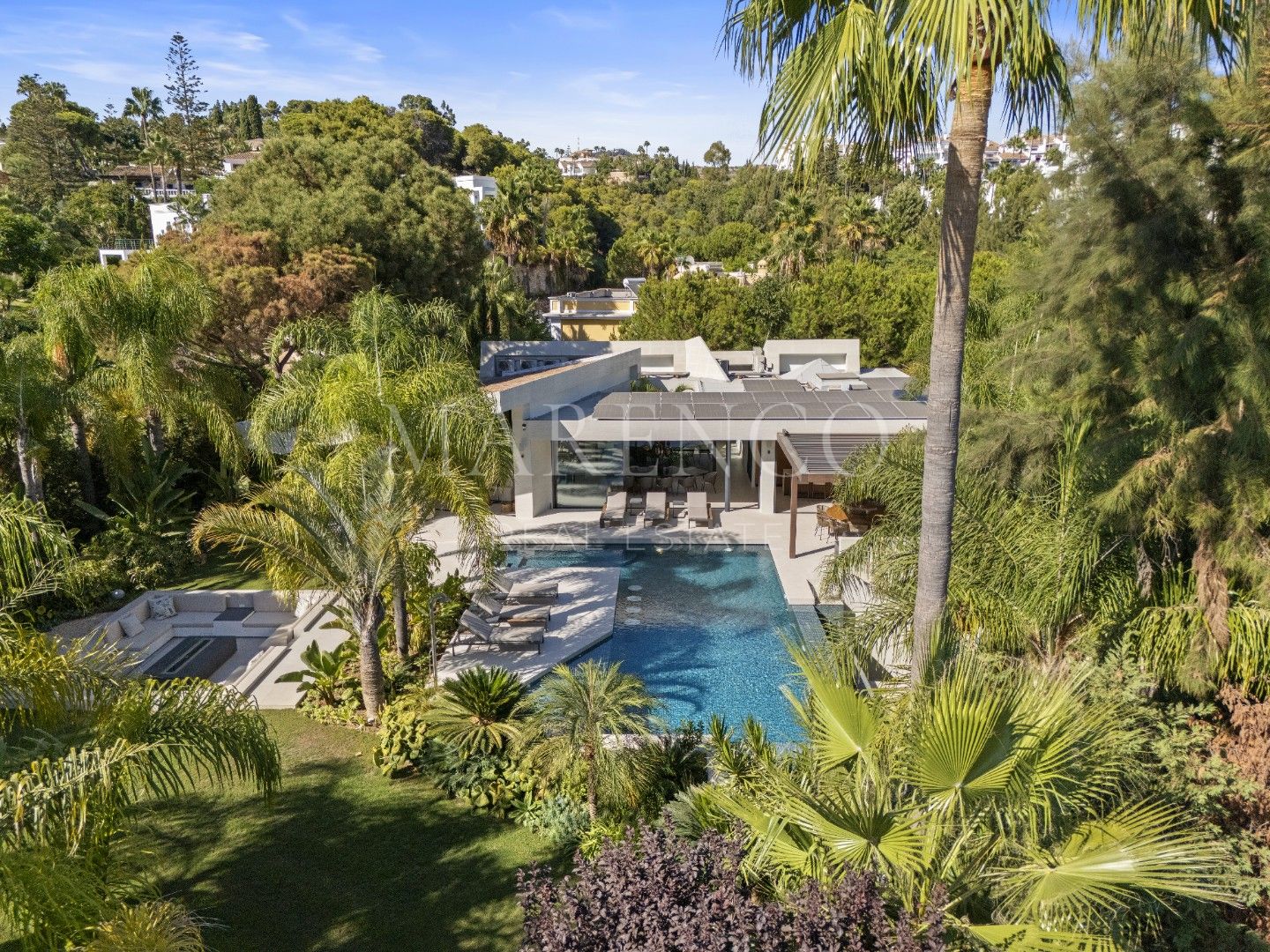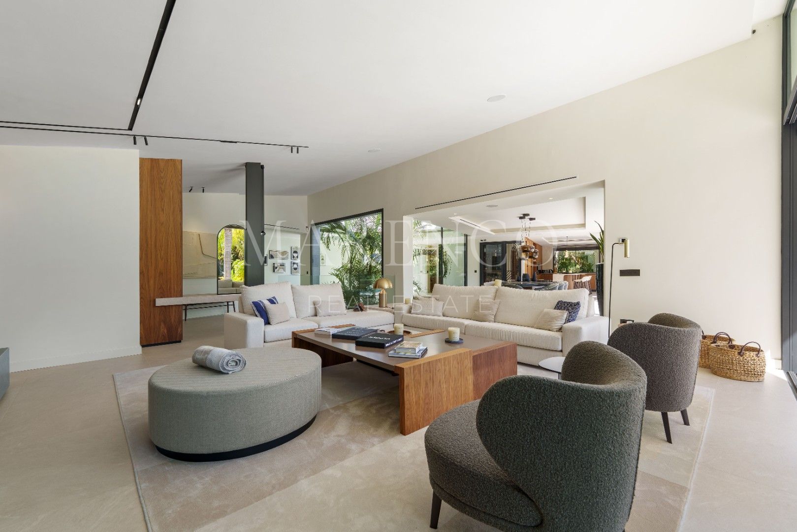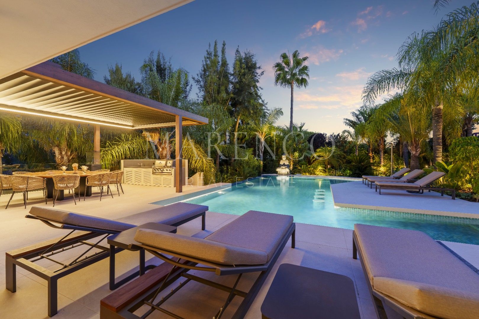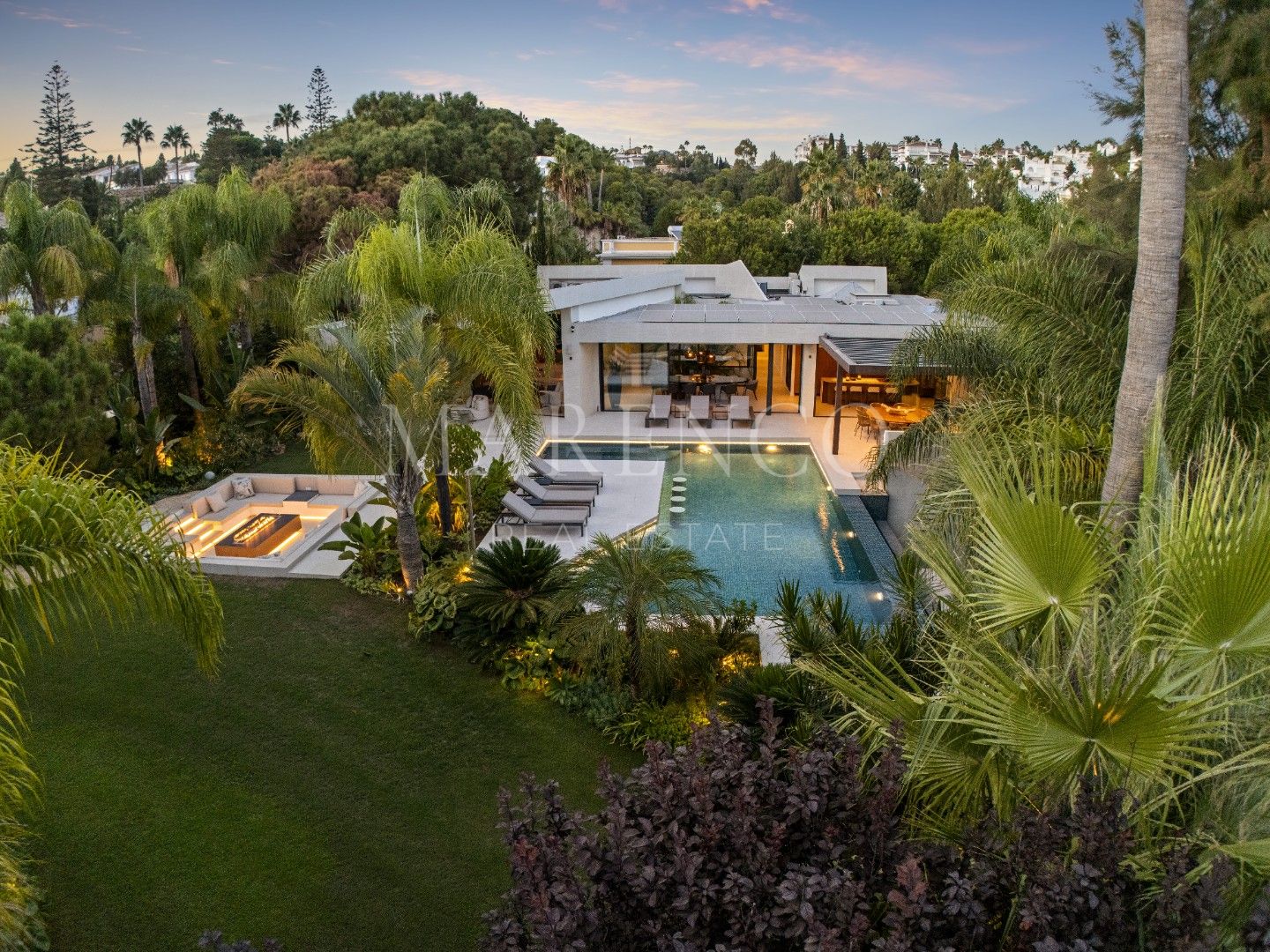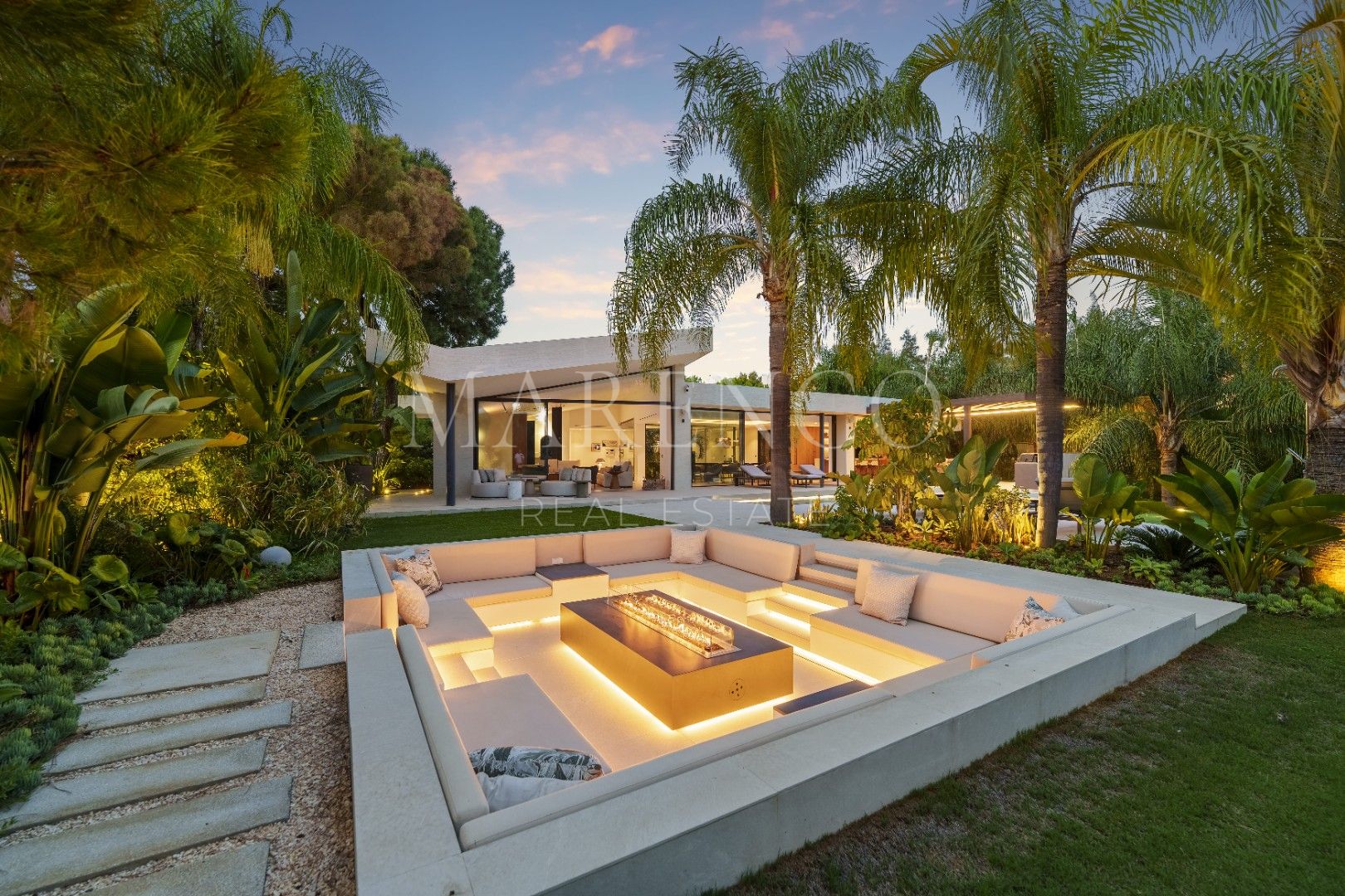 Het exterieur van Las Chapas 5 valt op door de volwassen palmbomen, die verschillende ontspanningsruimtes en een centraal zwembad omringen, dat wordt omgeven door stenen en ligstoelen. Daarnaast beschikt de villa over een overdekte eetterras en een buitenlounge met een verlaagde vuurplaats, die zowel overdag als ‘s avonds een uitnodigende sfeer creëren. Het ontwerp van de villa zorgt voor privacy en maximaliseert tegelijkertijd het genieten van het klimaat van Marbella.